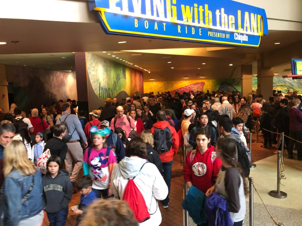 Living with the Land had a 50 minute wait. The FastPass line wrapped around the seating area and looped back all the way to the registers at Sunshine Seasons. The holiday overlay for Living with the Land is amazing, but we’ll have to pass on this one today. Even with a FastPass, we didn’t want to wait that long.