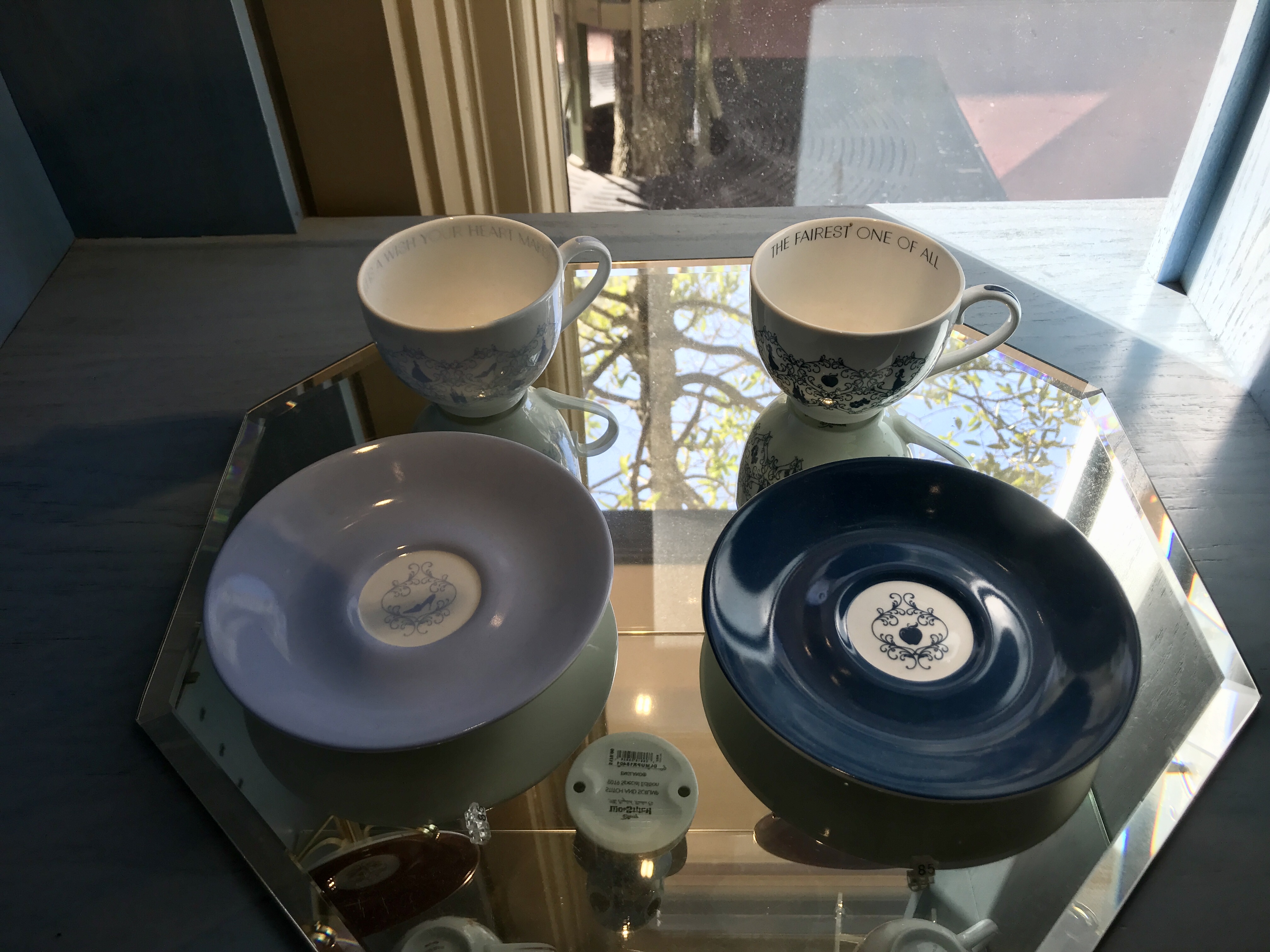 The saucers have an object representative of each princess in the middle and a quote from each film lines the teacup’s inner rim. Each set (cup and saucer) is $85.00.