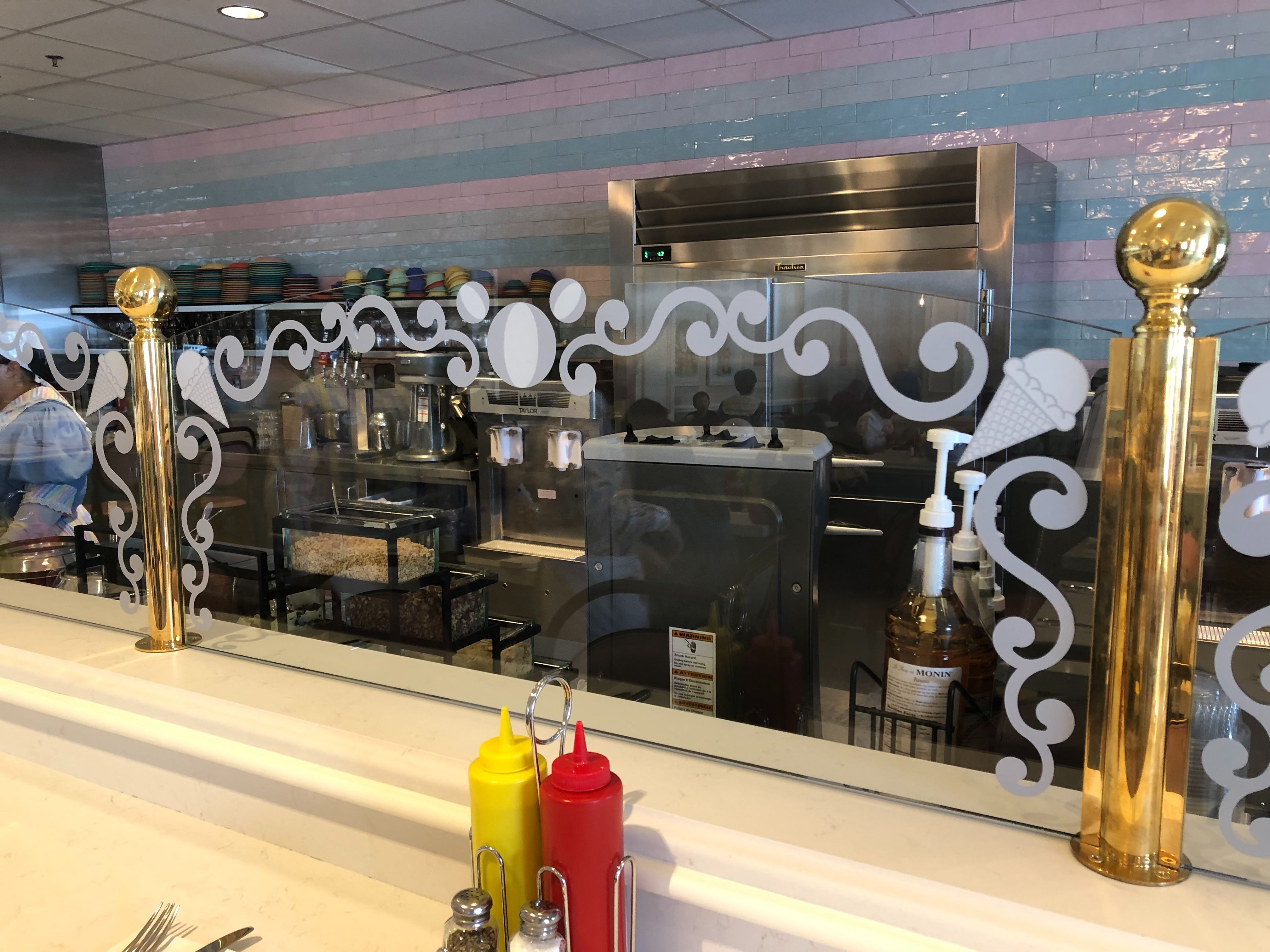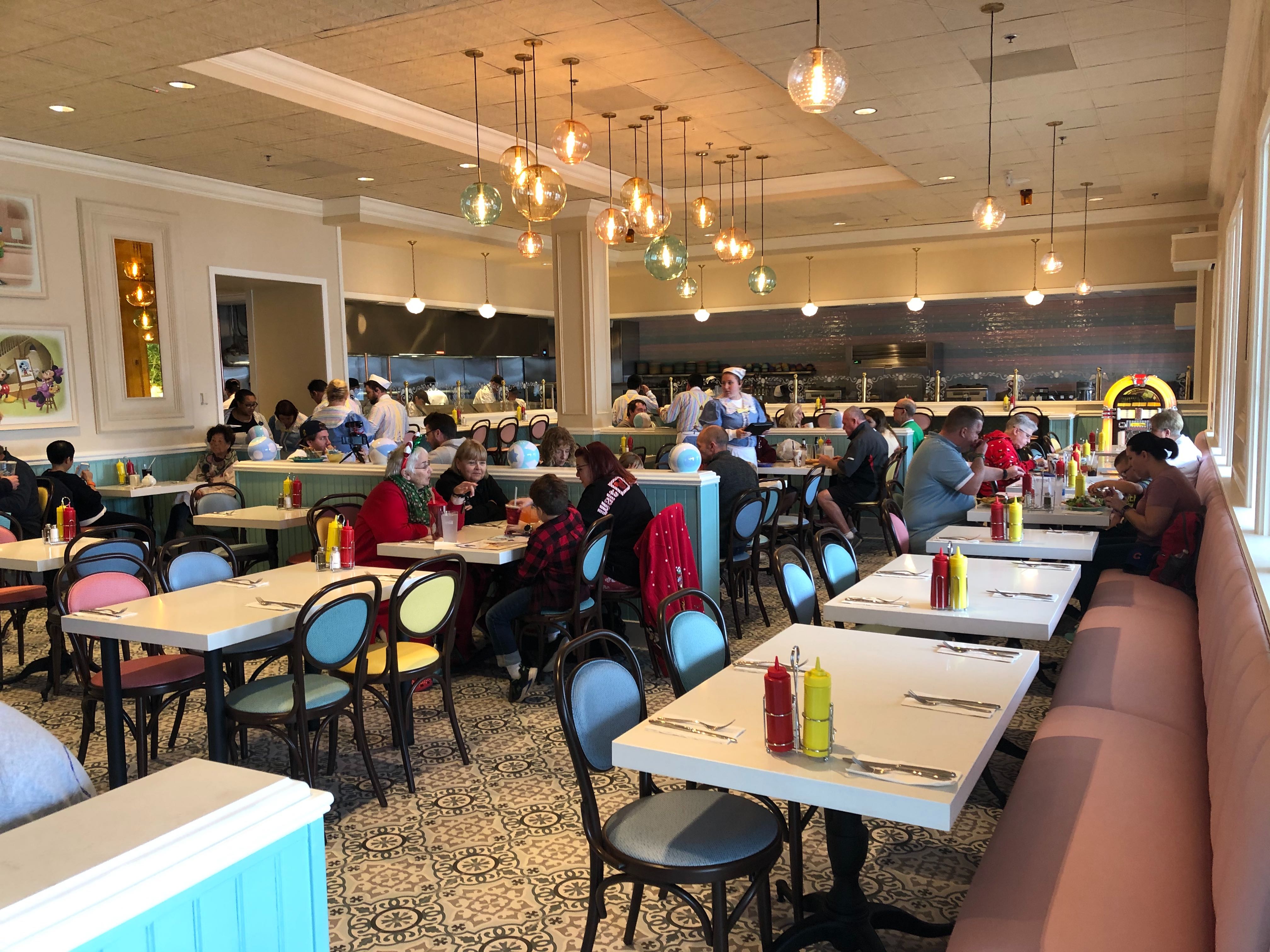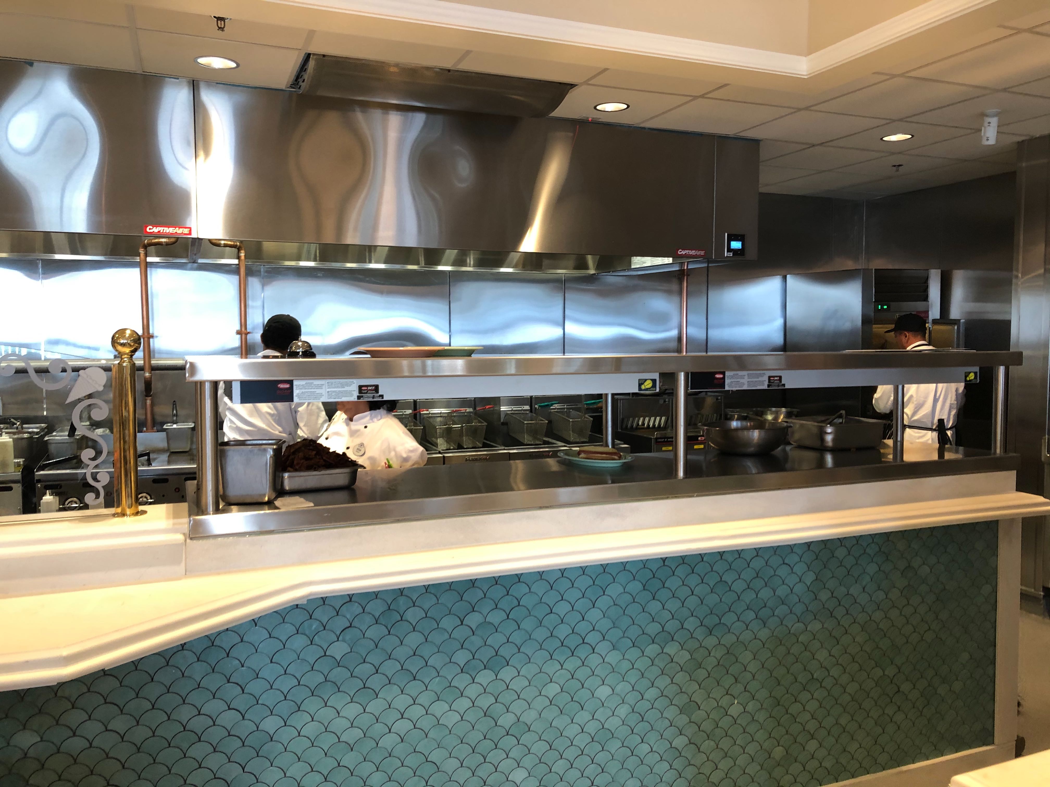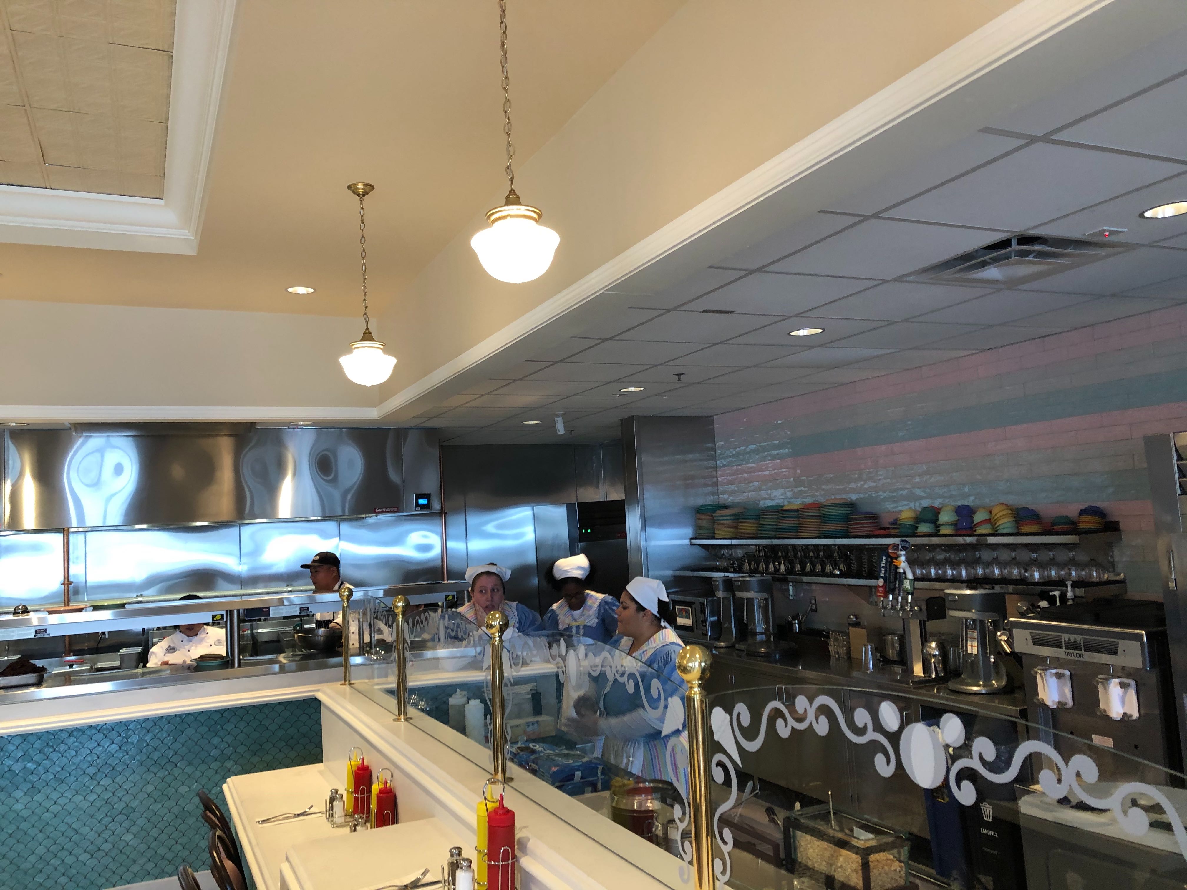 The expo kitchen has also made a return, and you can watch the cooks here pile ice cream high and sear patties to perfection from the themed windows lining the counters. There are even charging ports under the counters!