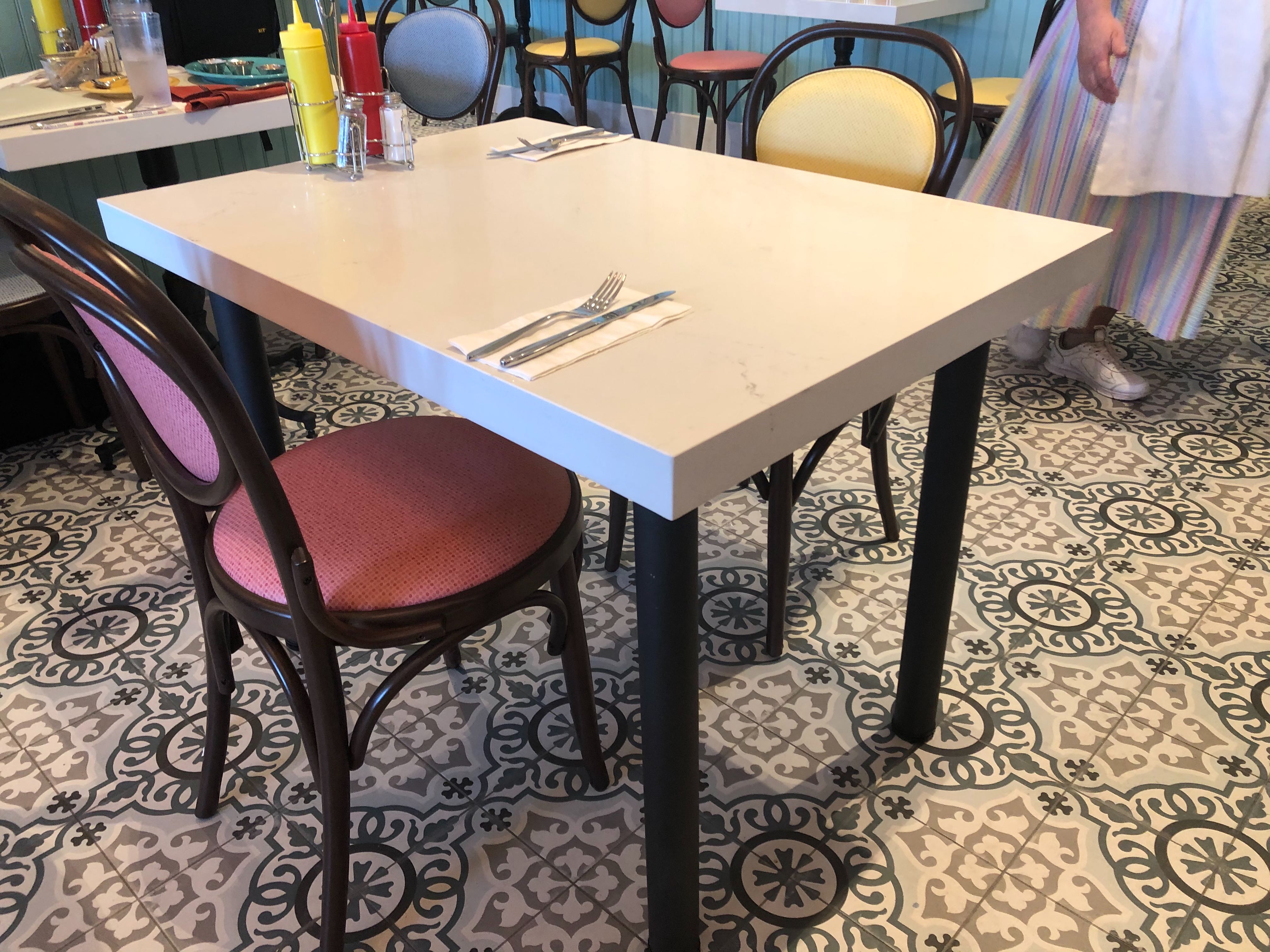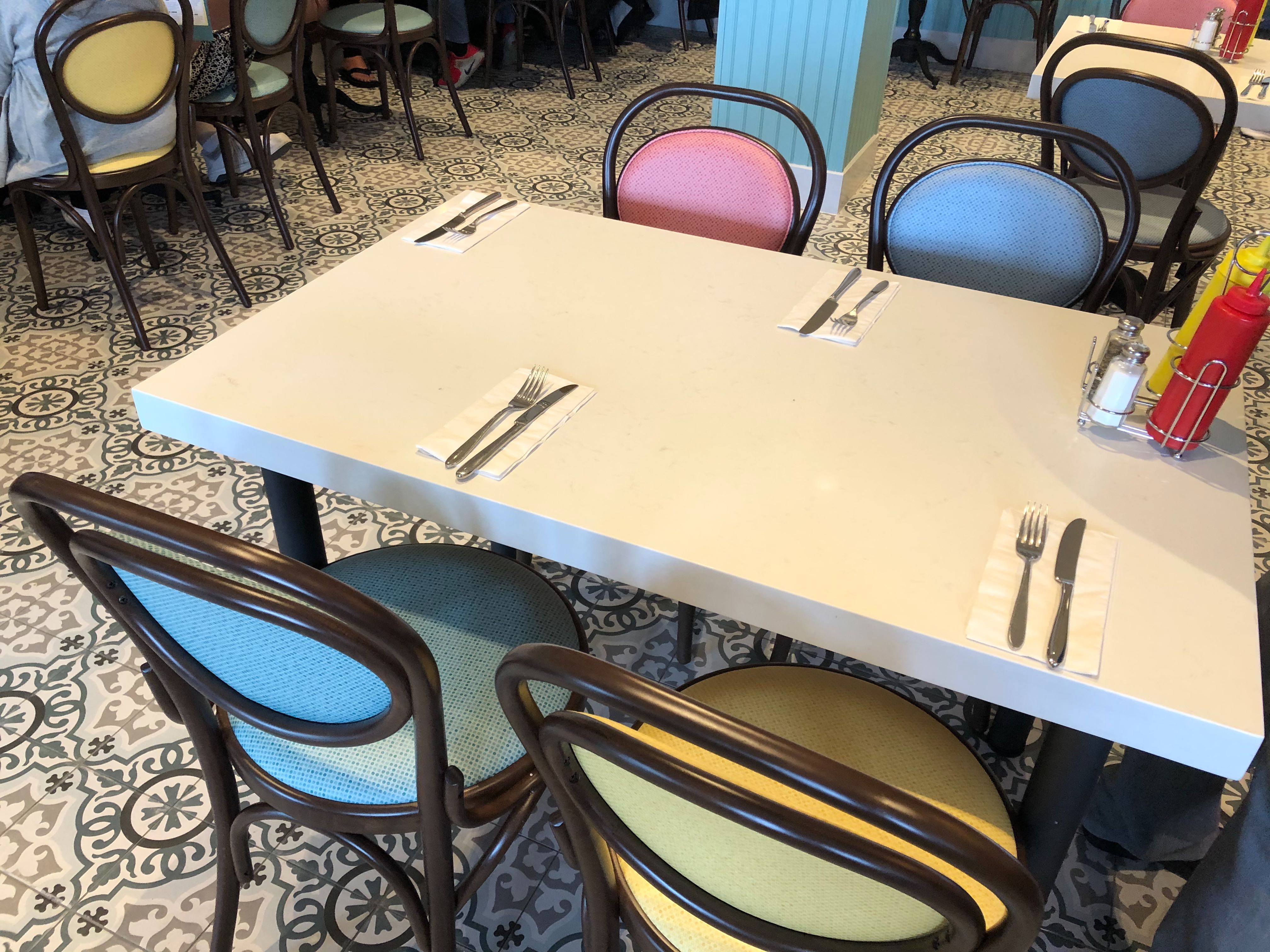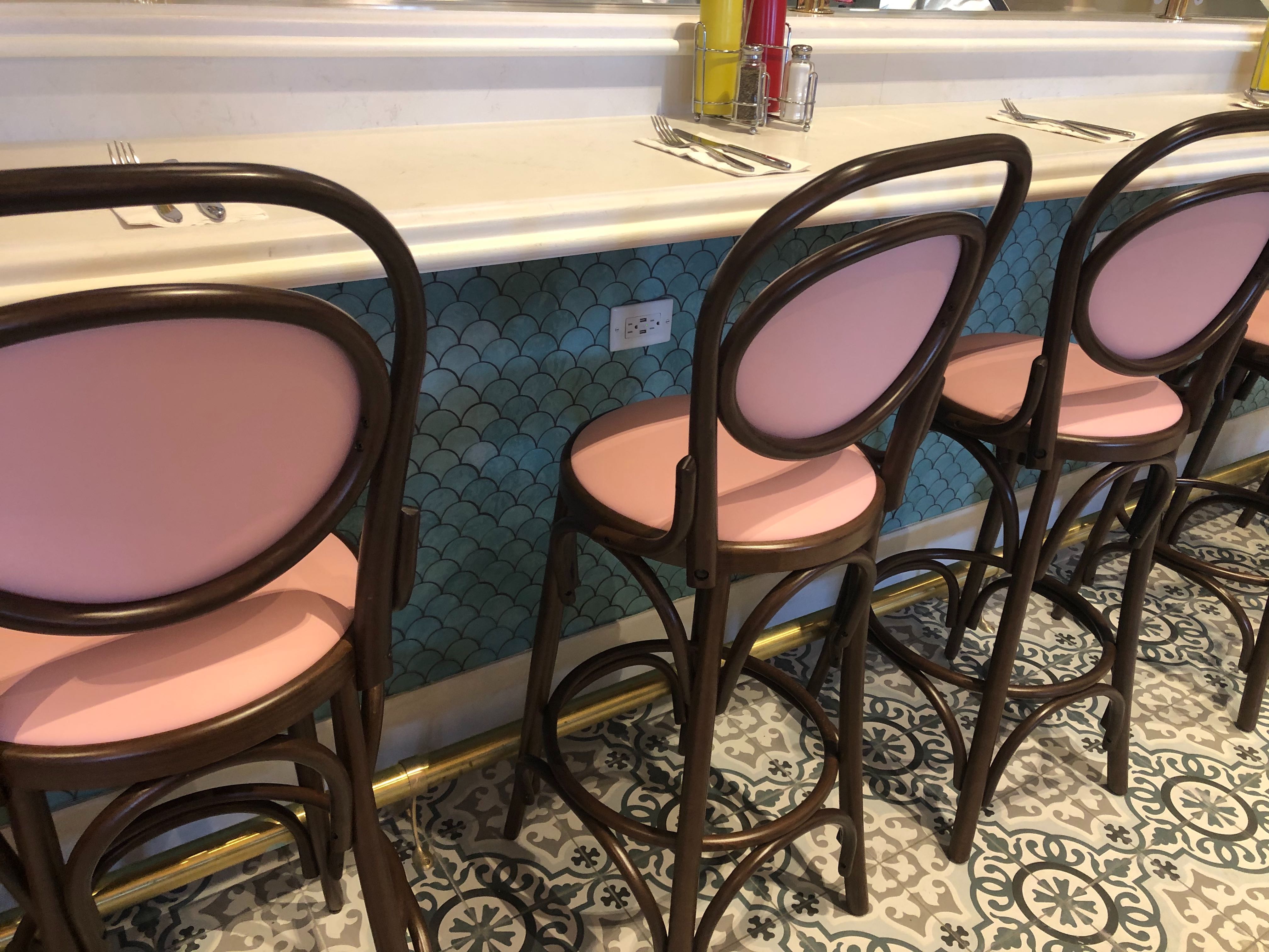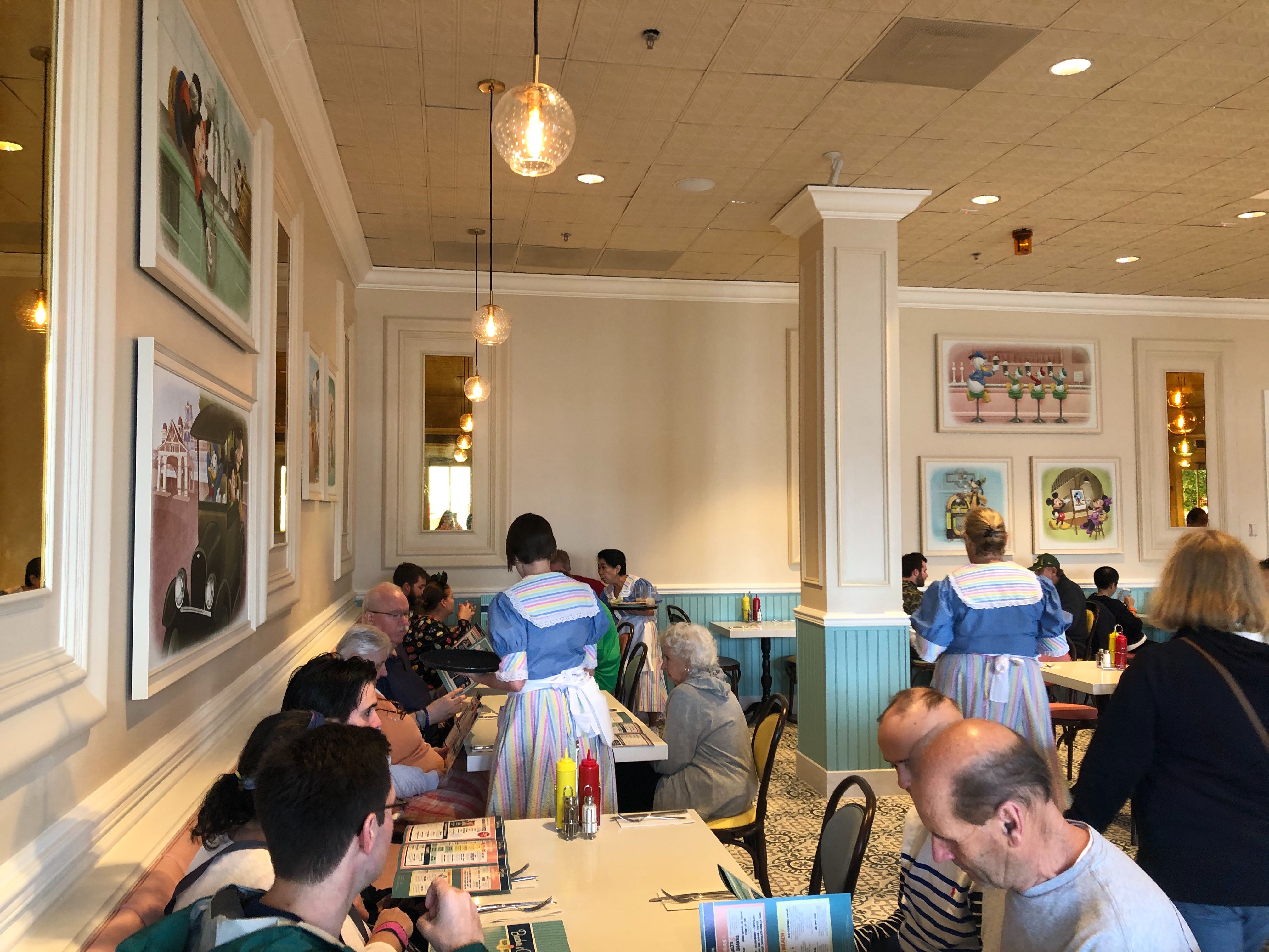 The expo kitchen has also made a return, and you can watch the cooks here pile ice cream high and sear patties to perfection from the themed windows lining the counters. There are even charging ports under the counters!