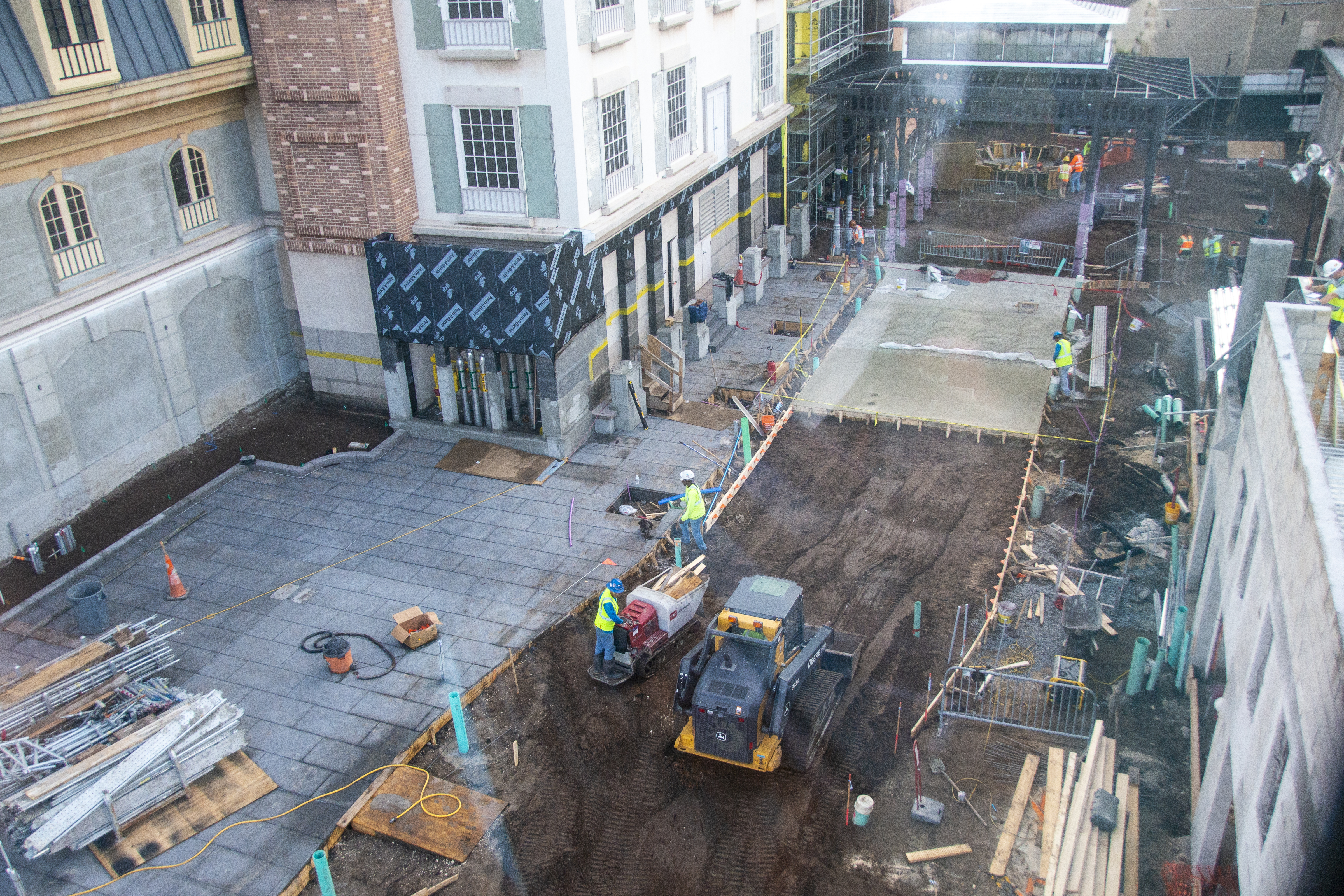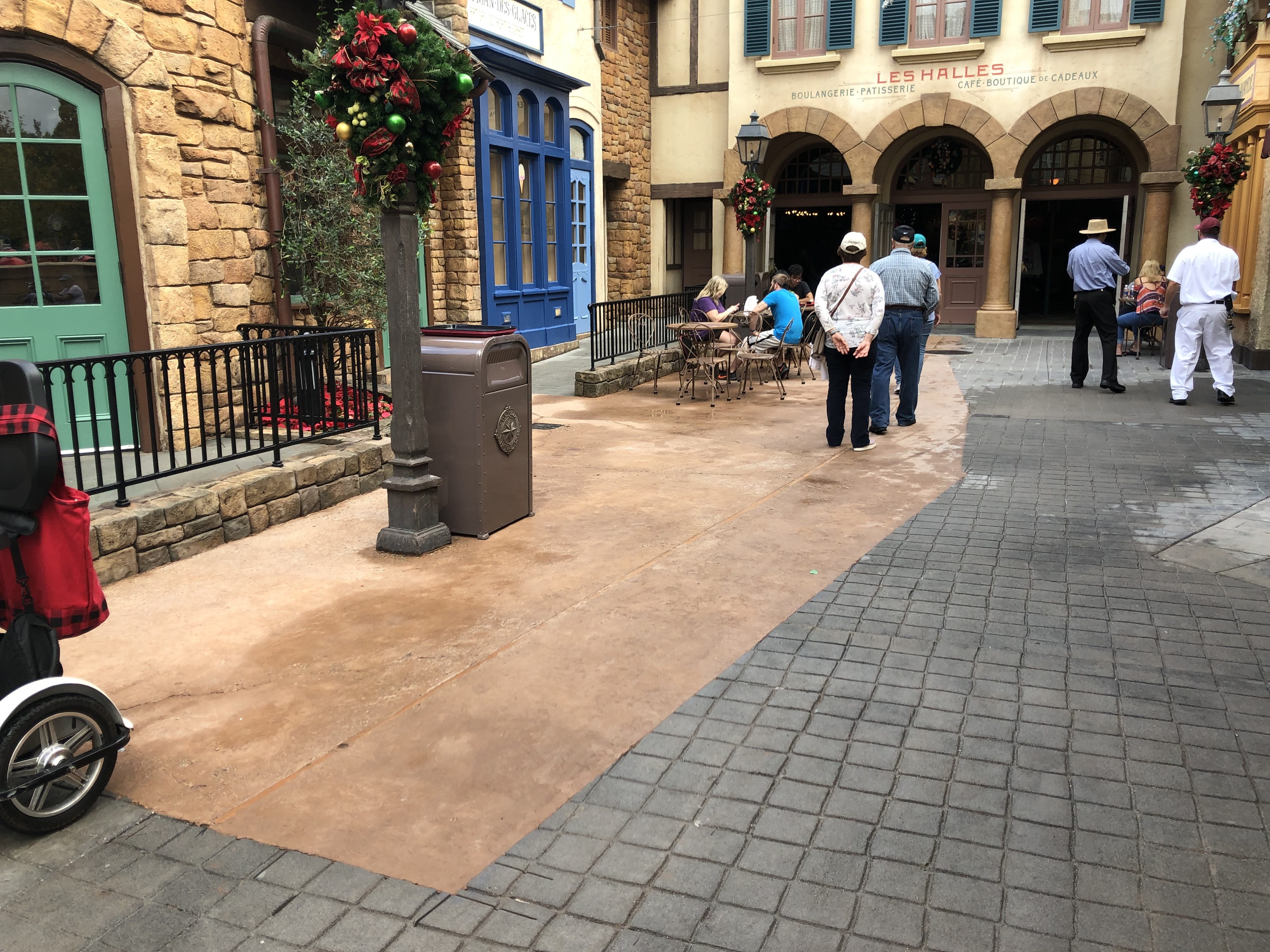 Over in front of Les Halles Boulangerie & Patisserie, the roped off area that was repaved where cobblestones had been removed was completely open to guests today. It had previously been partially or fully roped off in various stages this week.