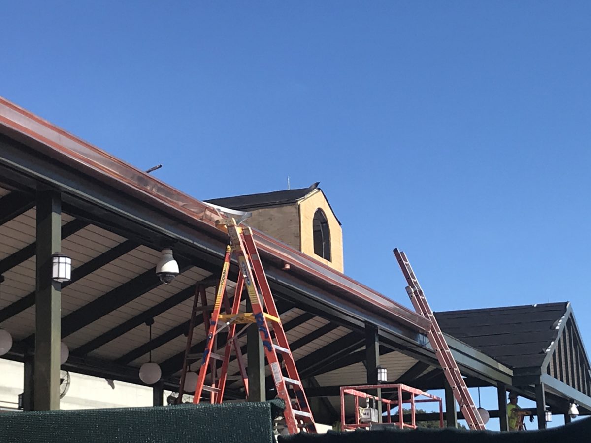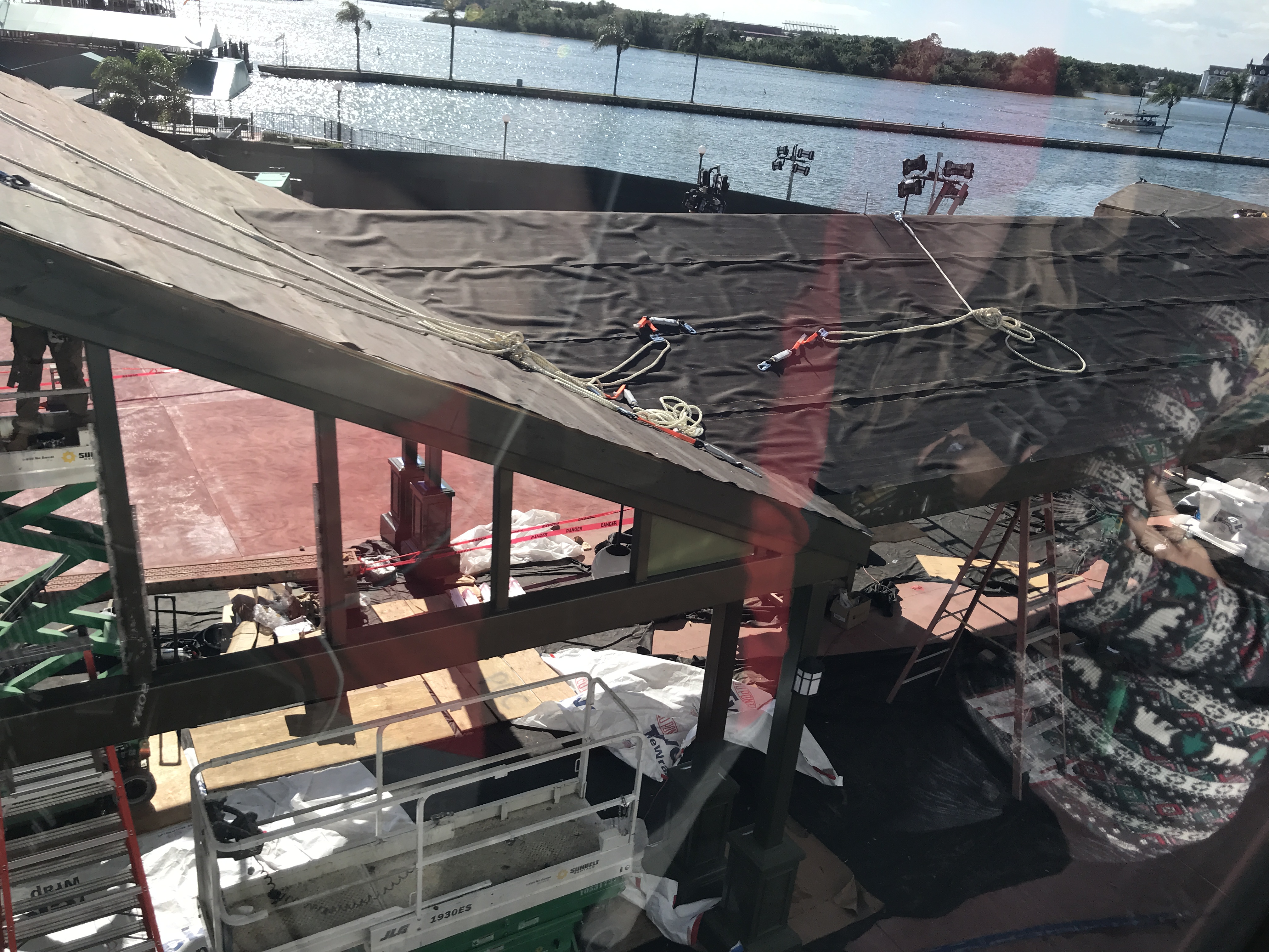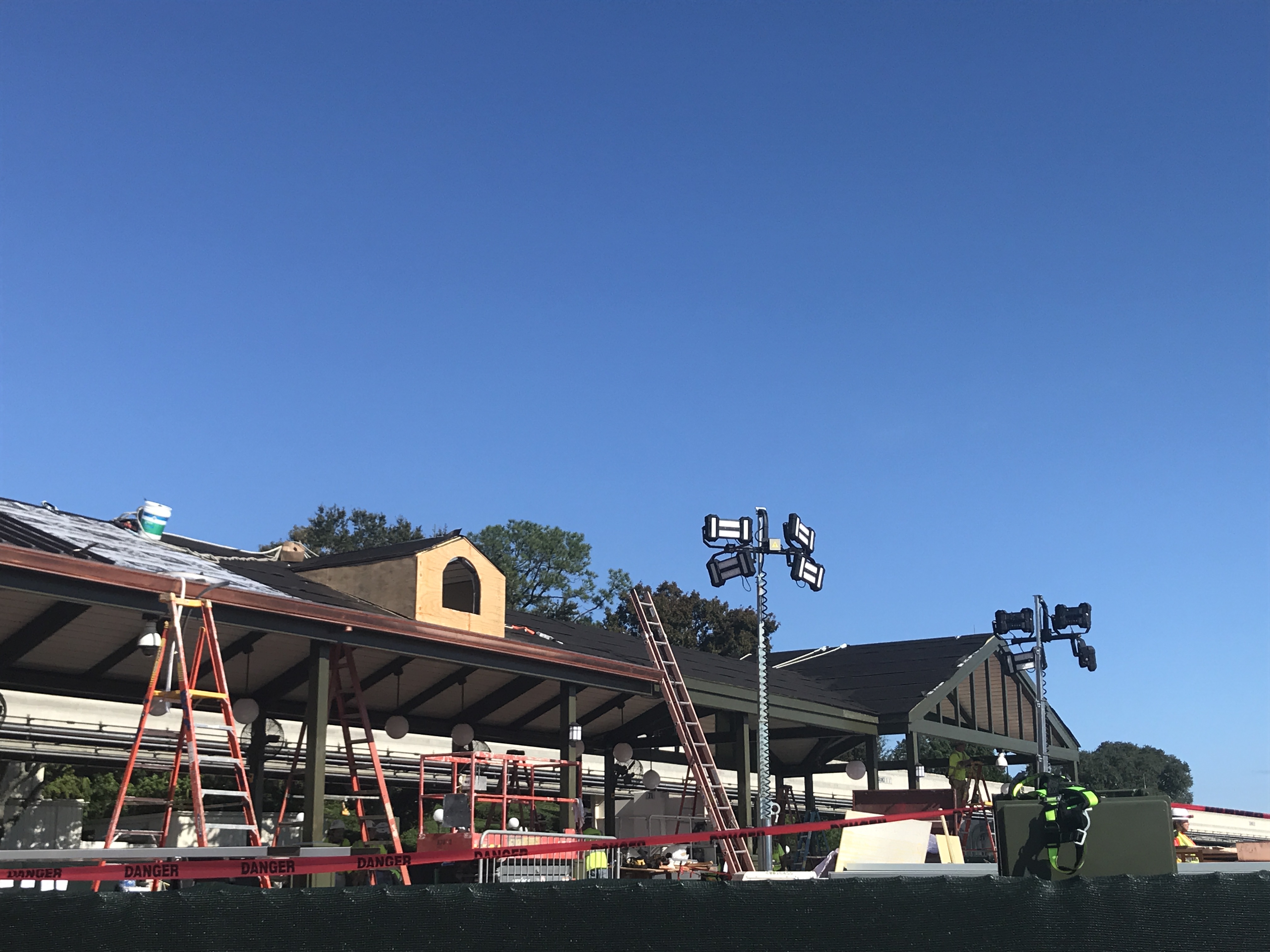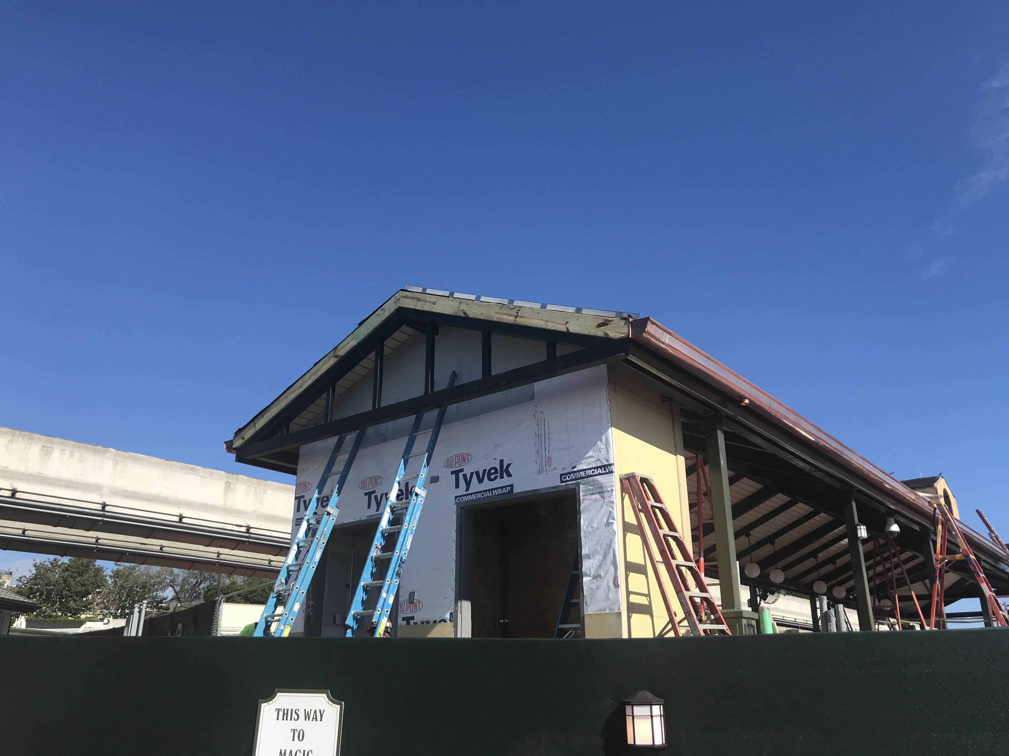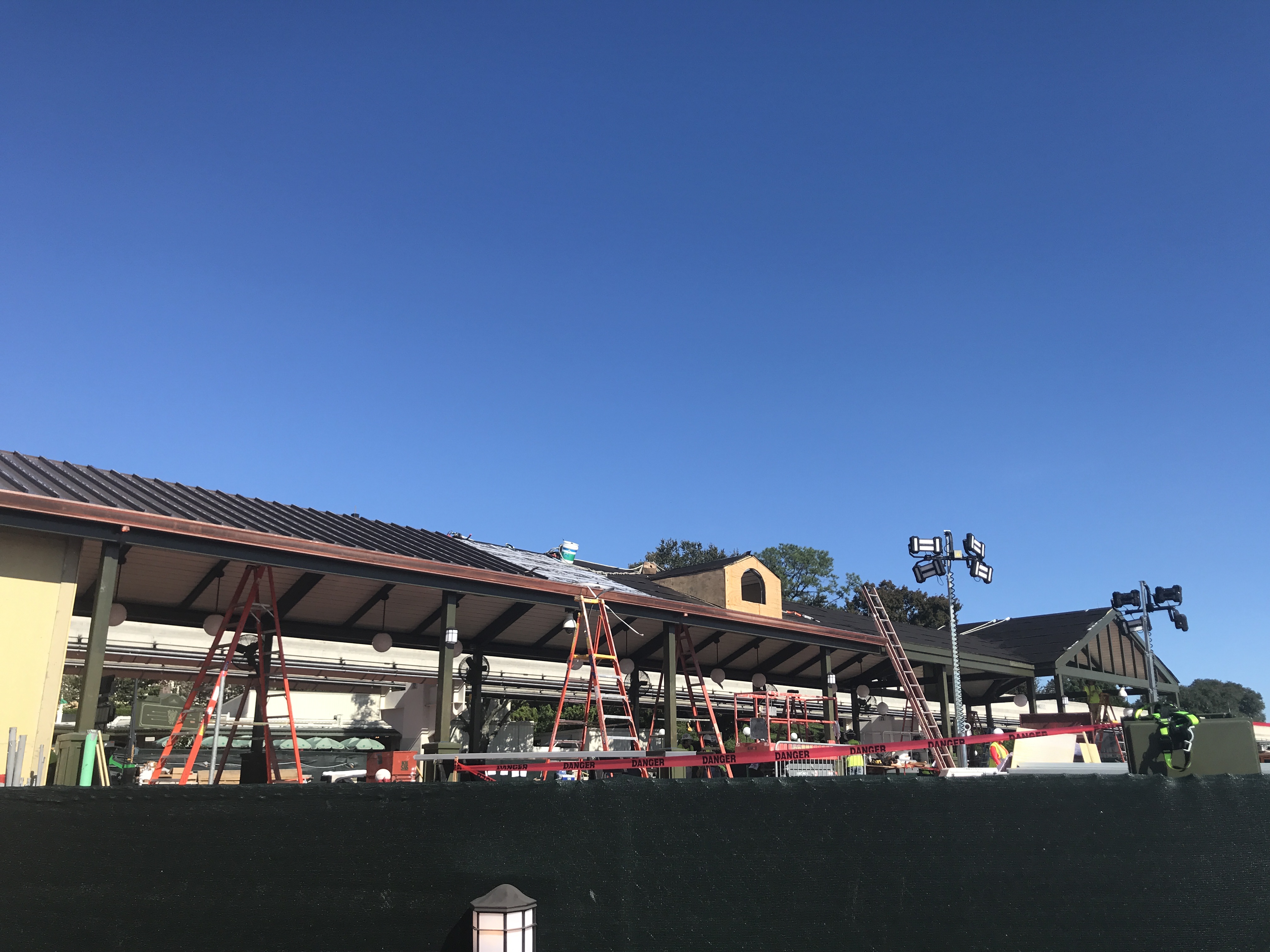 The same panels have been added to the underside of the open air section’s ceiling. Lighting fixtures have been hung. The bulbs match the other lights around Magic Kingdom’s front entrance. Gutters have been attached to the front of the building’s roof, as well.