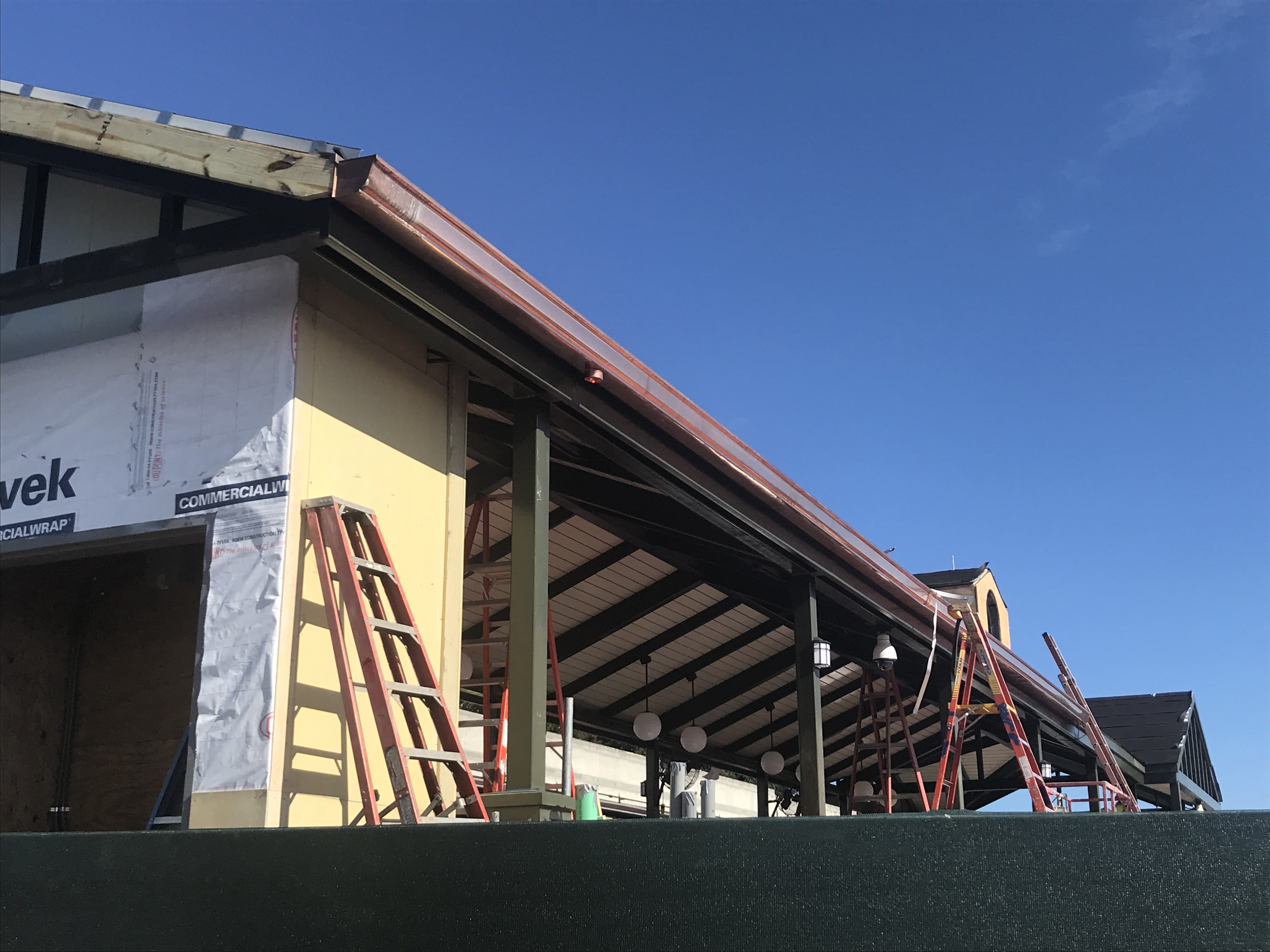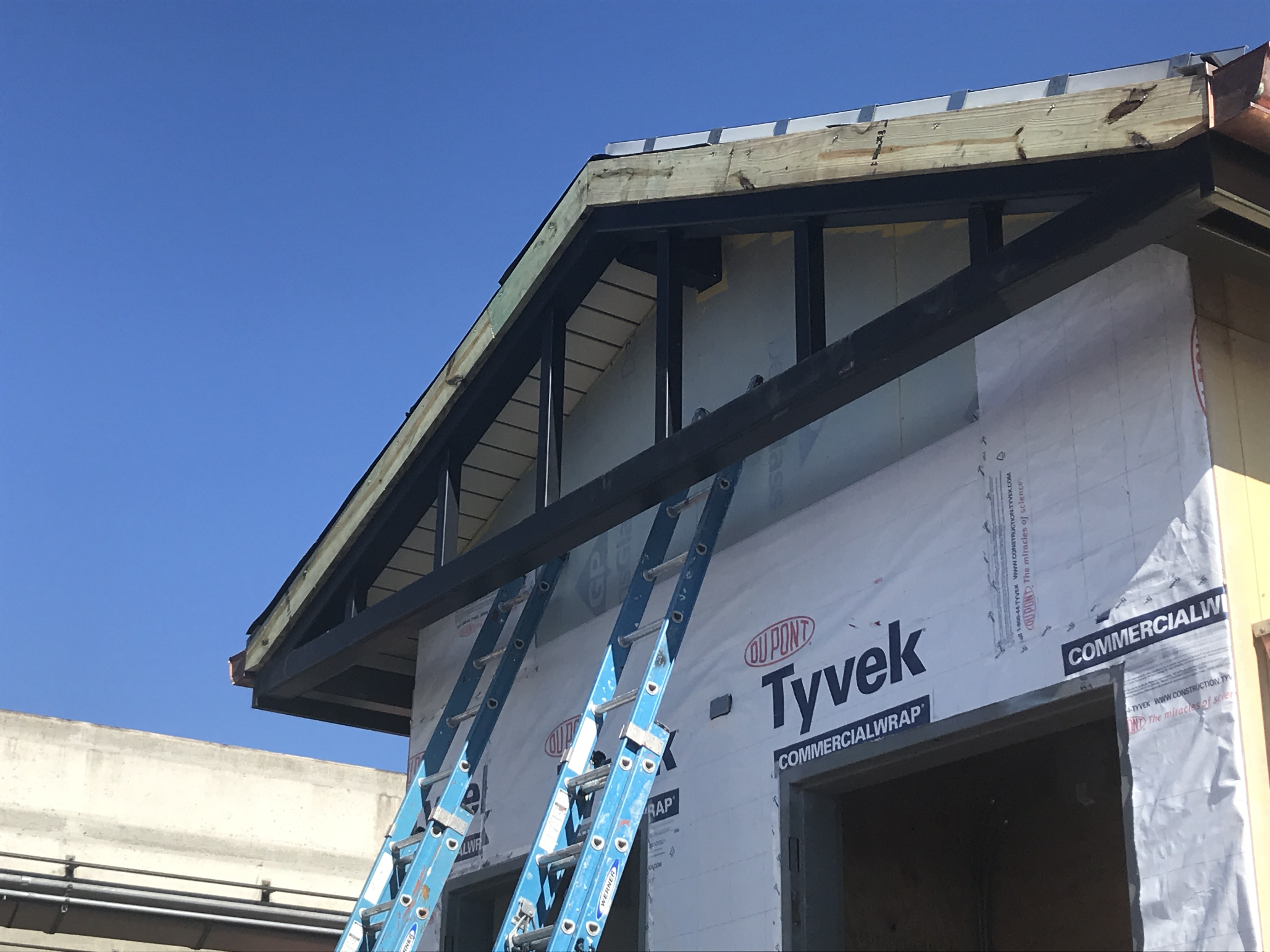 A new gabled dormer has appeared on top of the rooftop. This dormer is the first theming element added to the building. Metal roofing has been applied to part of the roof.