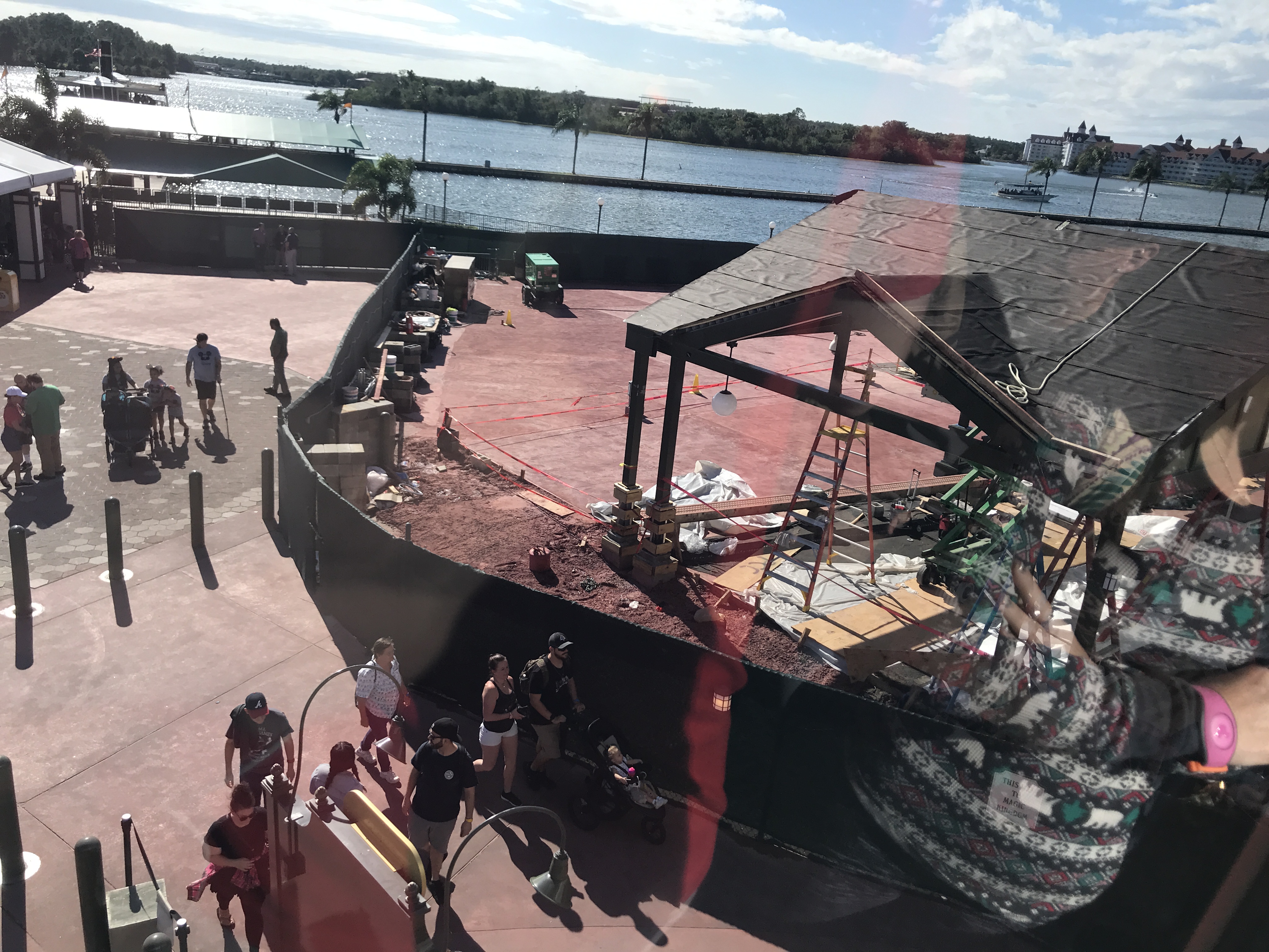 Our best guess is that this structure is going to be a new security screening area for guests traveling to the Magic Kingdom from resorts on the new gold line ferry. The new gold line ferry dock is currently under construction. As for the enclosed portion at the end of the structure, we’re thinking this could be possible guest service windows.