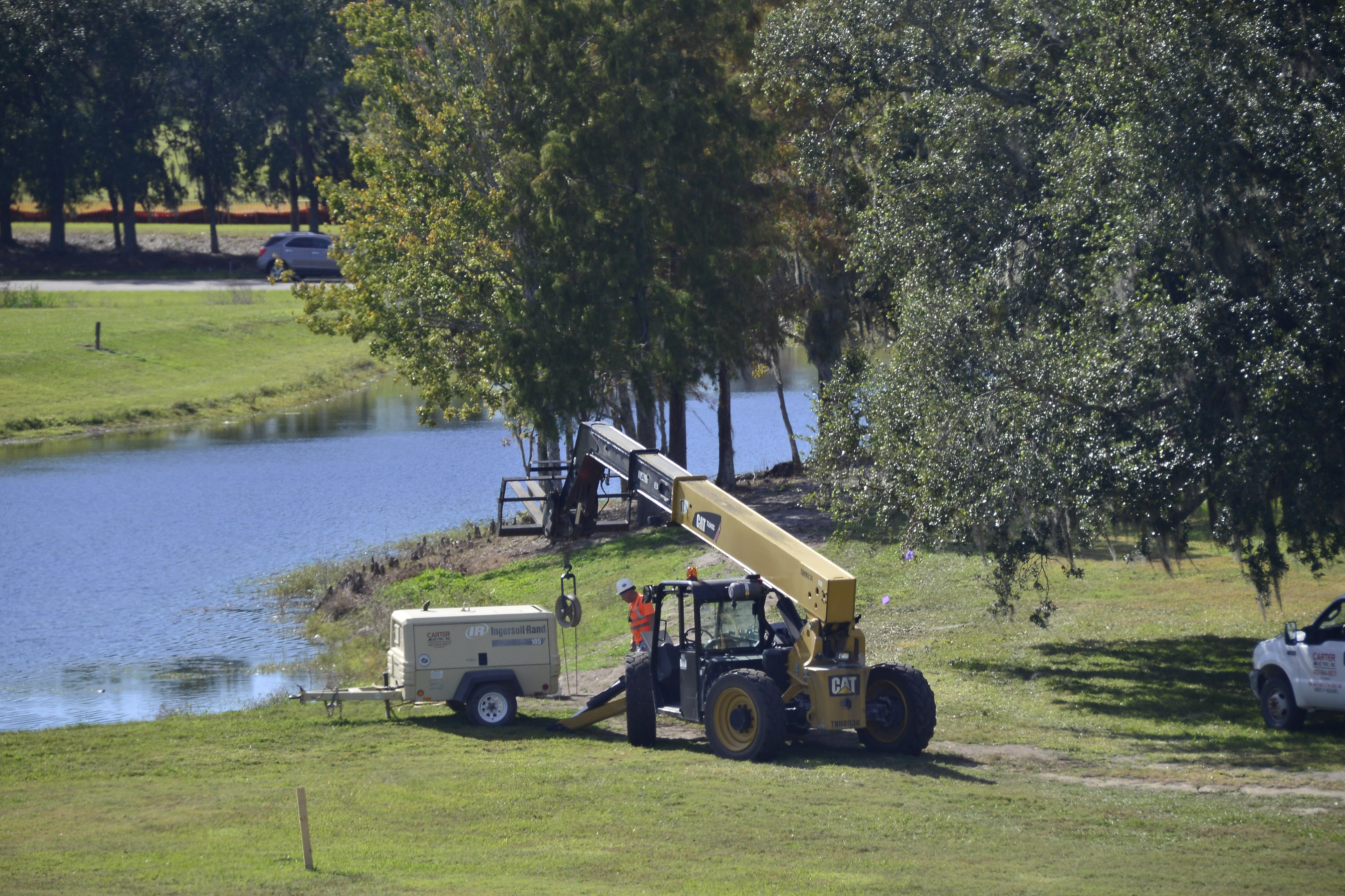 On the near side by the water, some construction equipment was being brought in.