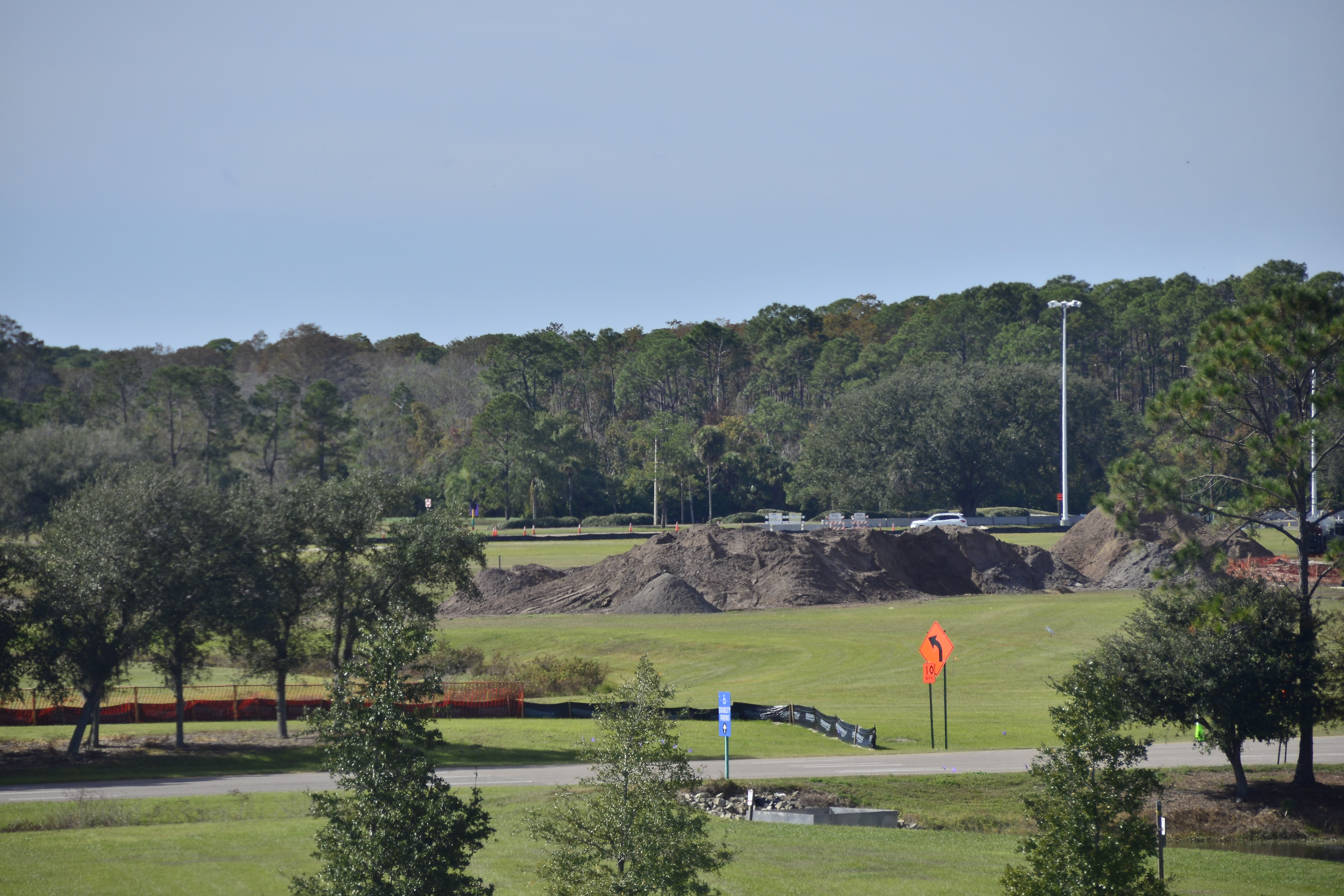 The orange construction fencing is still present along the tree line, while the pile of dirt in the middle of the area is still looming large.