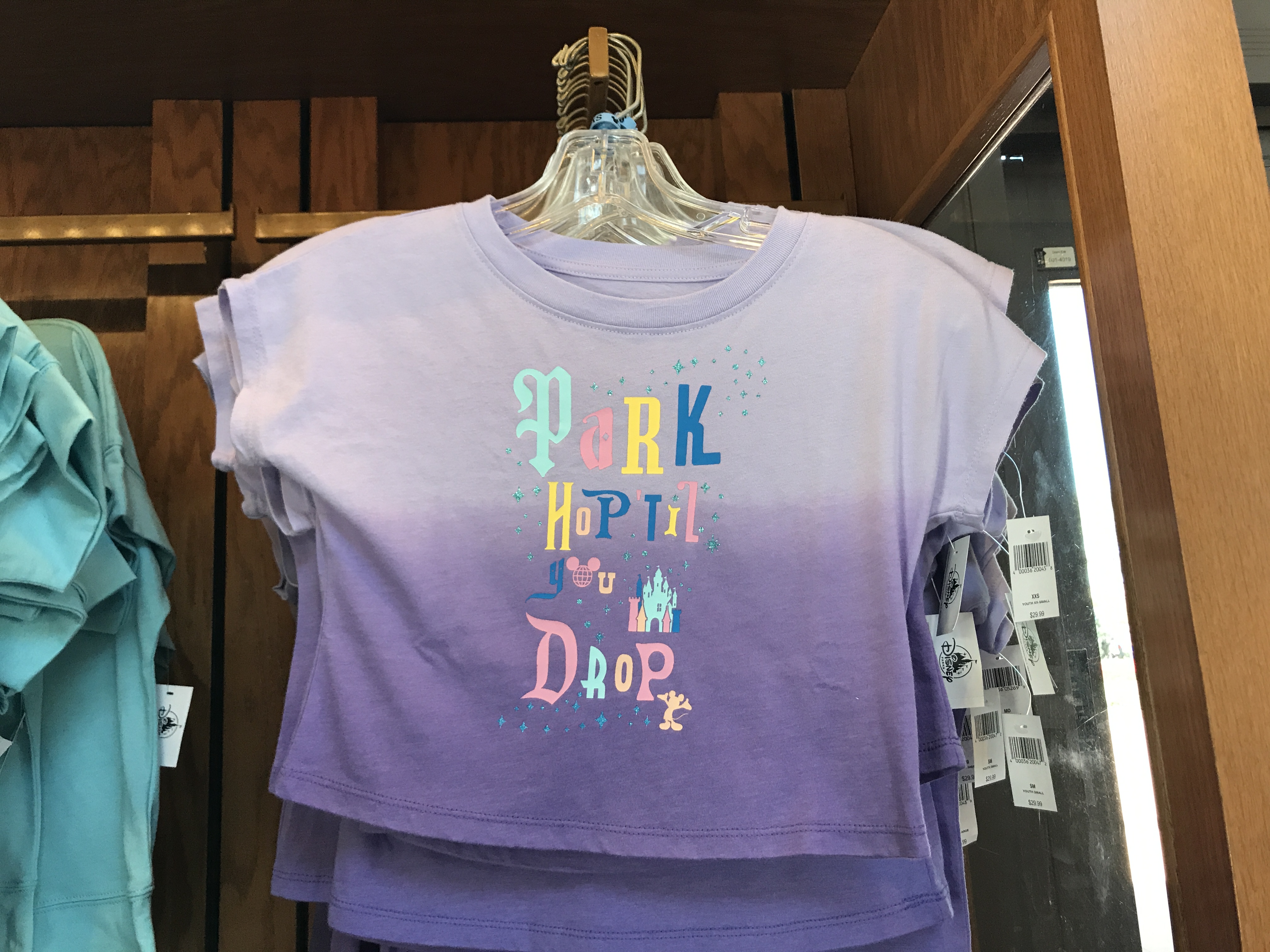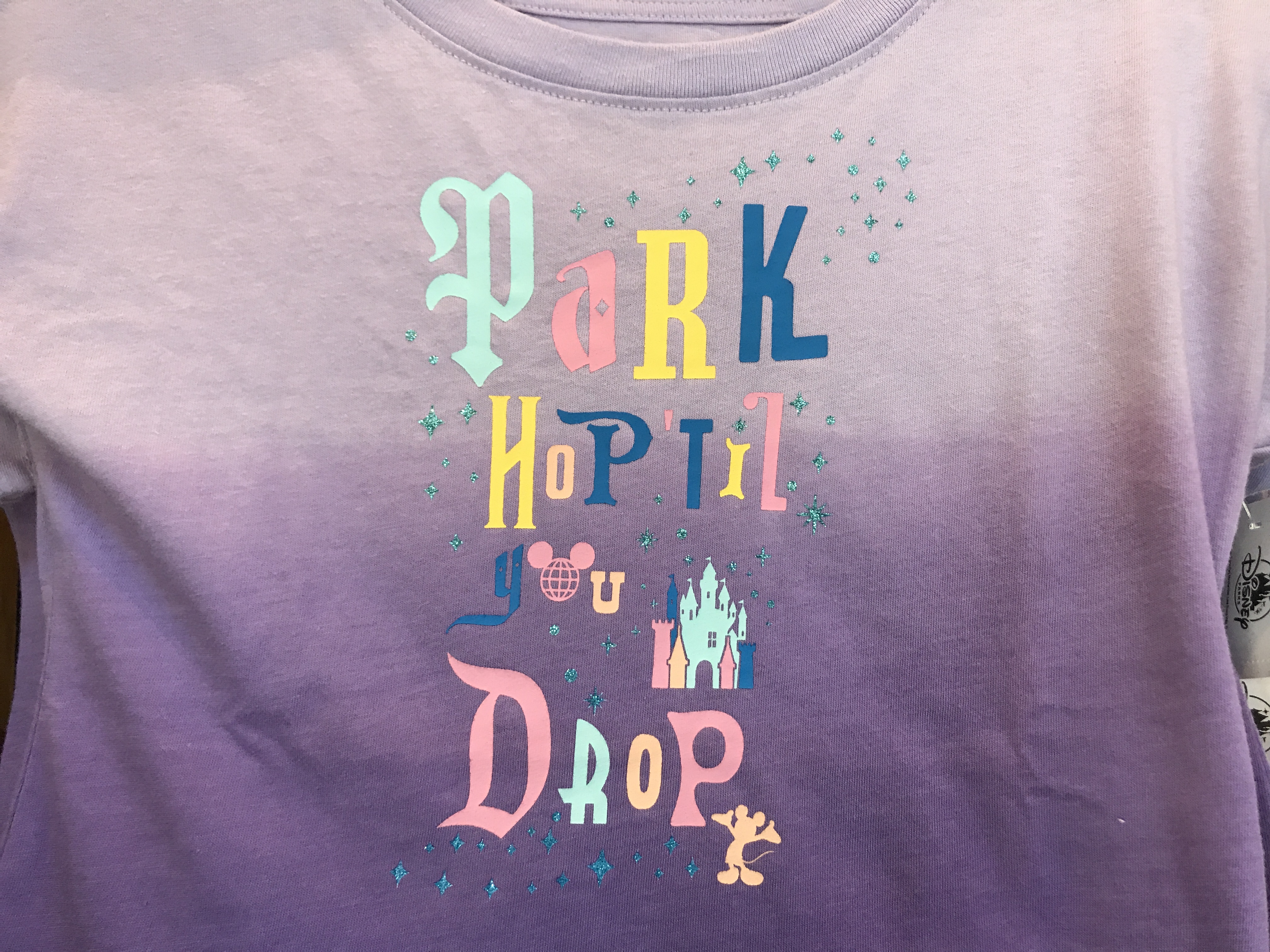 The short-sleeve top is ombre purple and reads “Park Hop ‘Til You Drop” in a funky, mixed-match print.