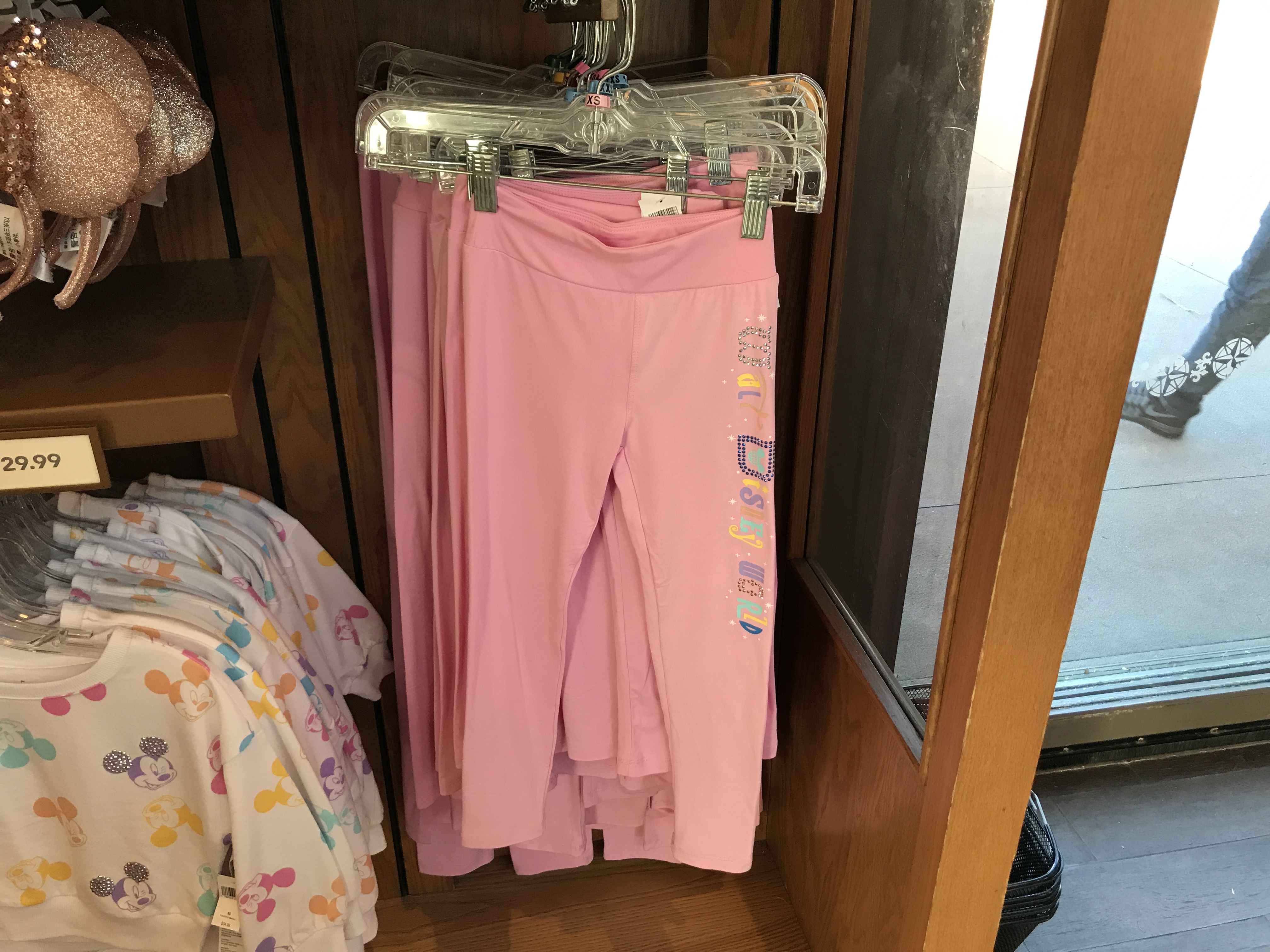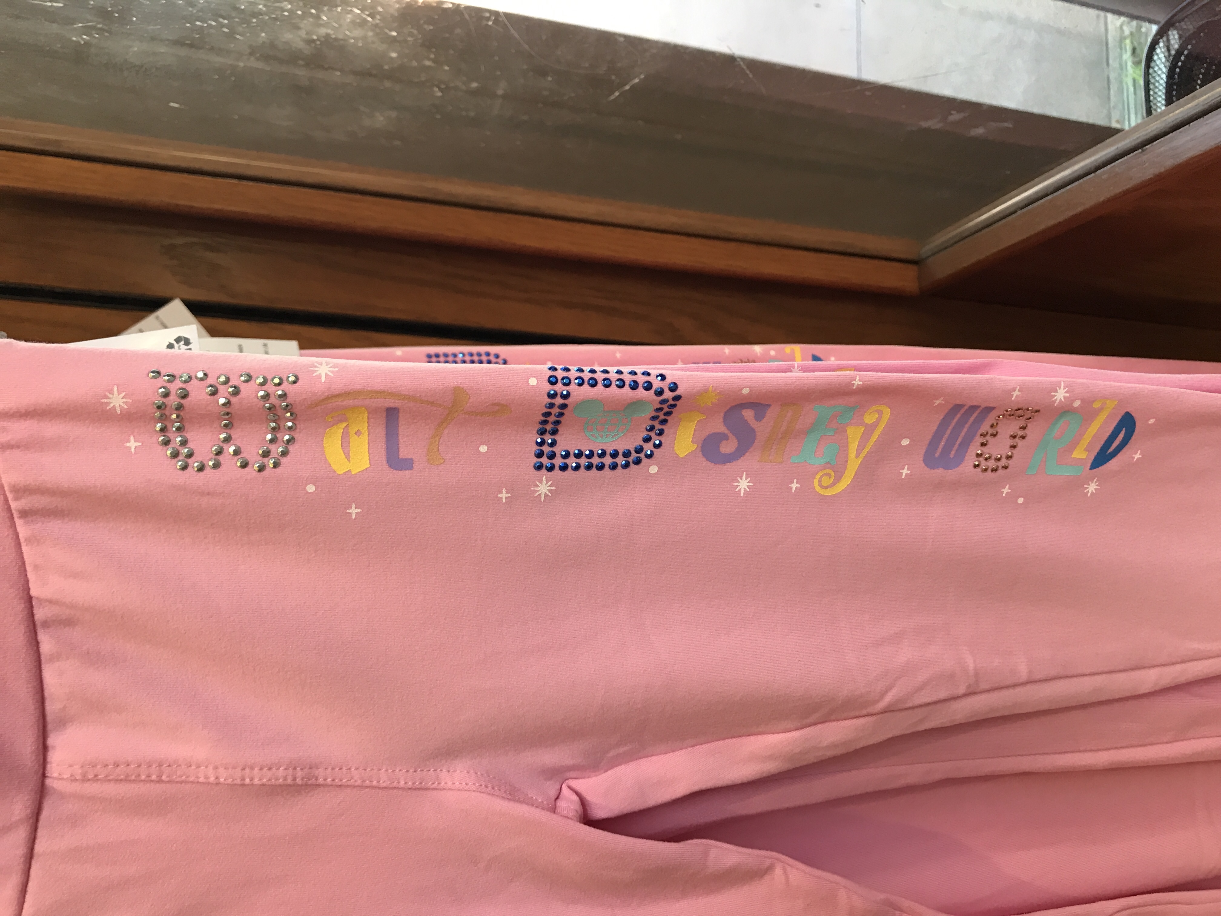 The adorable light pink leggings are extremely soft. Down the side of the leg, “Walt Disney World” is written in the same font as the matching top. But some of the letters are studded to add some extra glitz. The leggings cost $24.99. The youth top and leggings are available at Disney Traders.