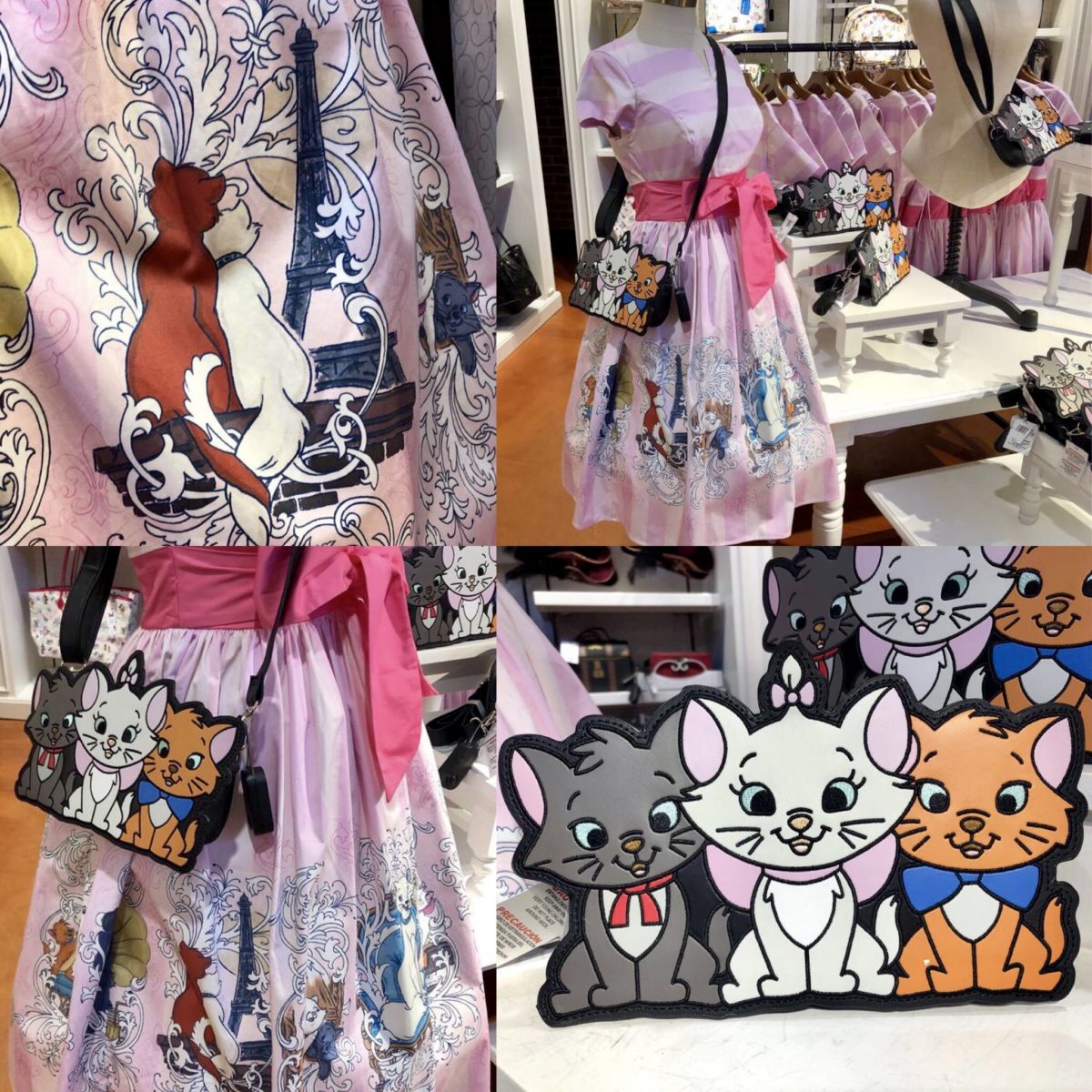 The dress has light pink and white stripes, a bow around the center, and features beloved characters from the 1970 Aristocats film.