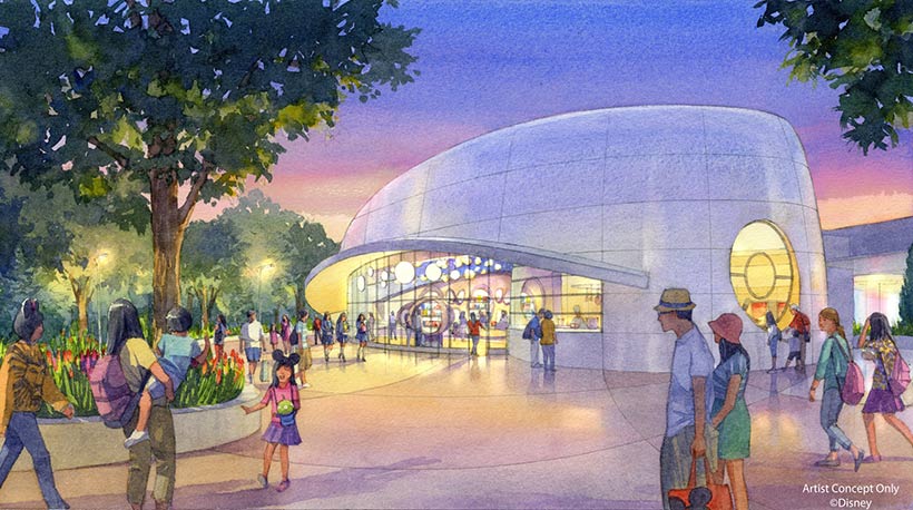 Appropriate to its Tomorrowland surroundings, the shop is themed to outer space. Hanging from the starry ceiling is a huge popcorn chandelier representing the “big bang” that created the universe. Massive windows in and around the facility will allow Guests to view the popcorn being made!
