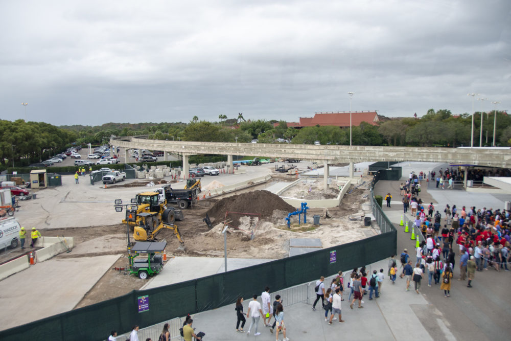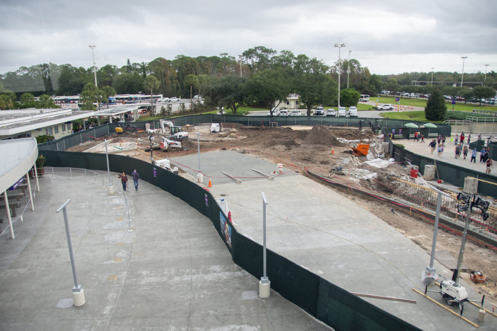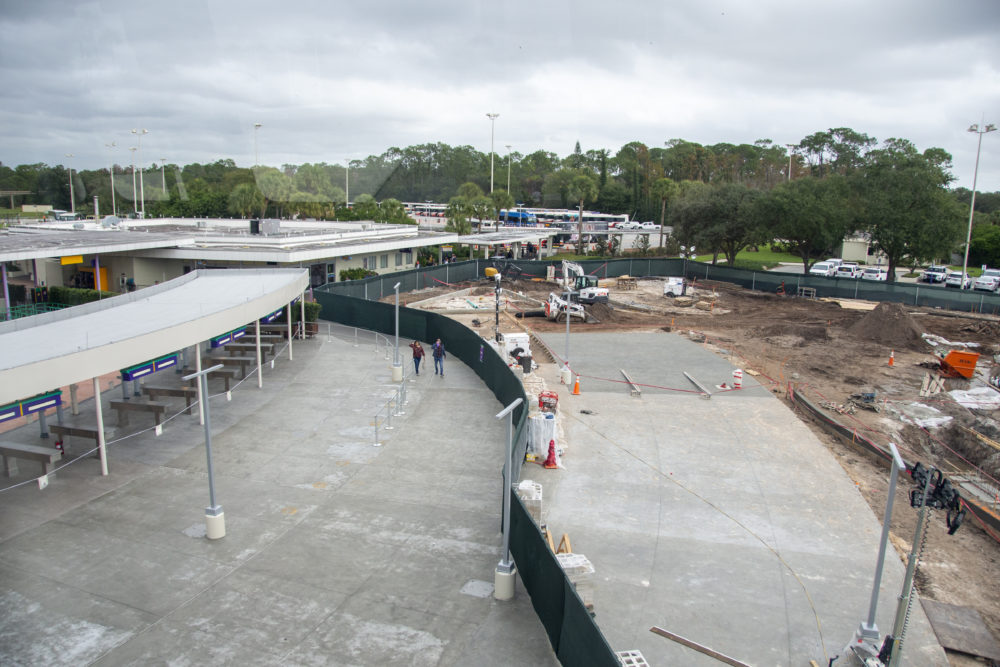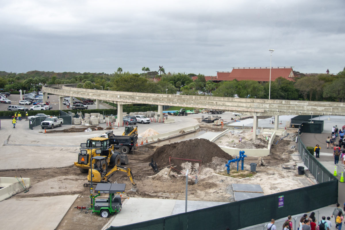 New planters around the supports for the monorail tracks are also finished, with new piping sticking out of the dirt. The paving of what will be the parking tram turnaround is also progressing, with more construction equipment being moved into the site.
