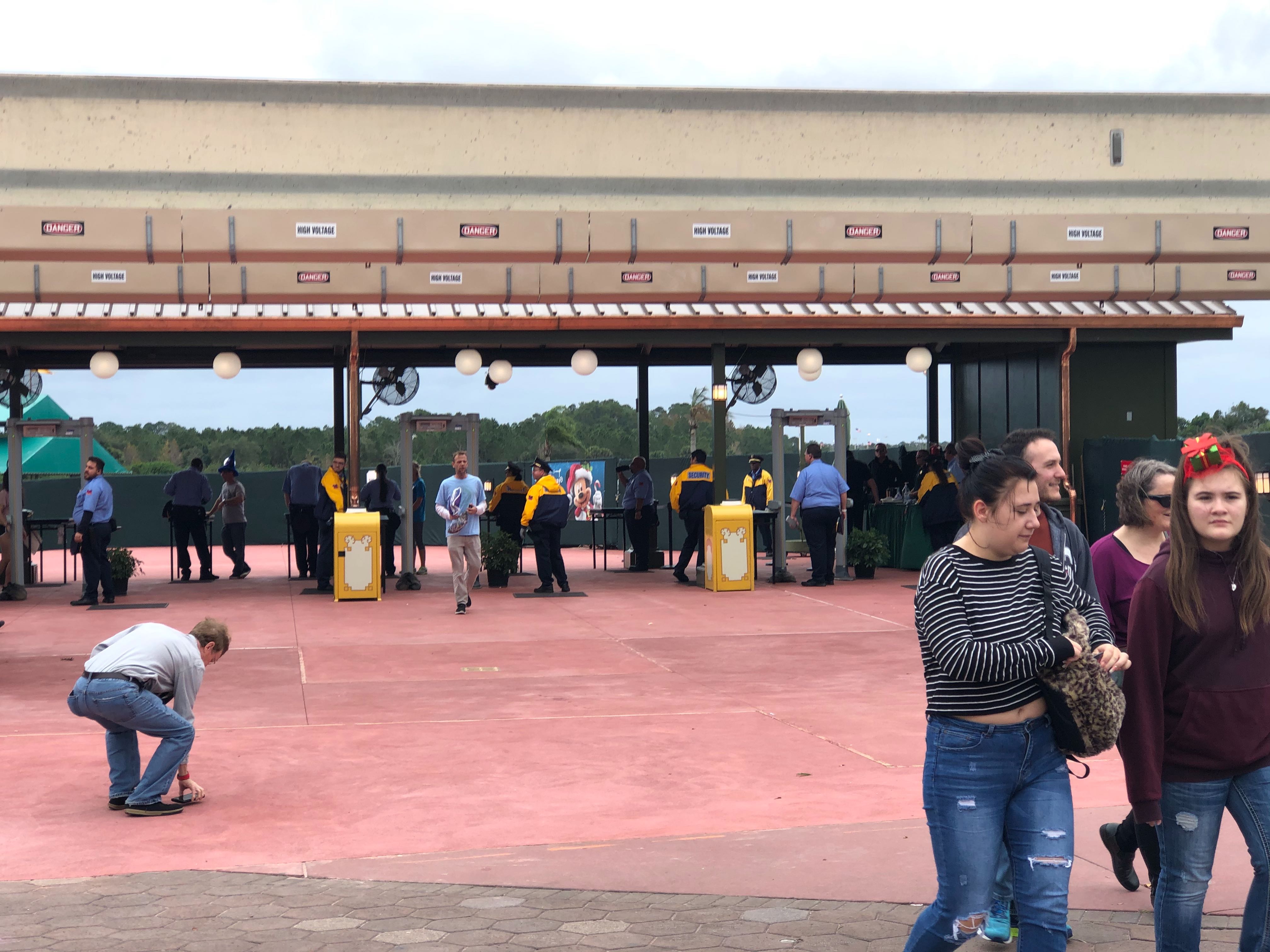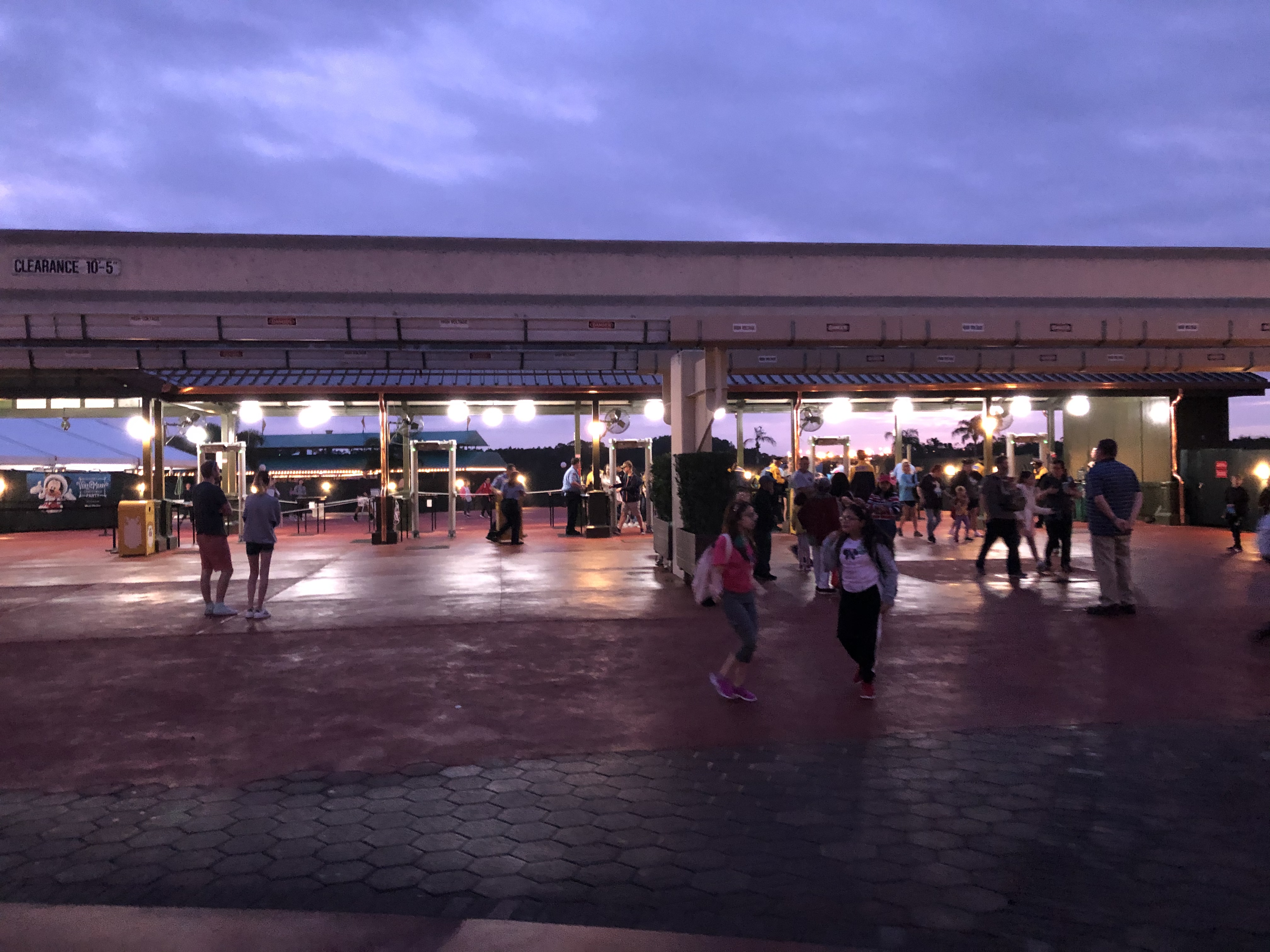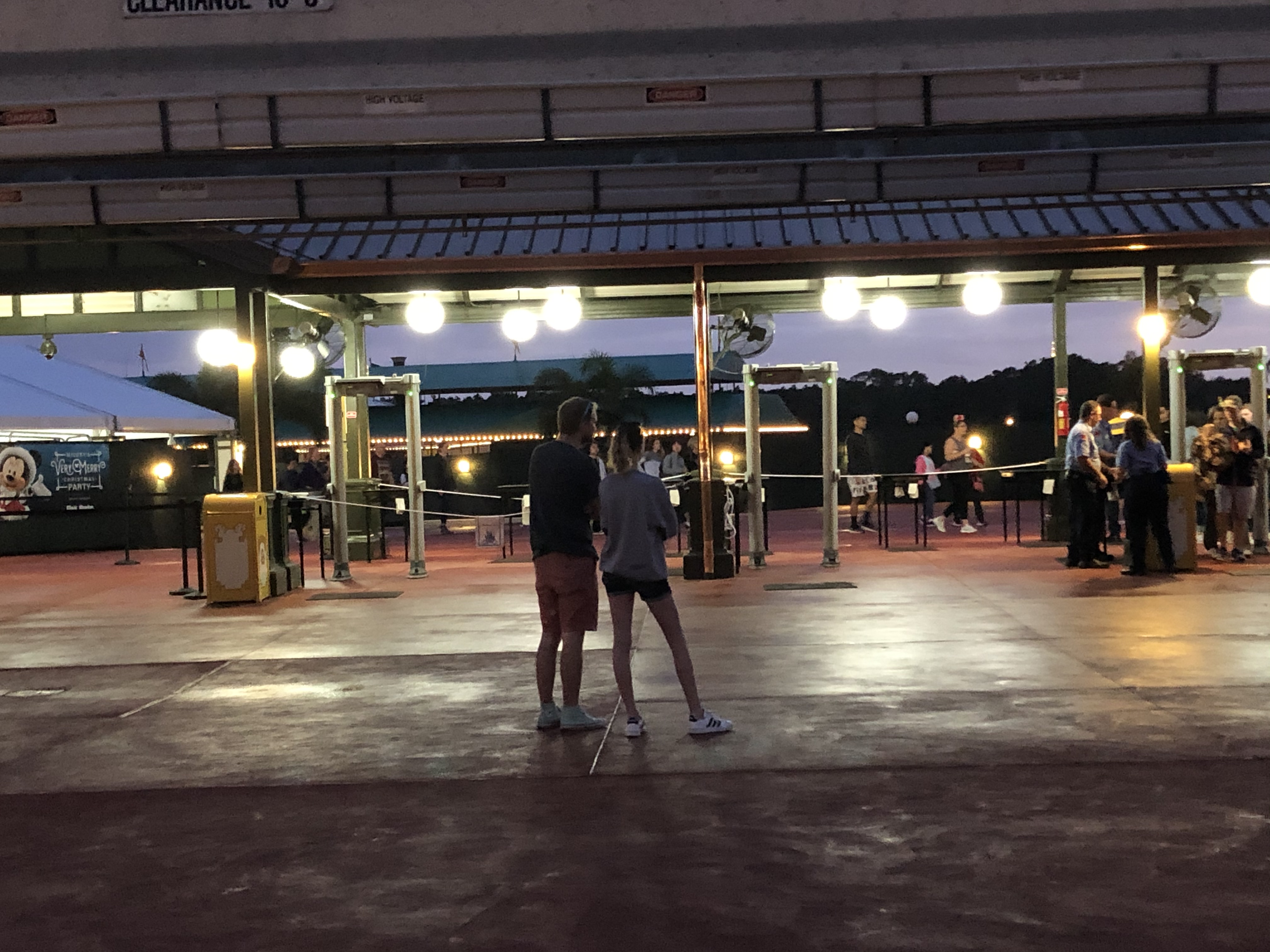The new check point has temporary tables still for bag check and metal detectors behind them. It’s located closest to the bus stop and will be utilized by guests coming in by bus. (Guests using the ferry to get to the Magic Kingdom are screened at the Transportation and Ticket Center. Those walking over from Disney’s Contemporary Resort are screened halfway through that walkway. Monorail guests are screened either at the TTC or at a monorail resort prior to boarding. Those arriving by resort boats are screened at the dock.)