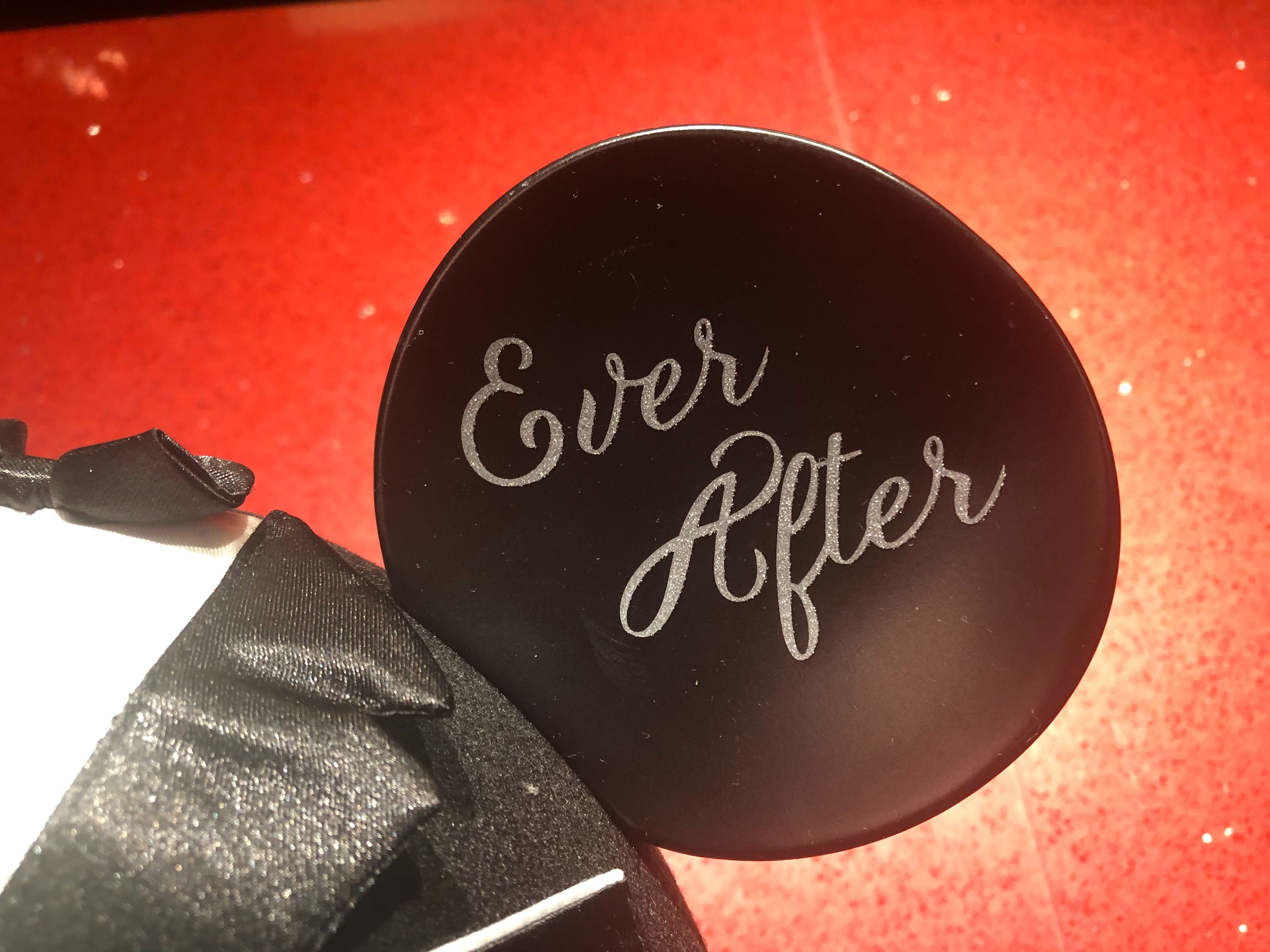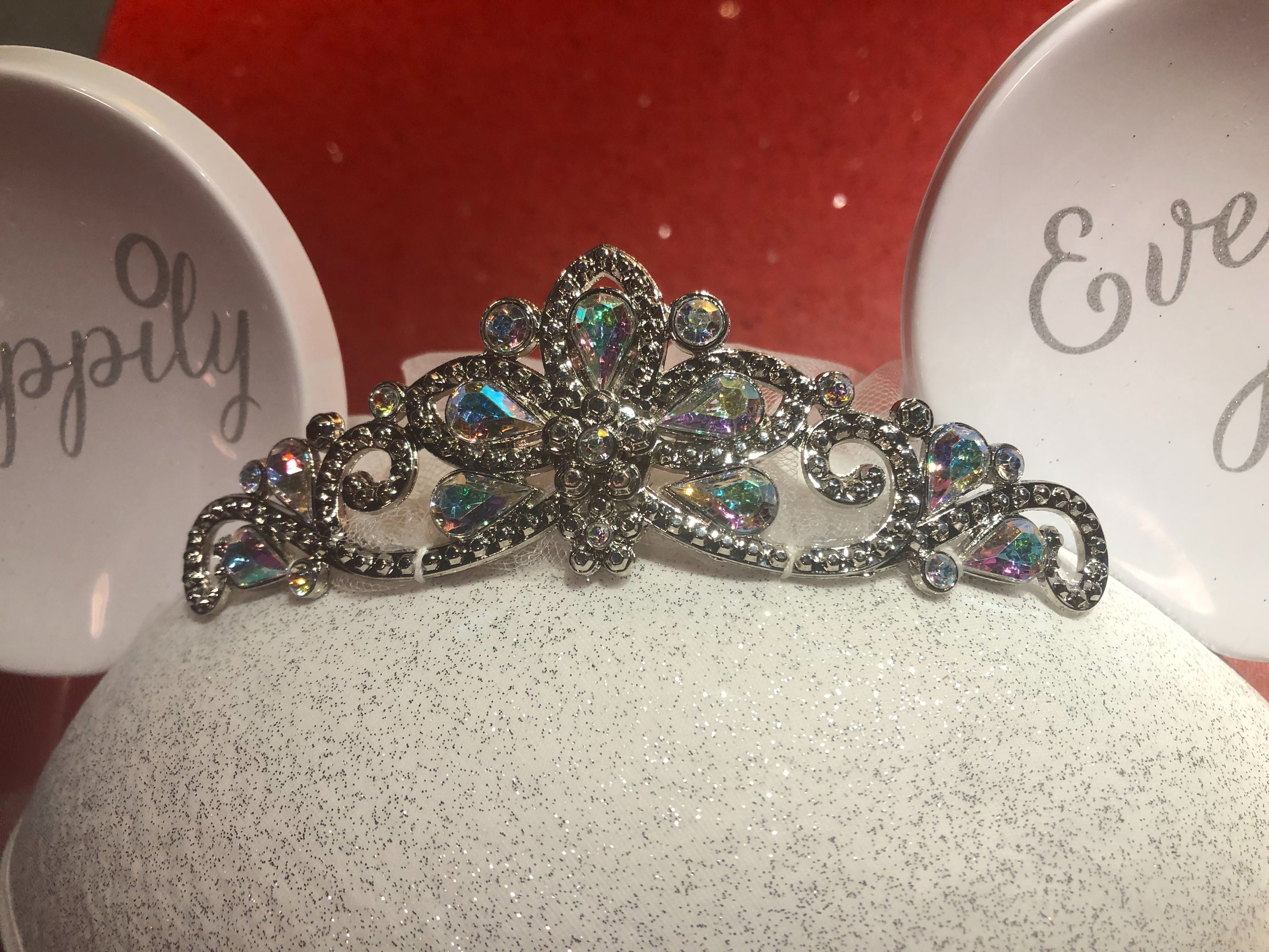 The bride and groom ear both have sparkly, glitter lettering that reads “Happily” on one ear and “Ever After” on the other. These are similar to the original pair, with more differences than just the sparkly lettering on the ears.