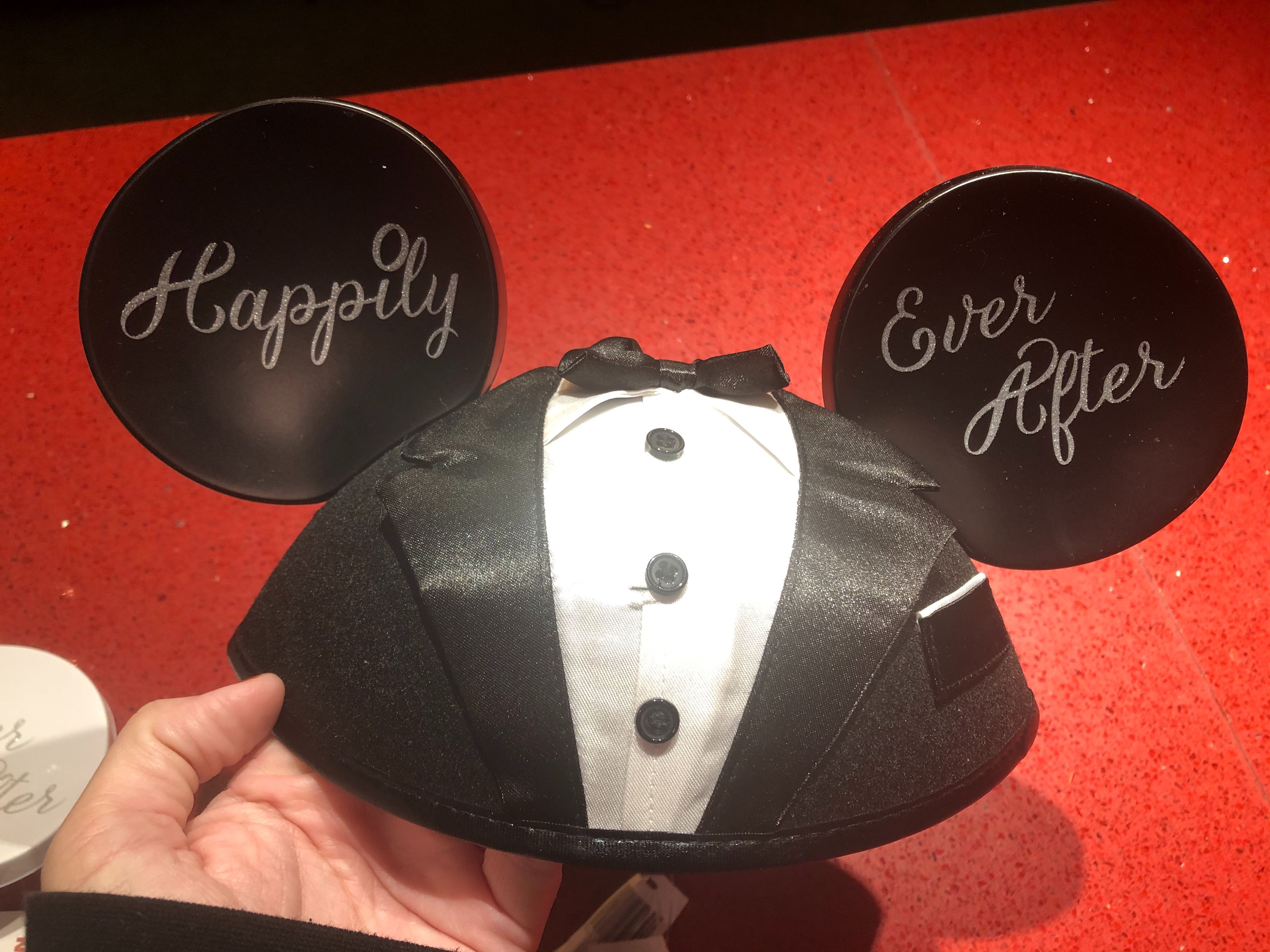 There has been no shortage of new ears lately. We recently fell in love with the bridal ear headband and were eager to find more new wedding merchandise. Today, we came across the perfect pair of new ear hats featuring a bride and groom! These “Happily Ever After” ear hats are perfect for any couple who loves Disney.