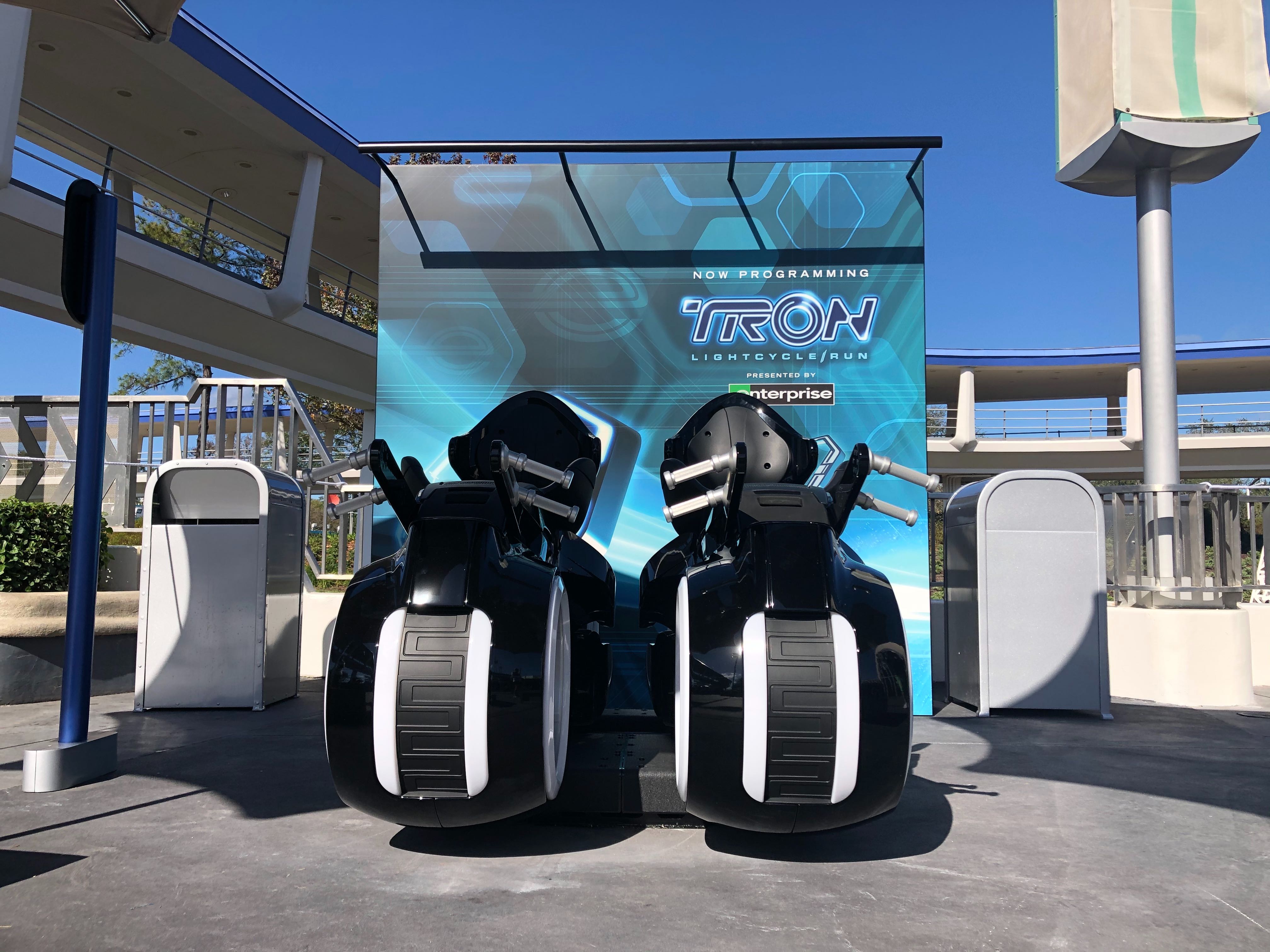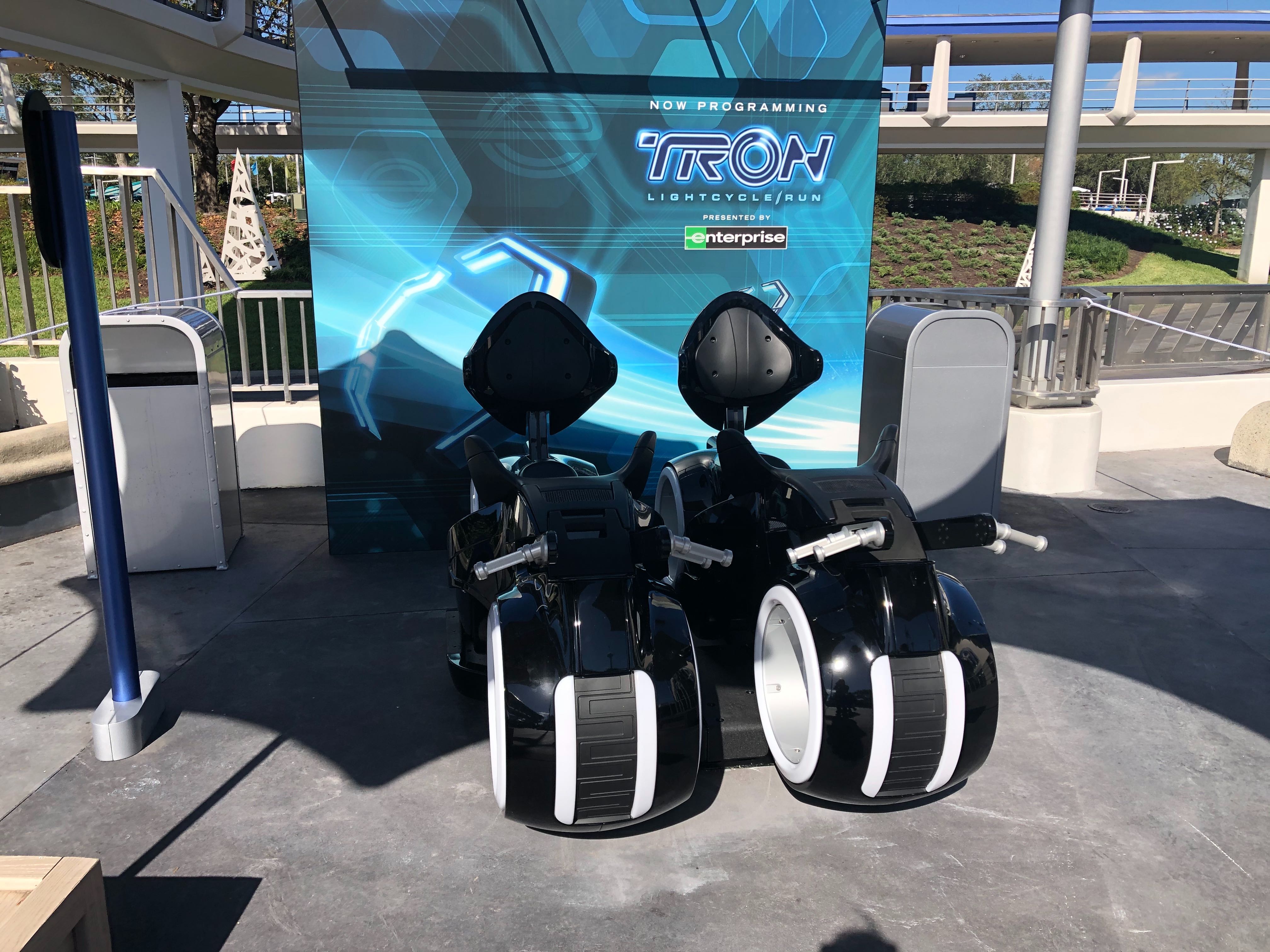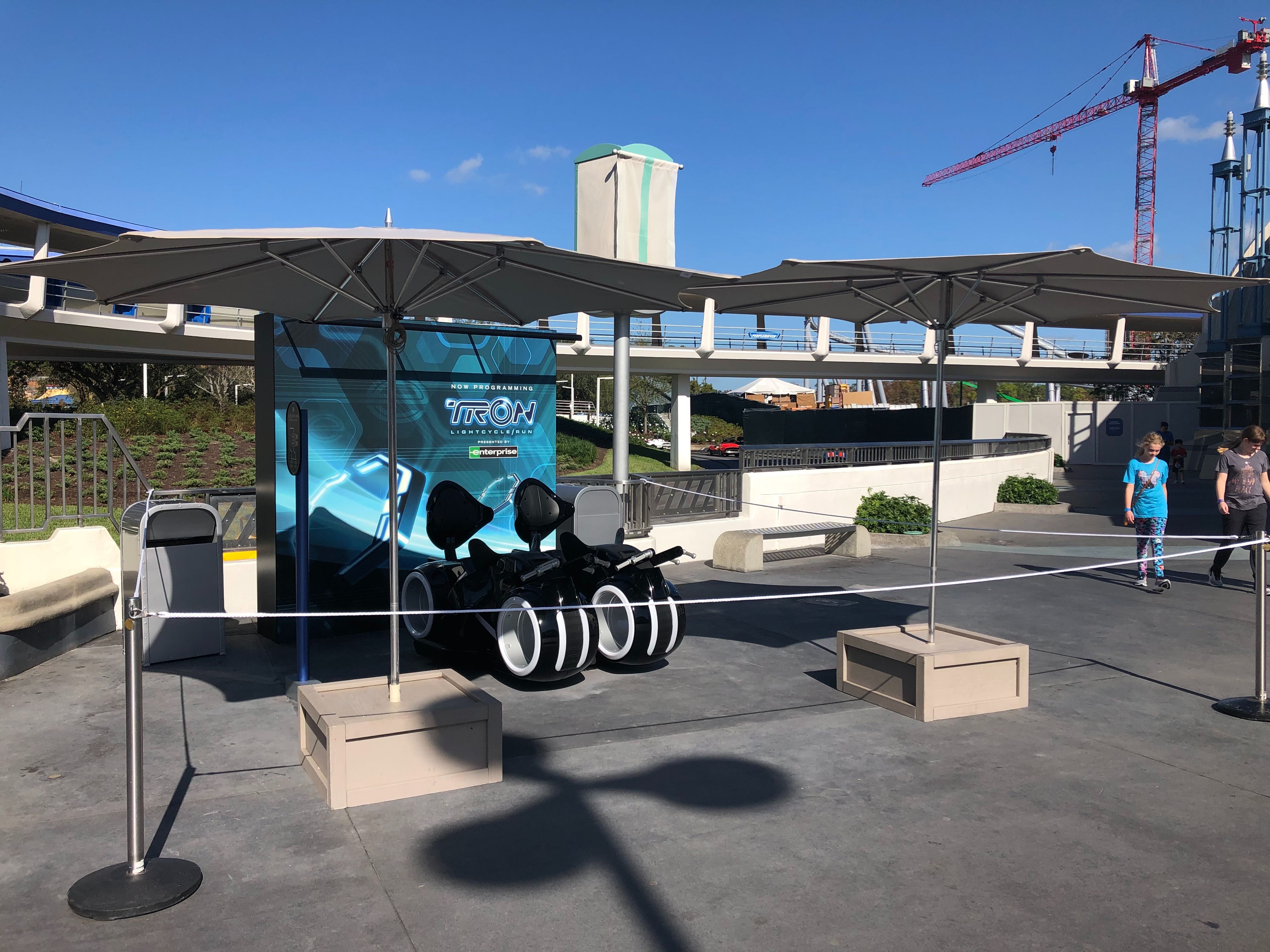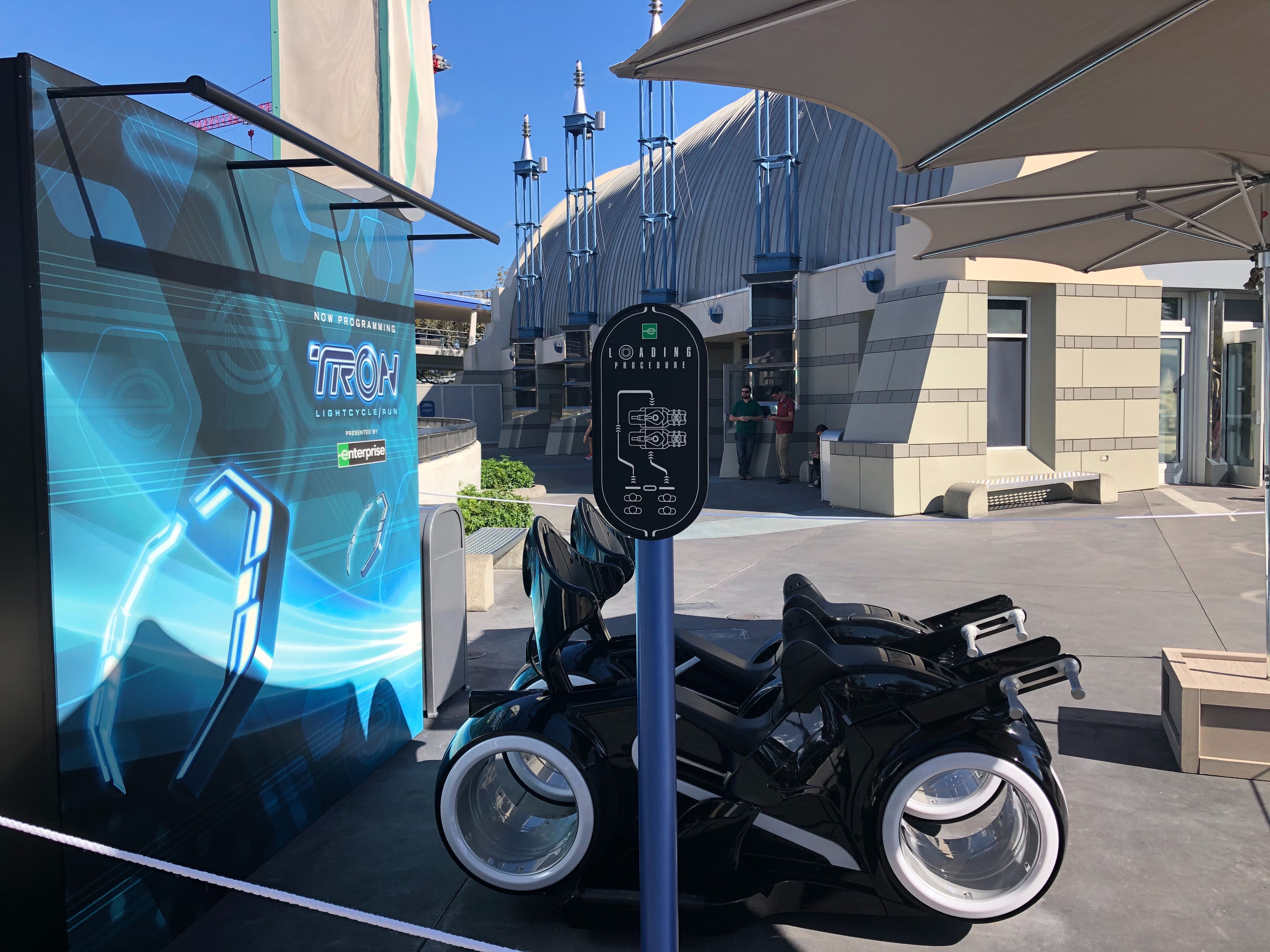 Guests visiting the Magic Kingdom today were surprised by two ride vehicles and a photo op for the TRON Lightcycle Run roller coaster, opening at the park in 2021. Located outside of Tomorrowland Light & Power Co. in Tomorrowland, this advertisement for the upcoming attraction is sure to intrigue many a guest.
