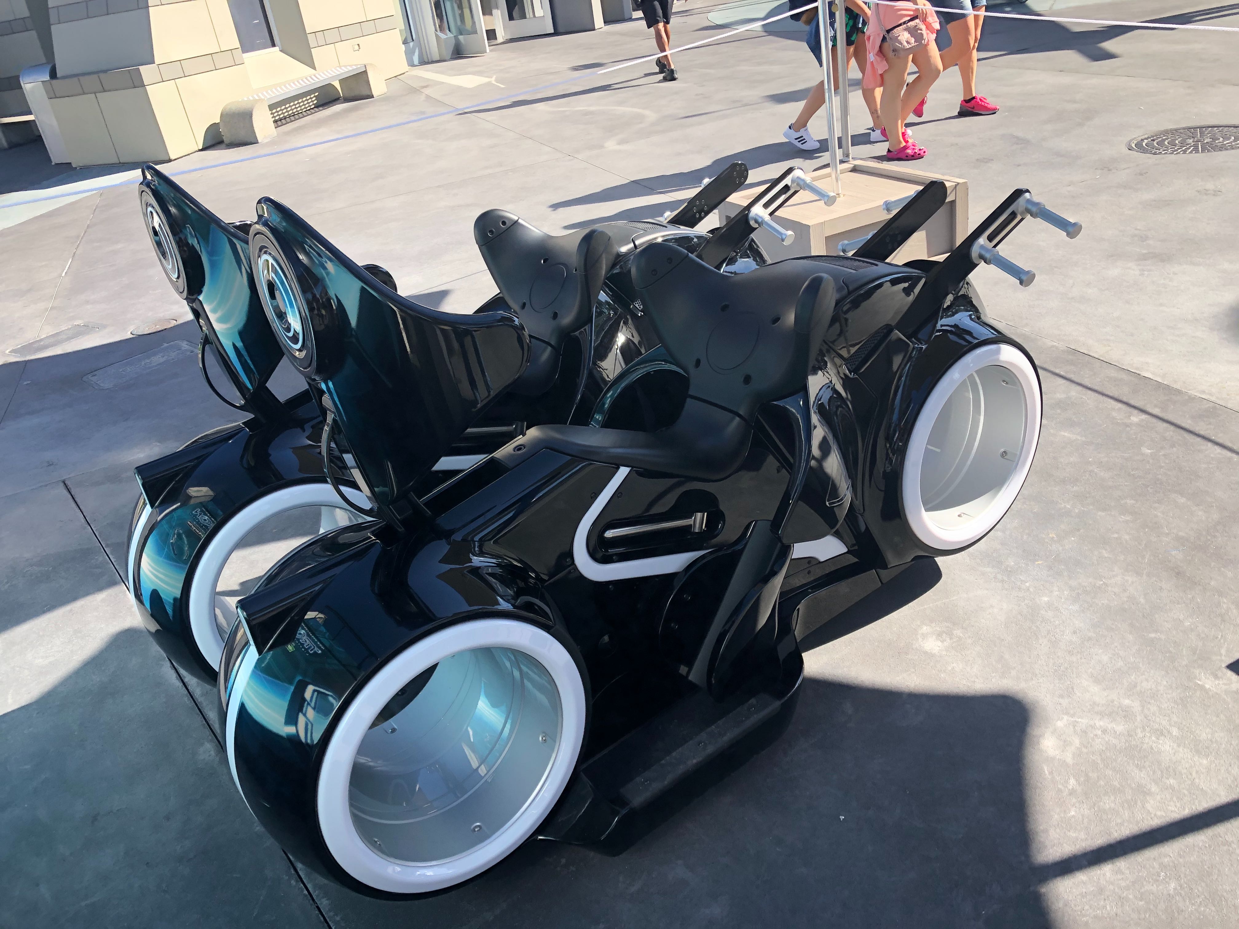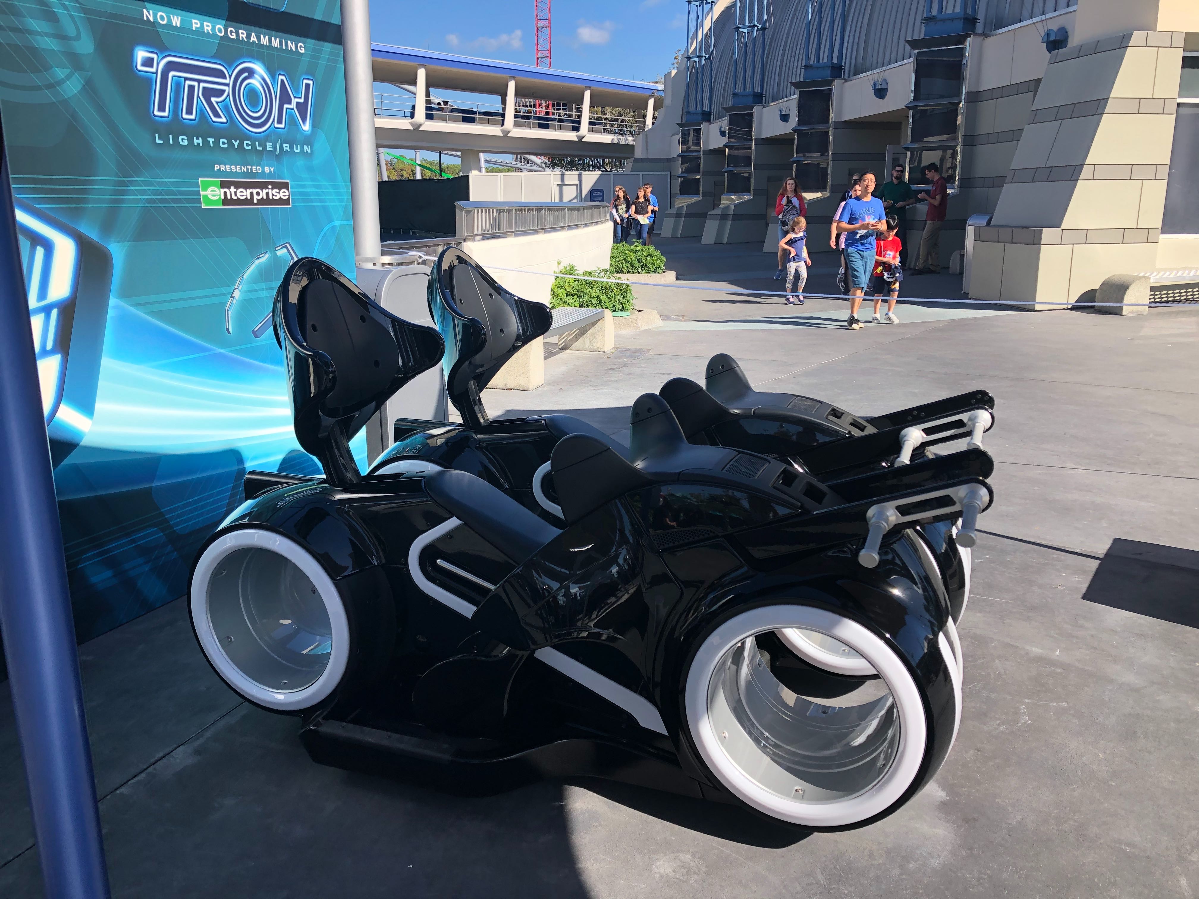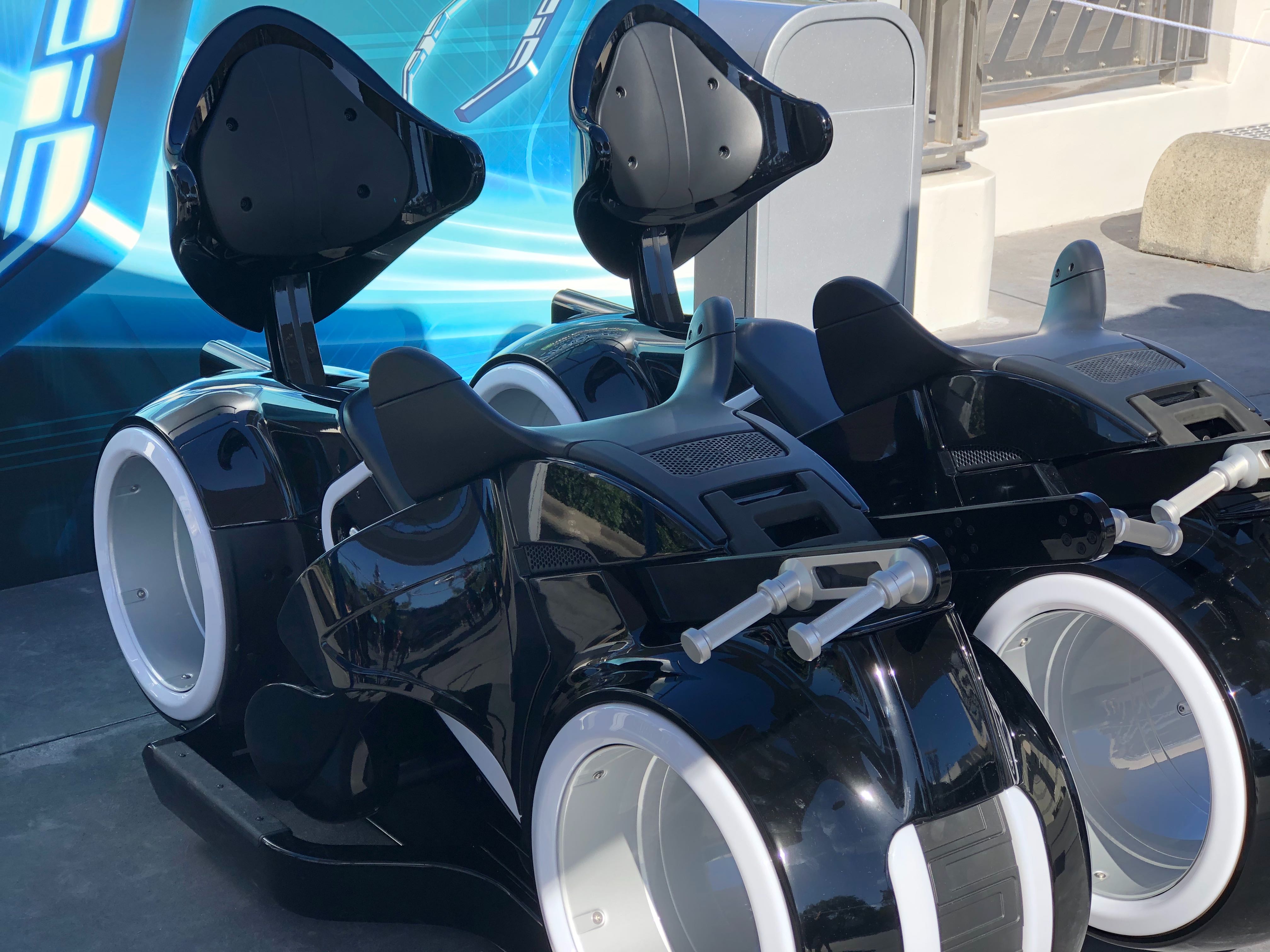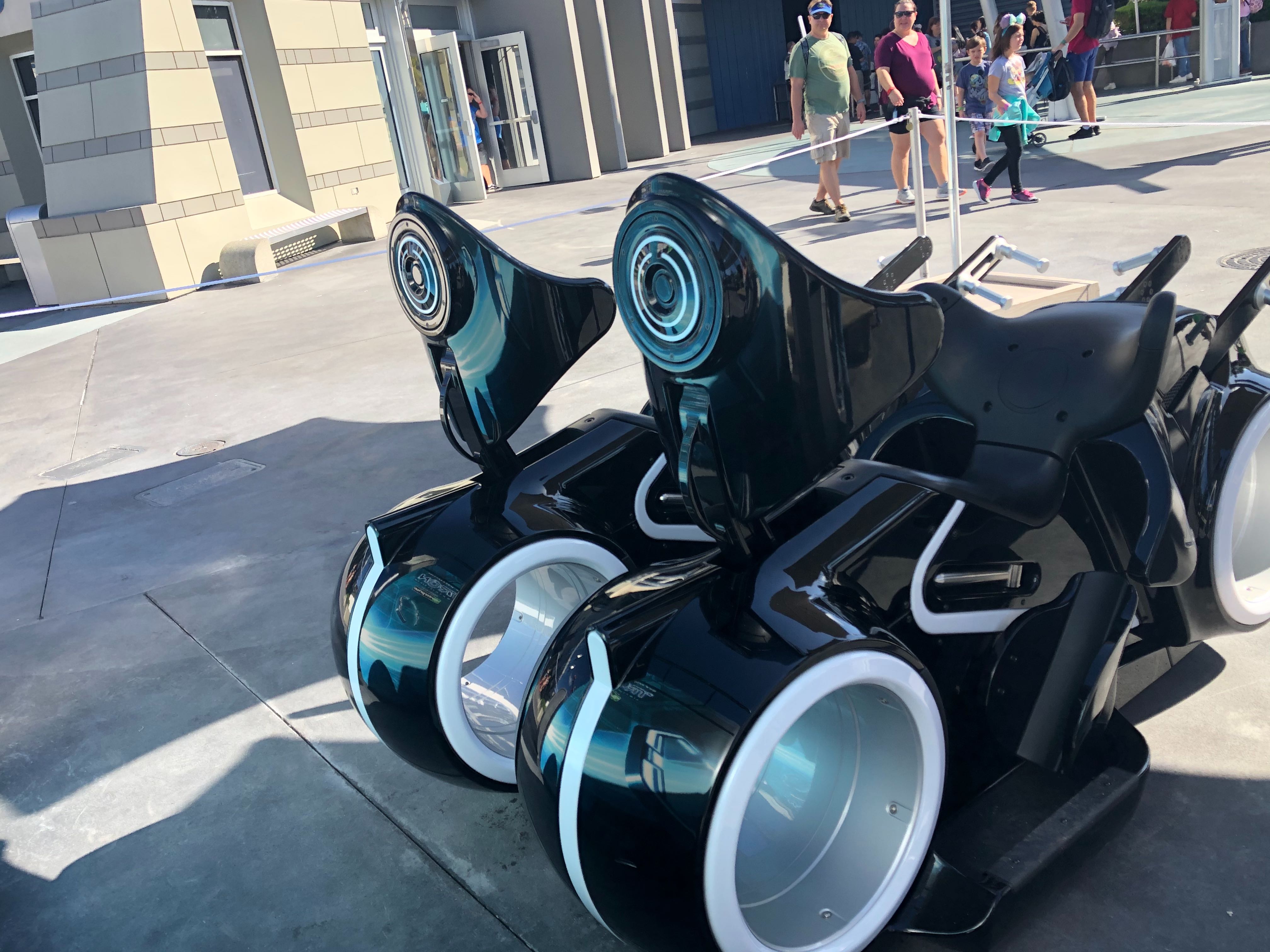 Guests visiting the Magic Kingdom today were surprised by two ride vehicles and a photo op for the TRON Lightcycle Run roller coaster, opening at the park in 2021. Located outside of Tomorrowland Light & Power Co. in Tomorrowland, this advertisement for the upcoming attraction is sure to intrigue many a guest.