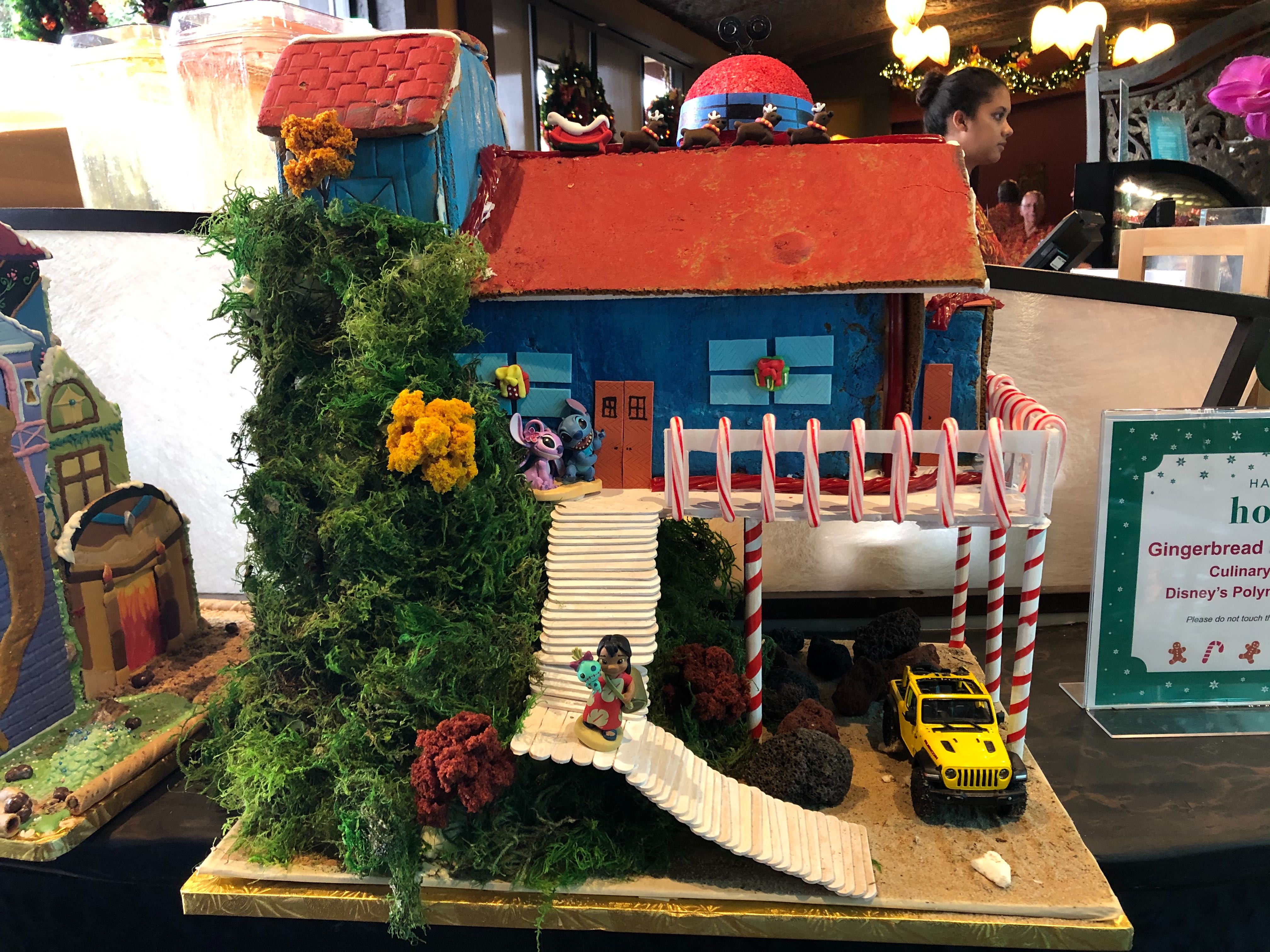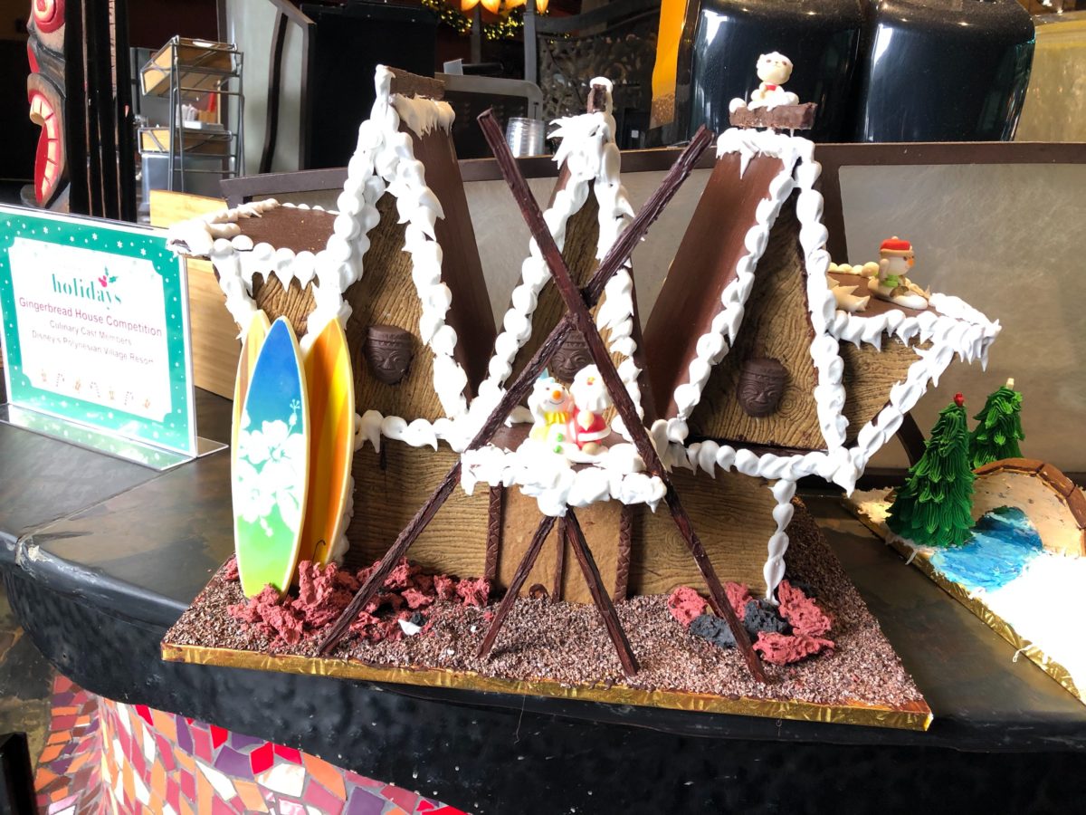 The culinary Cast Members from Disney’s Polynesian Village Resort are having a gingerbread house contest. Several gingerbread displays can be found on the second floor of the lobby, next to Kona Island. These may not be as large as some of the displays at the other resorts, but we felt they deserved just as much attention! Take a look at some of the creative displays they’ve come up with.