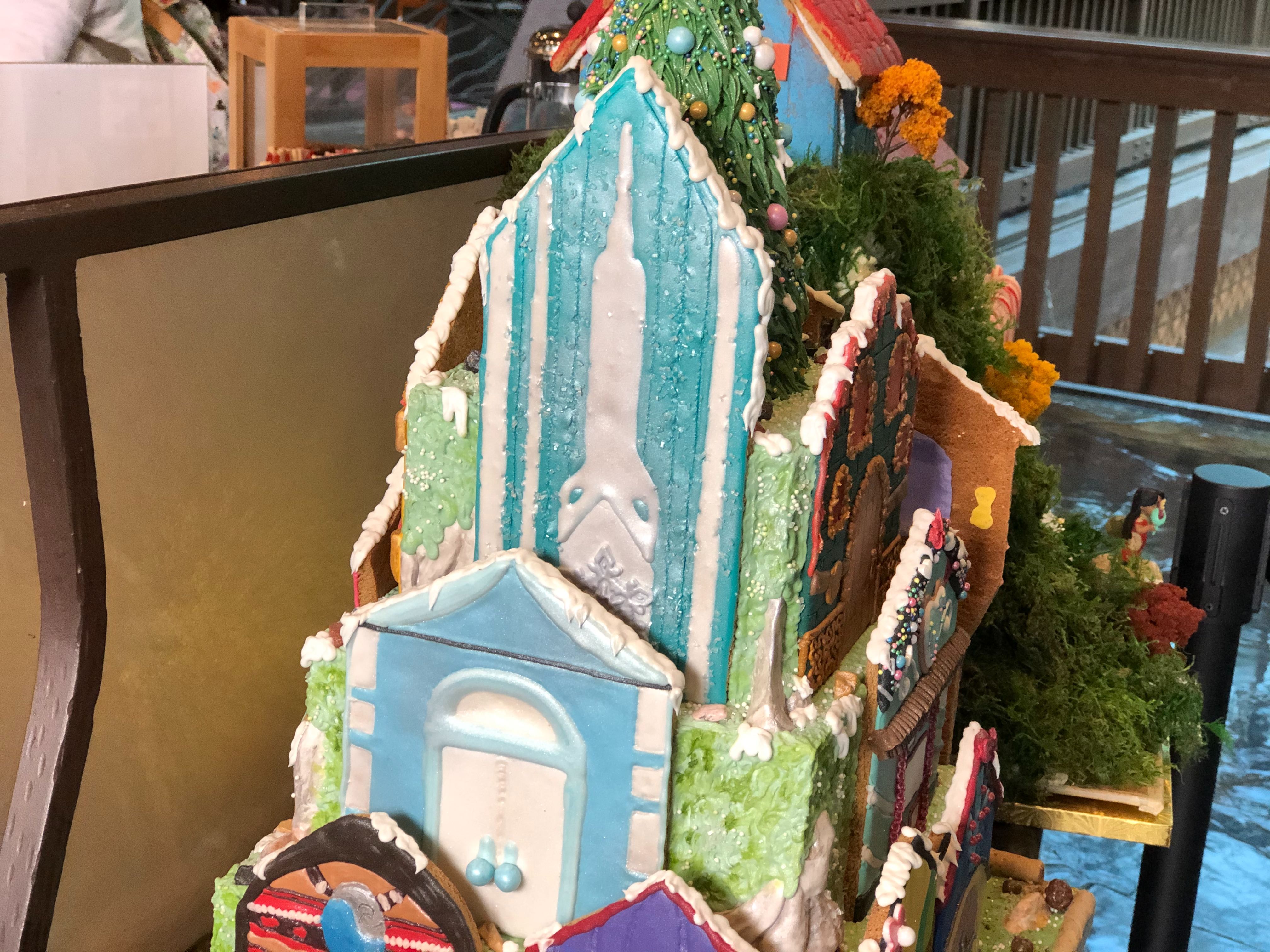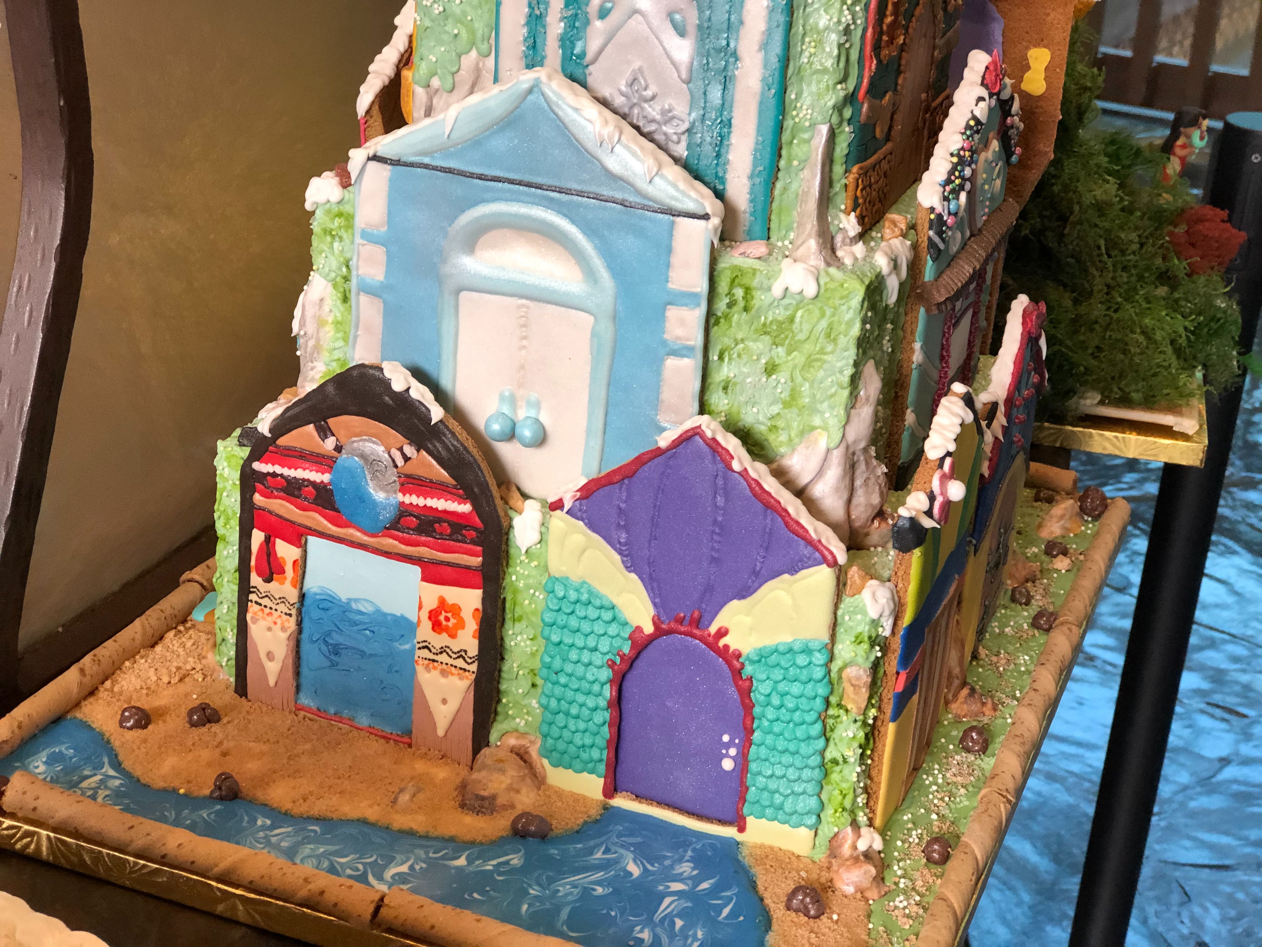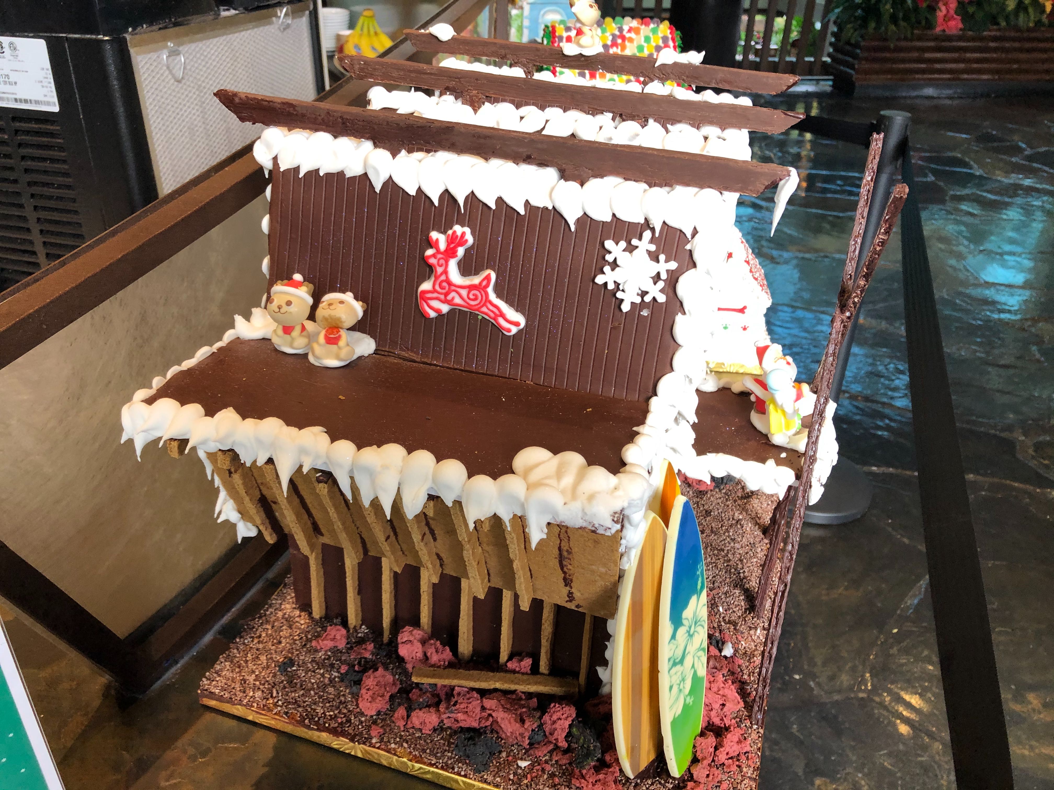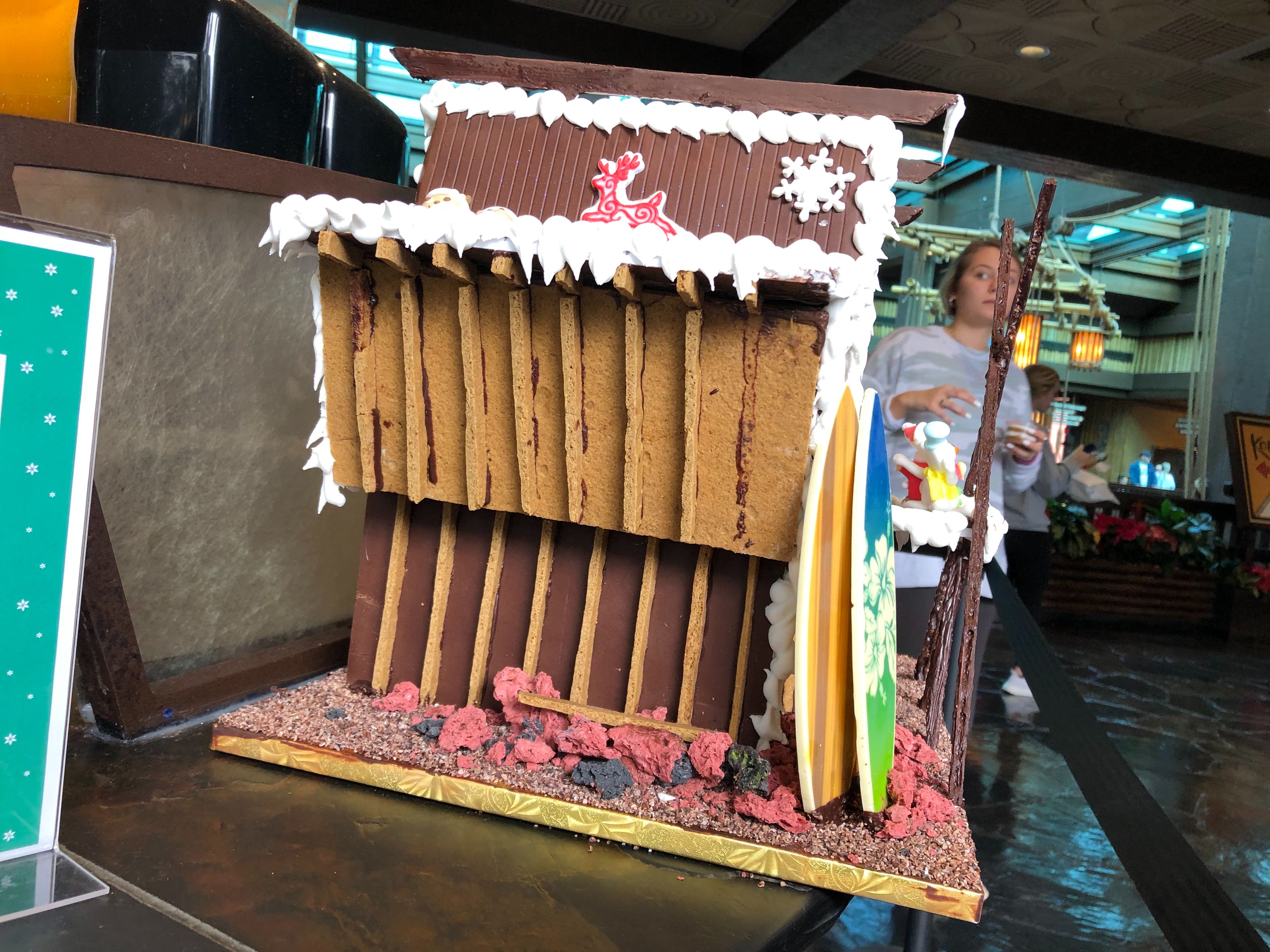 This display looks pretty detailed, and seems to be designed to look like the Polynesian Resort! There are chocolate tiki faces, surfboards, and Santa on the front. There is also some intricate graham cracker construction on the side that’s pretty impressive.