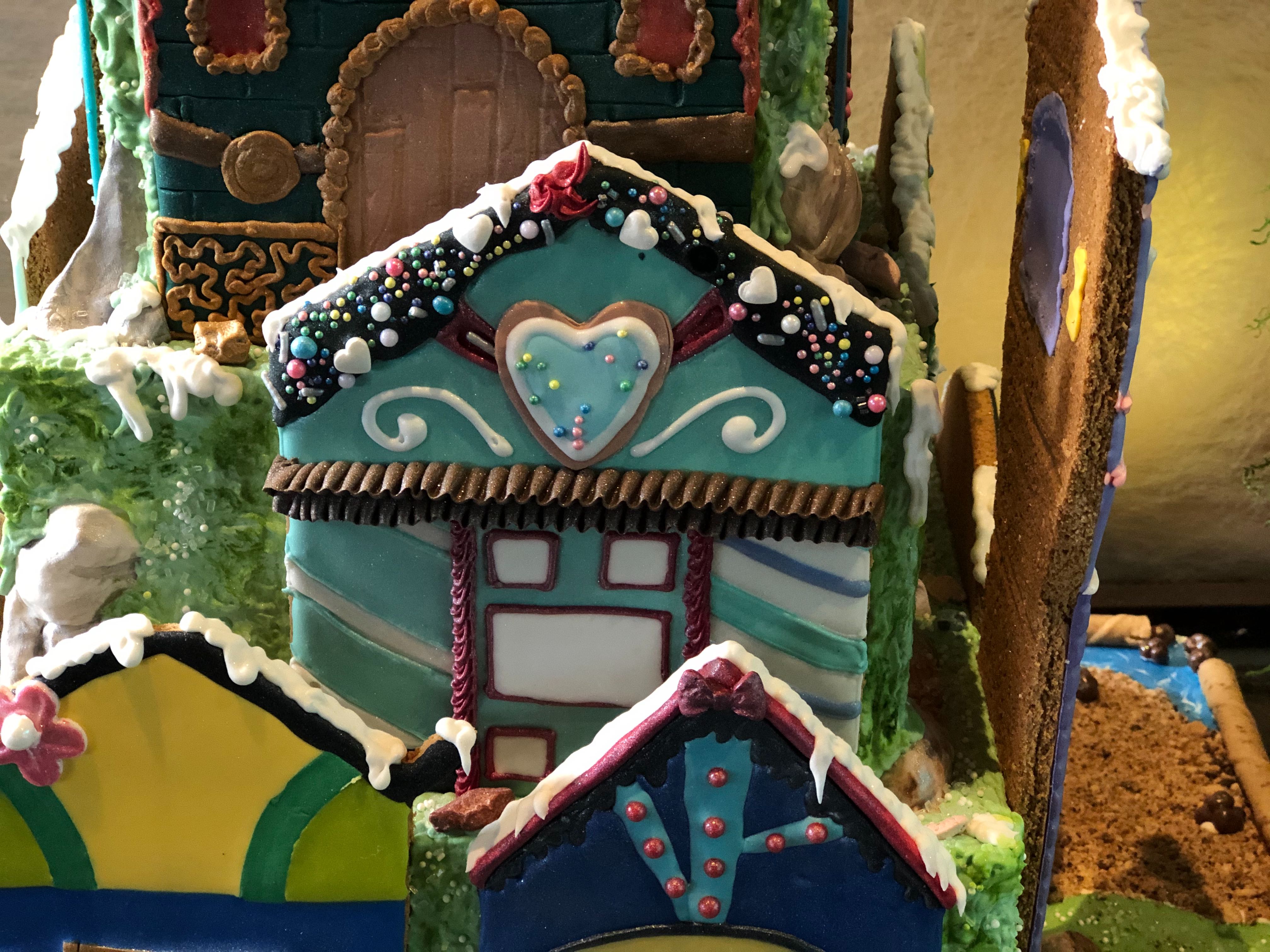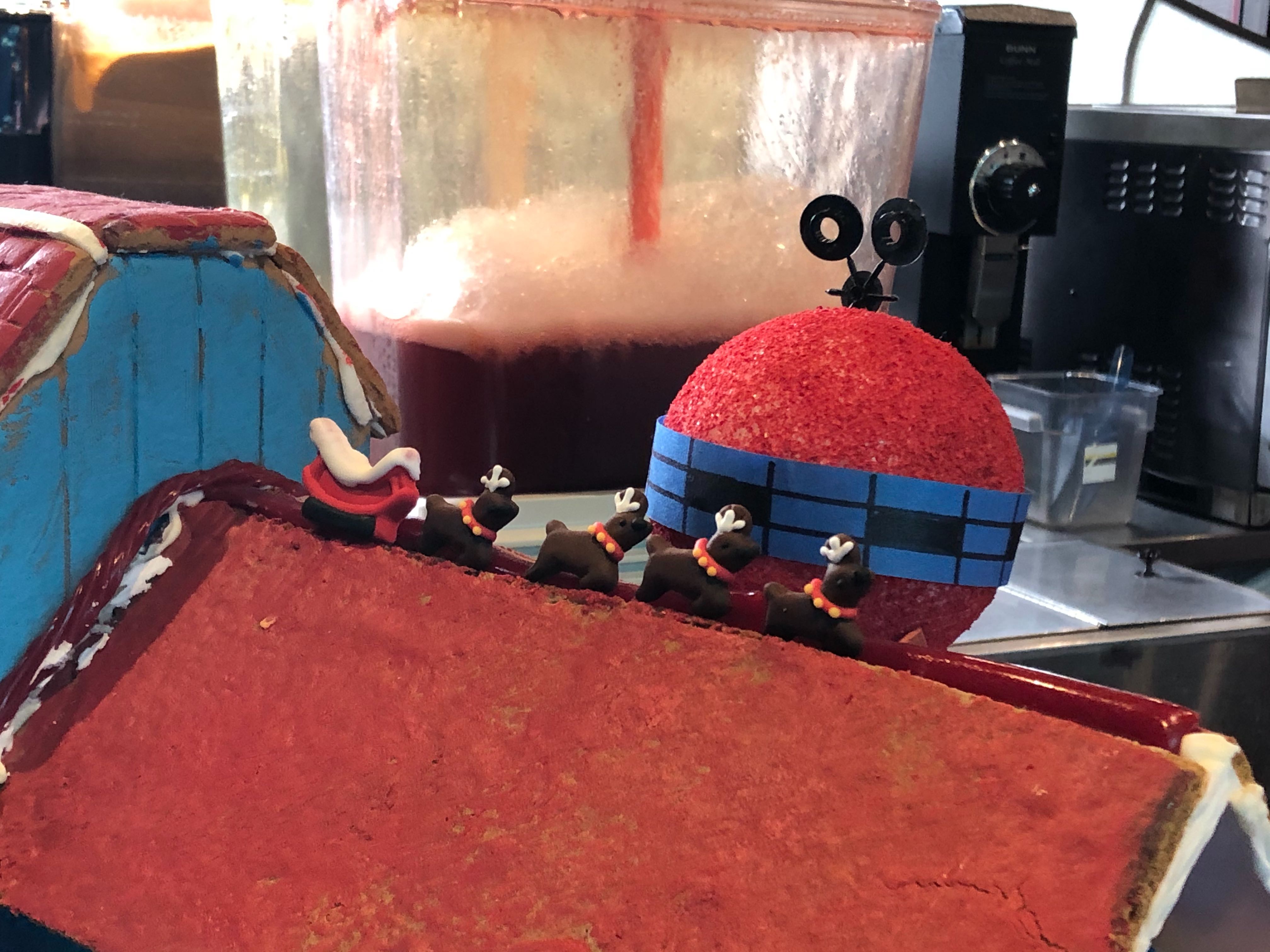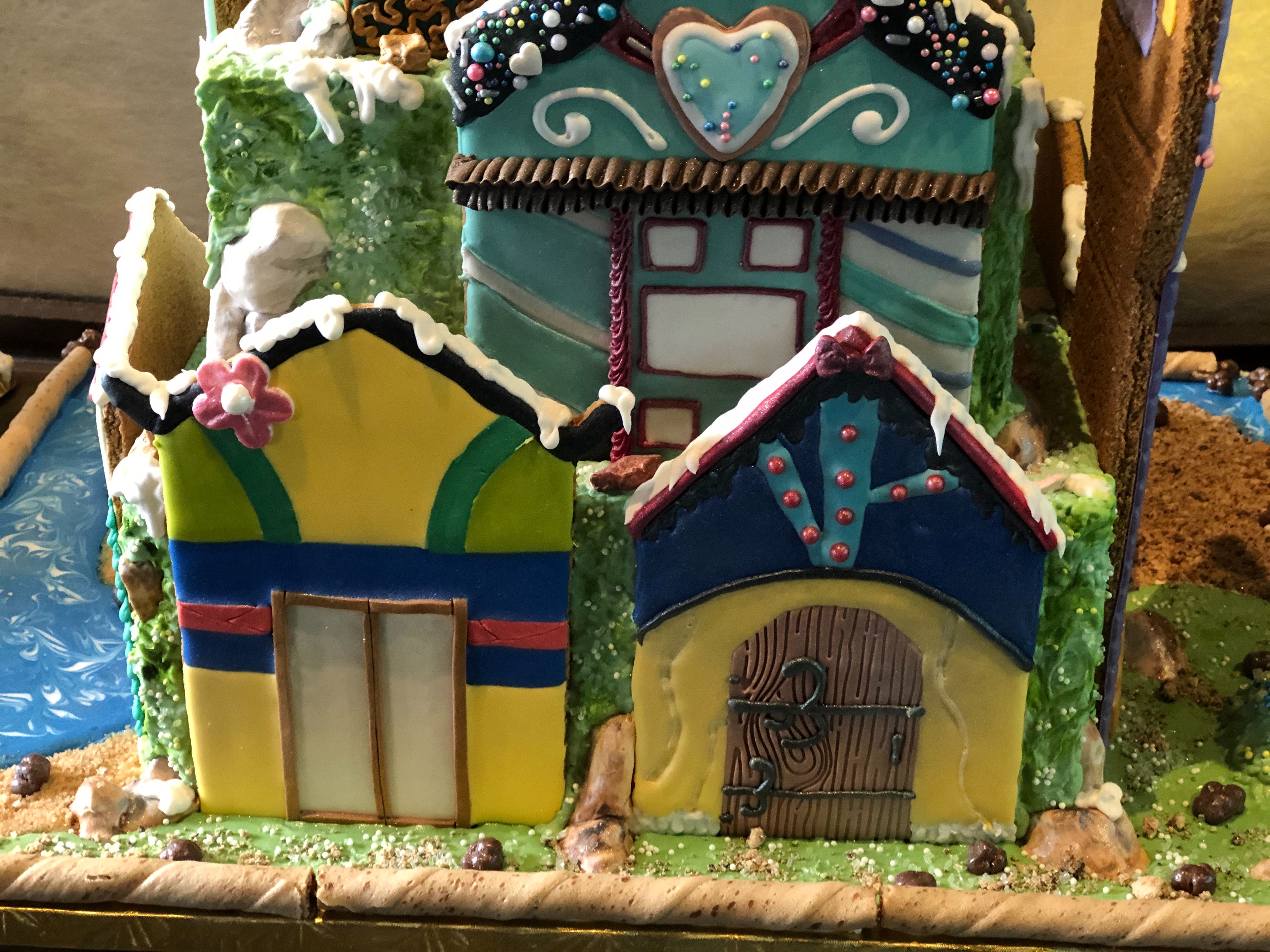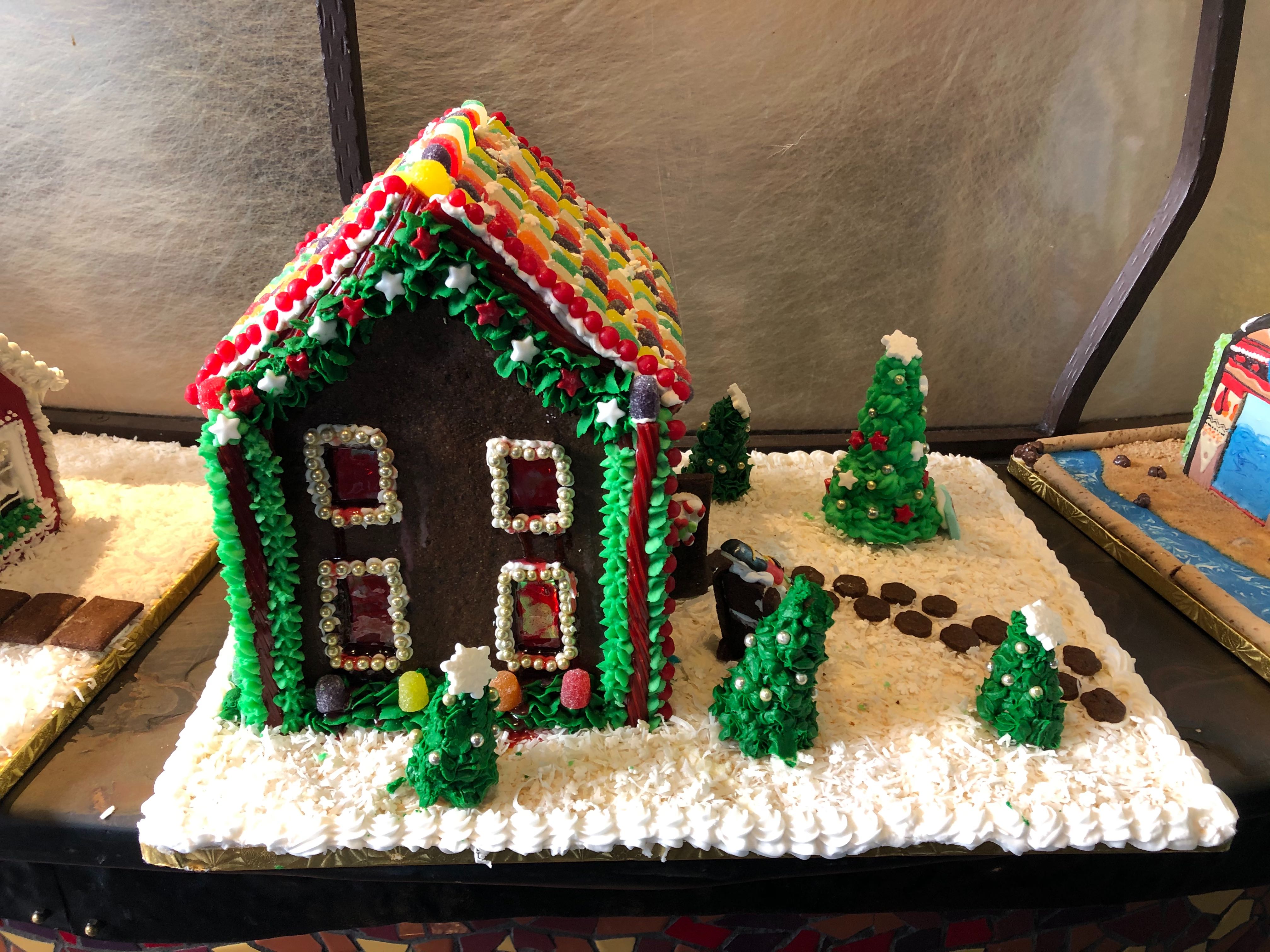 This display looks pretty detailed, and seems to be designed to look like the Polynesian Resort! There are chocolate tiki faces, surfboards, and Santa on the front. There is also some intricate graham cracker construction on the side that’s pretty impressive.