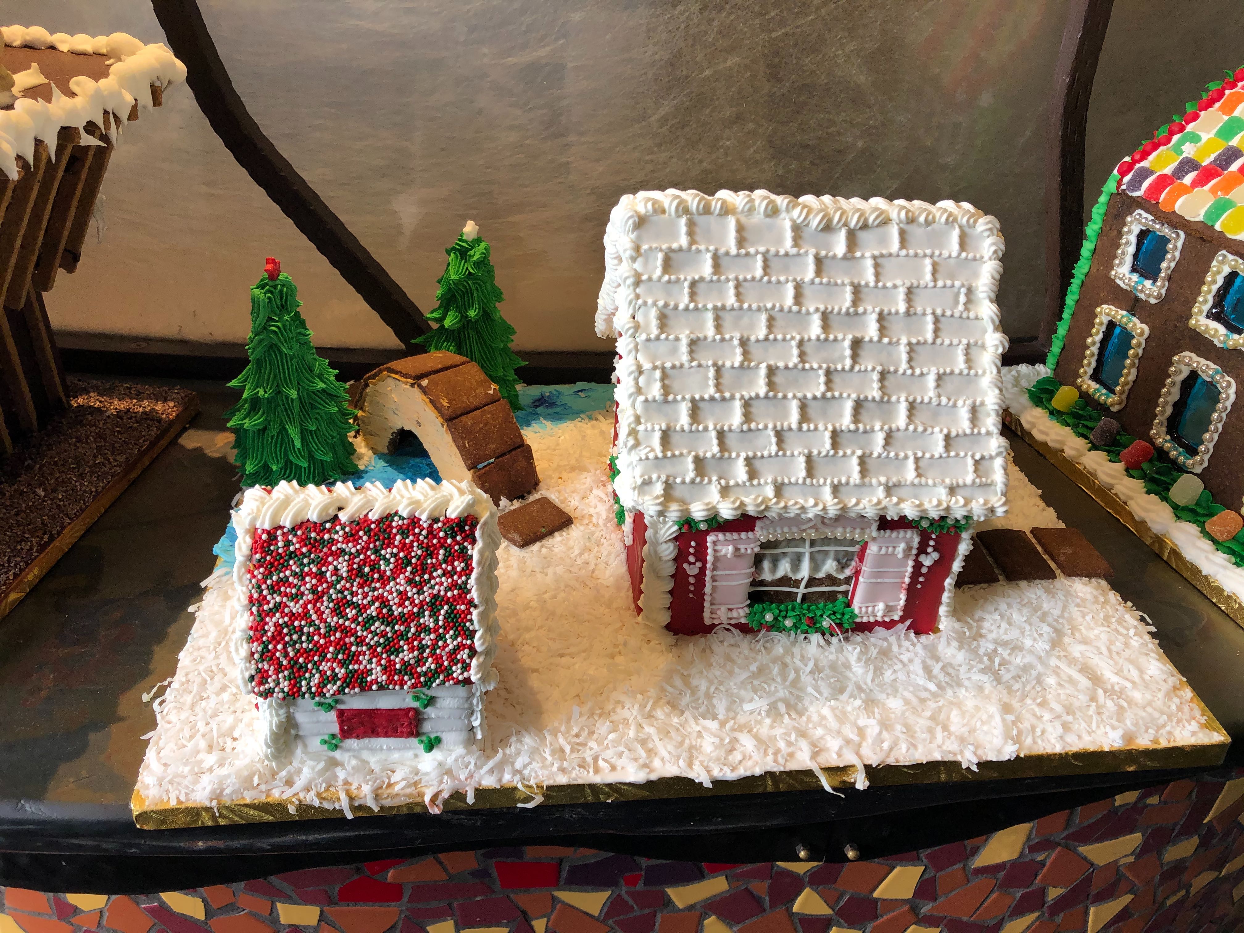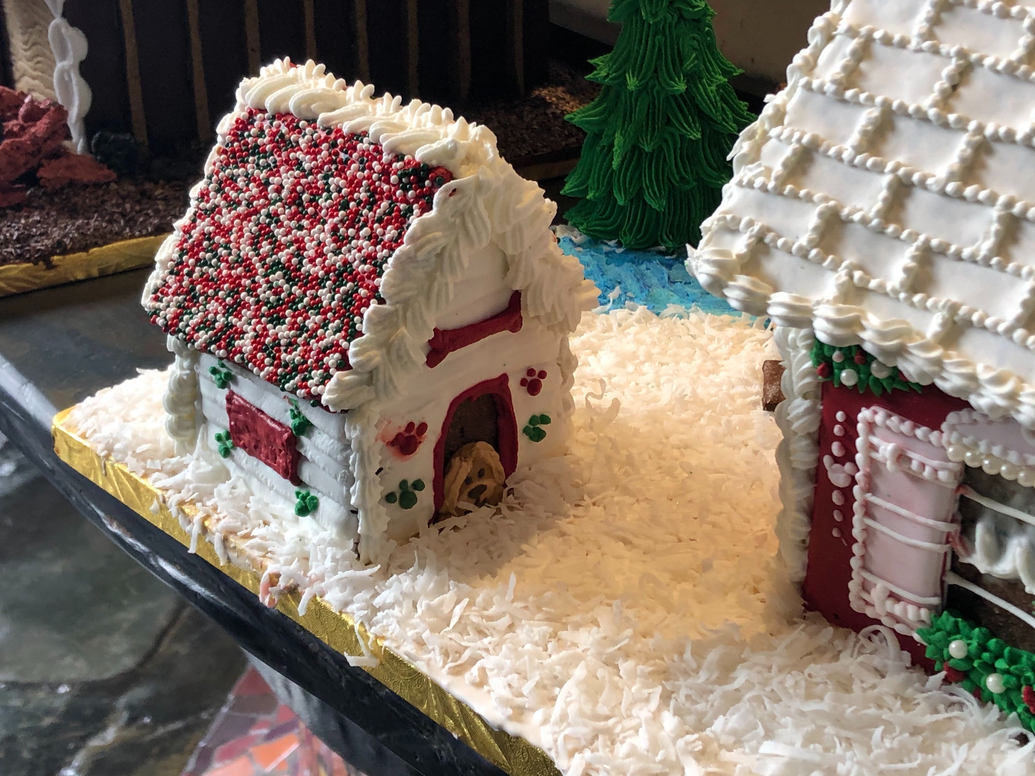 A tiny gingerbread cottage sits atop coconut snow. There’s even a dog house with a dog outside.