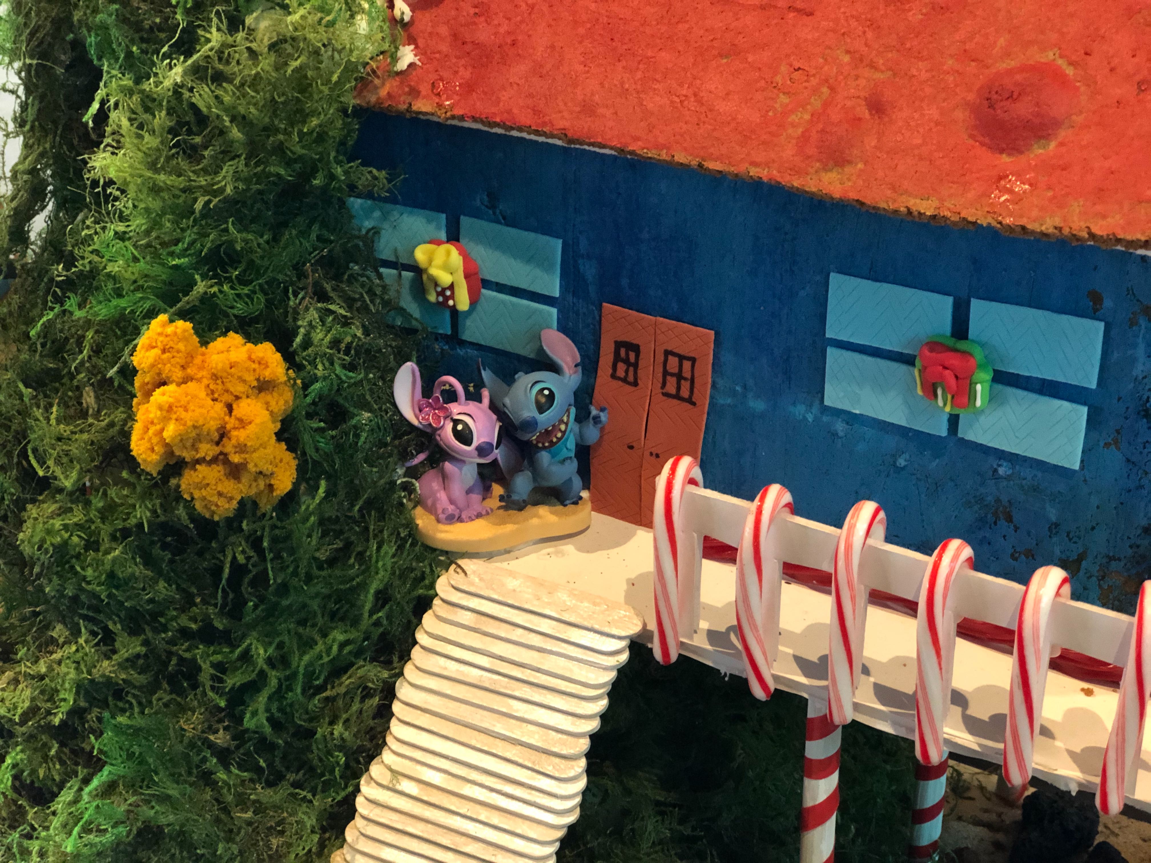This Lilo and Stitch inspired display is beautiful. You can find Stitch, Angel, and Lilo hanging out on the stairs outside of the front door. Nani and Lilo’s house is decorated perfectly, and even has reindeer and a sleigh on the roof.