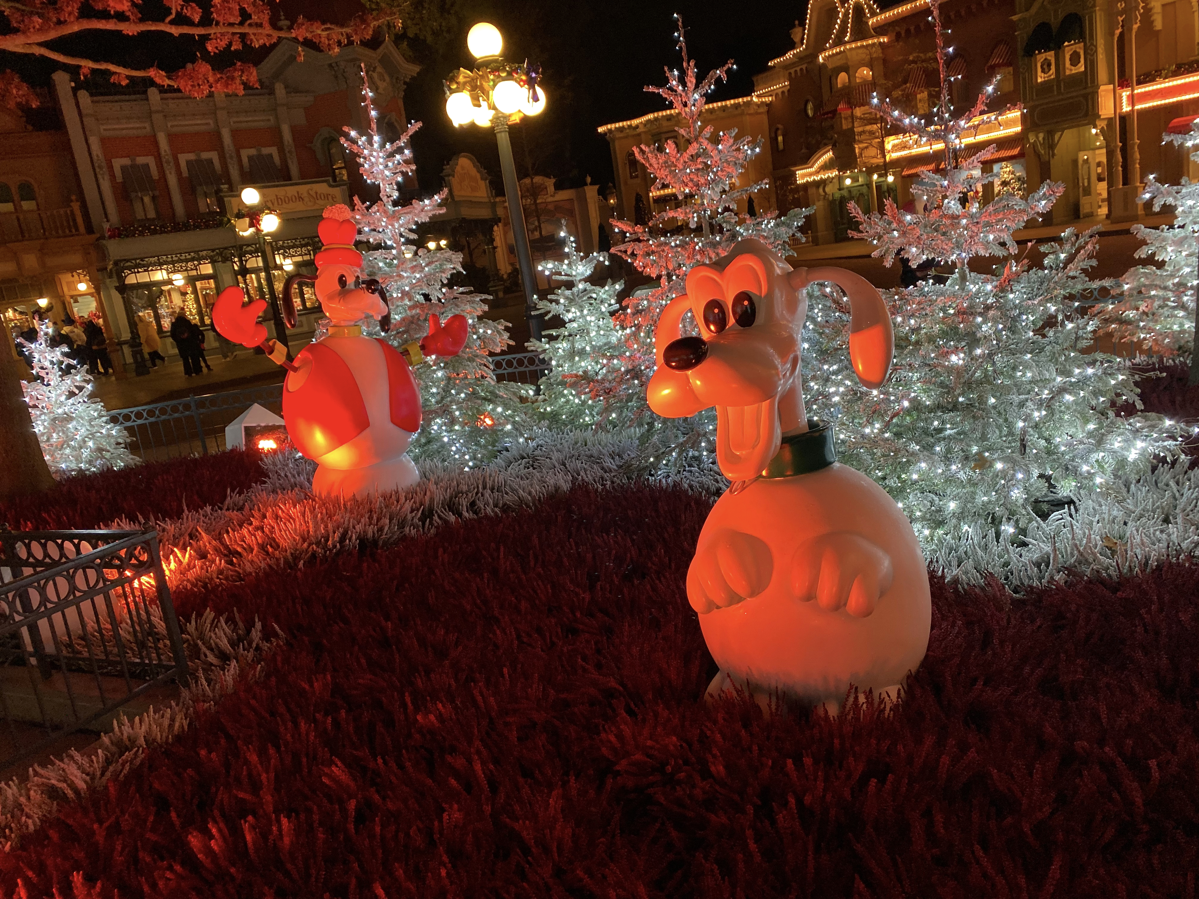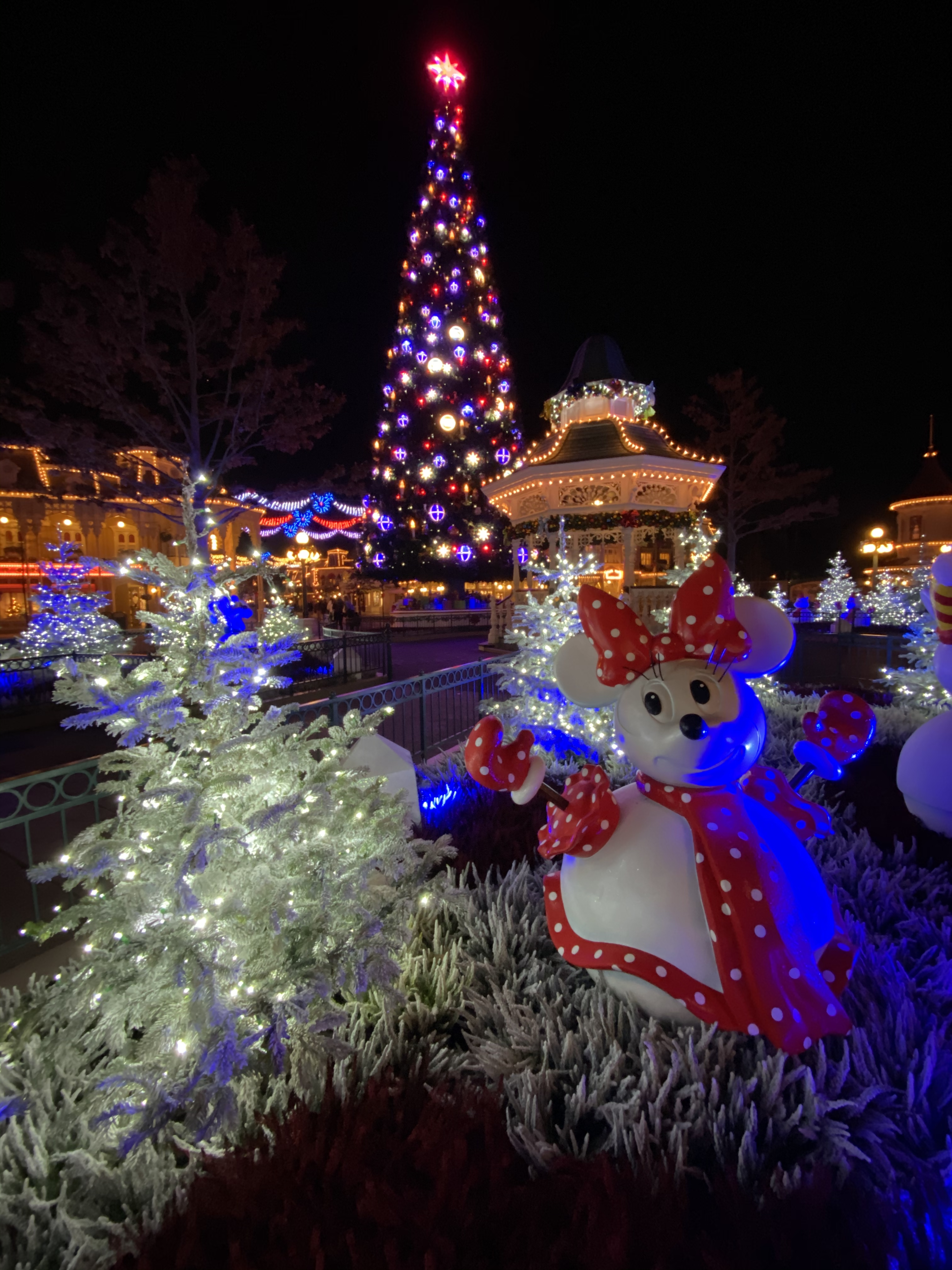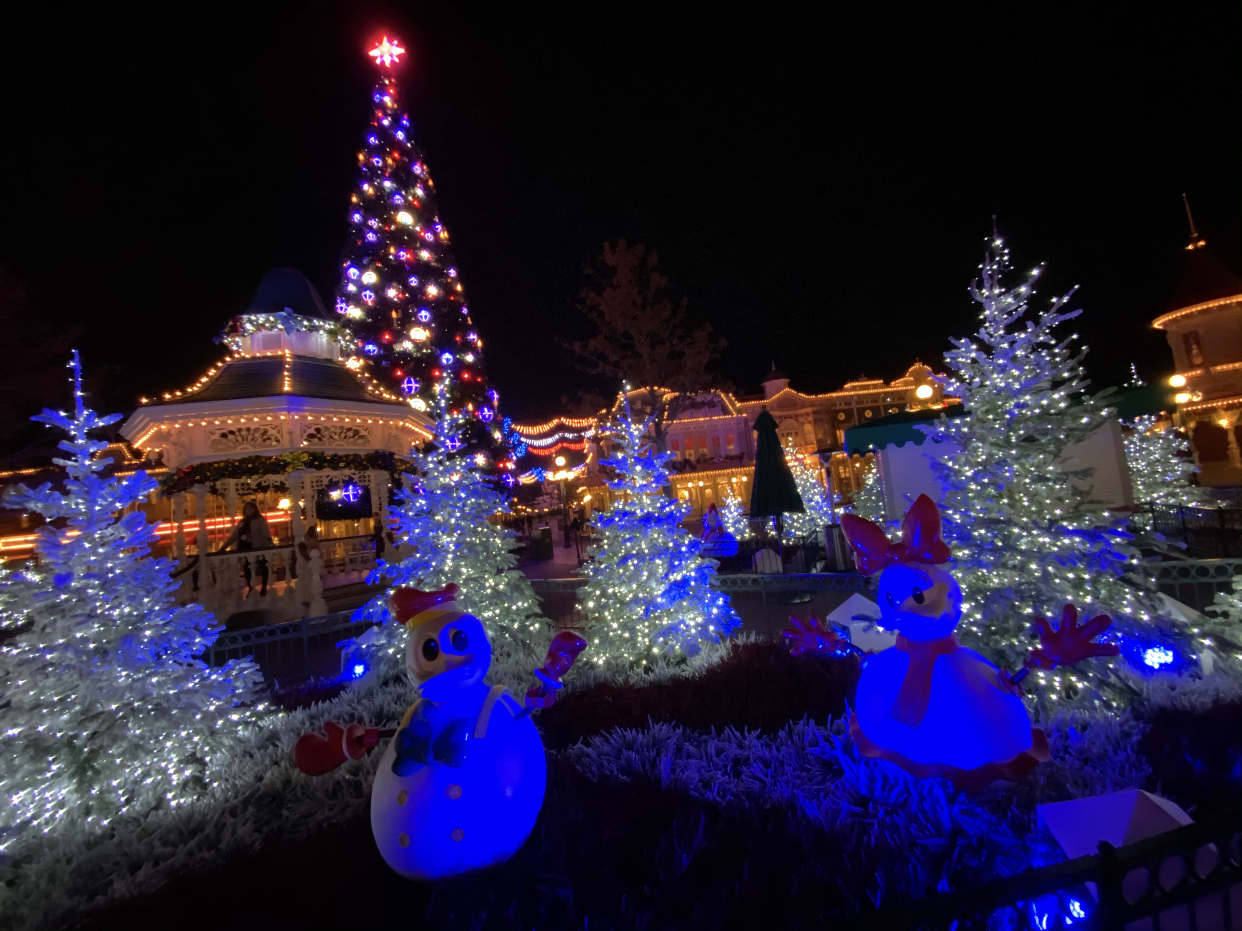 In true elegant fashion, all of Town Square and Main Street are decked out in frosty white illuminated pines, character snowmen, and garland-covered gazebos.