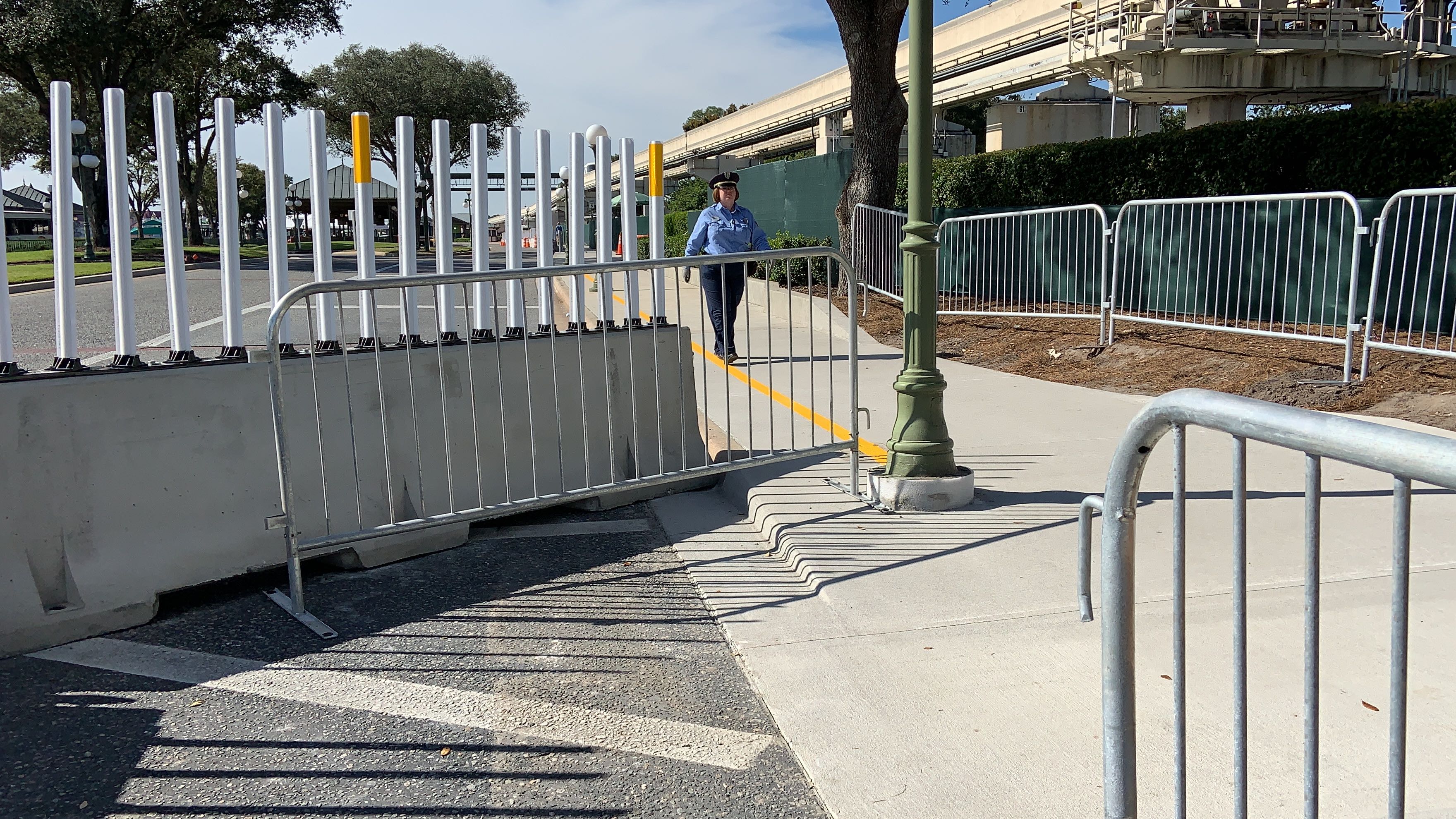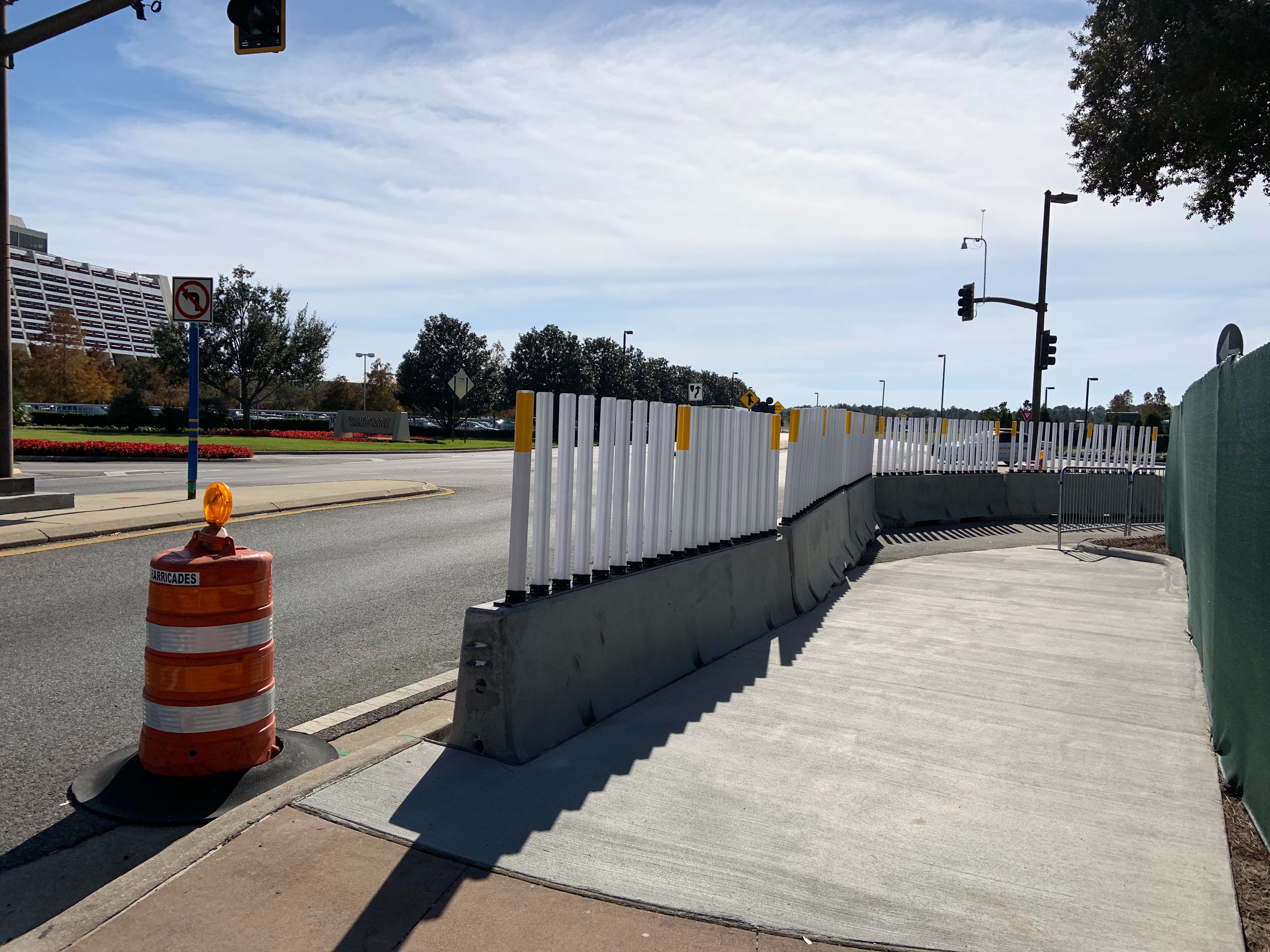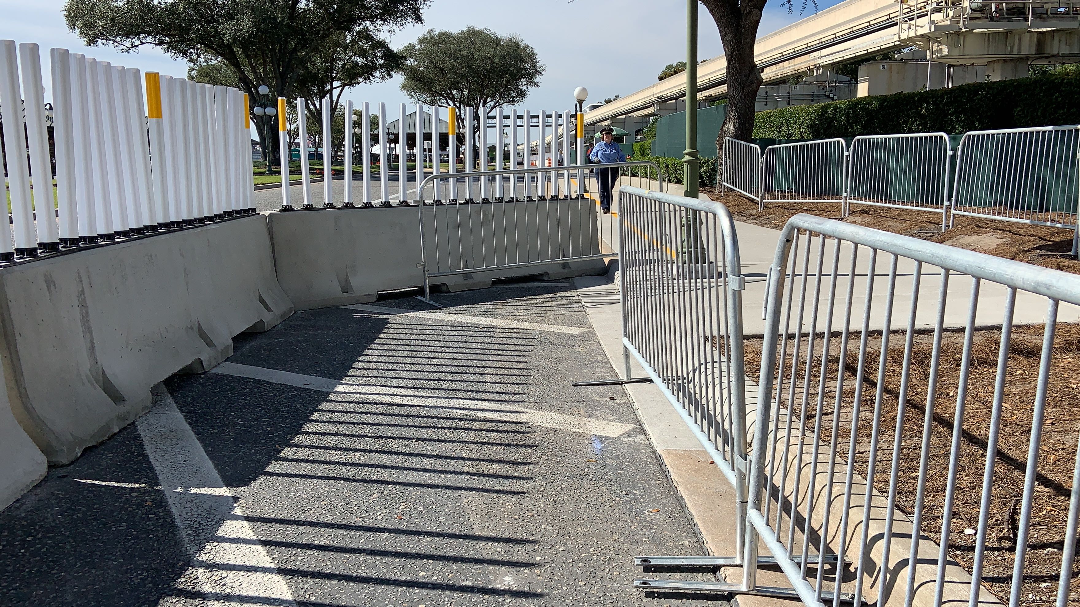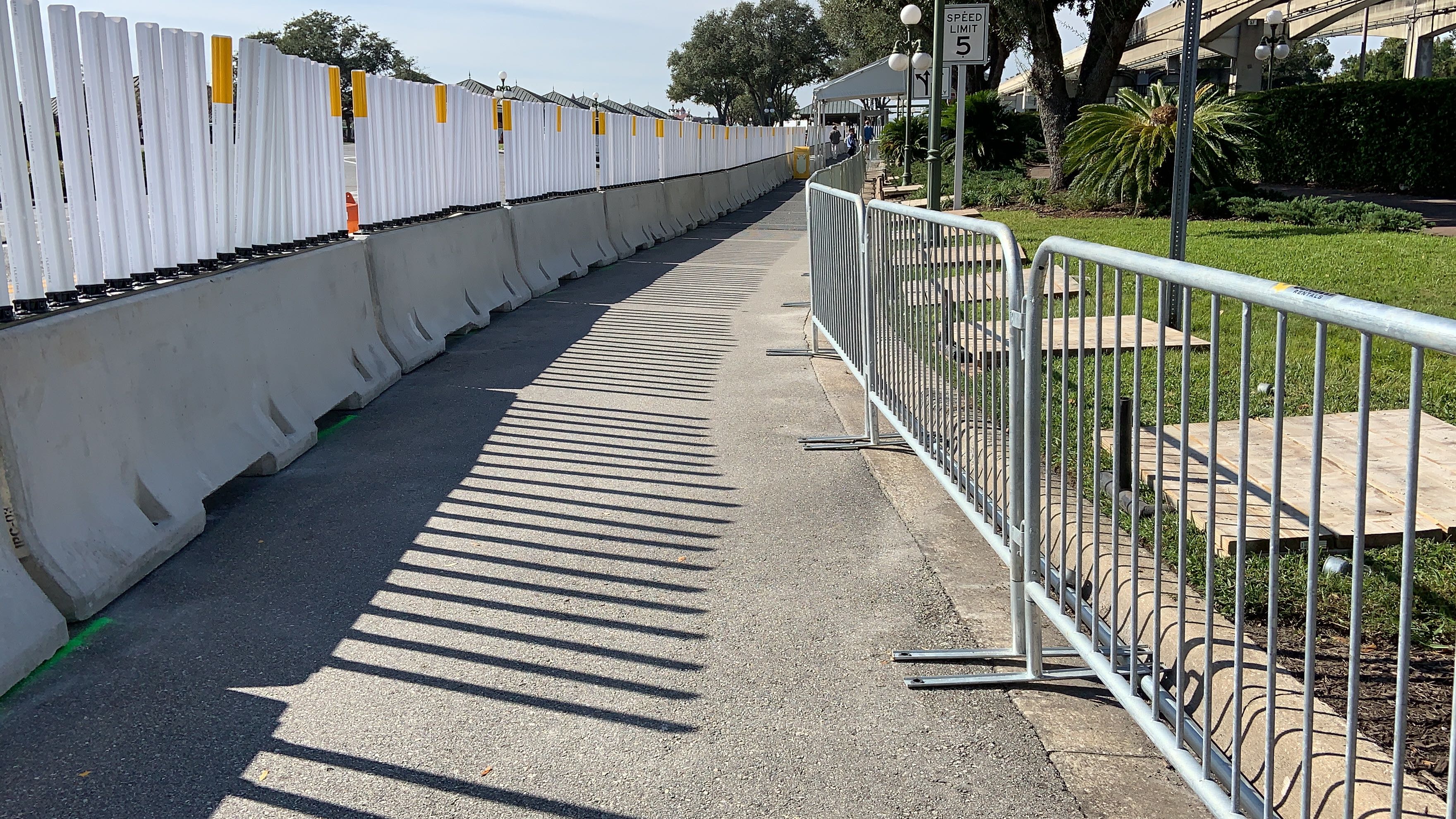 Now, instead of walking over on the Walk Around The World brick pathway, you take this plain concrete sidewalk over. The new walkway is lined with concrete barriers and some flexible, reflective white and yellow barriers at the top.