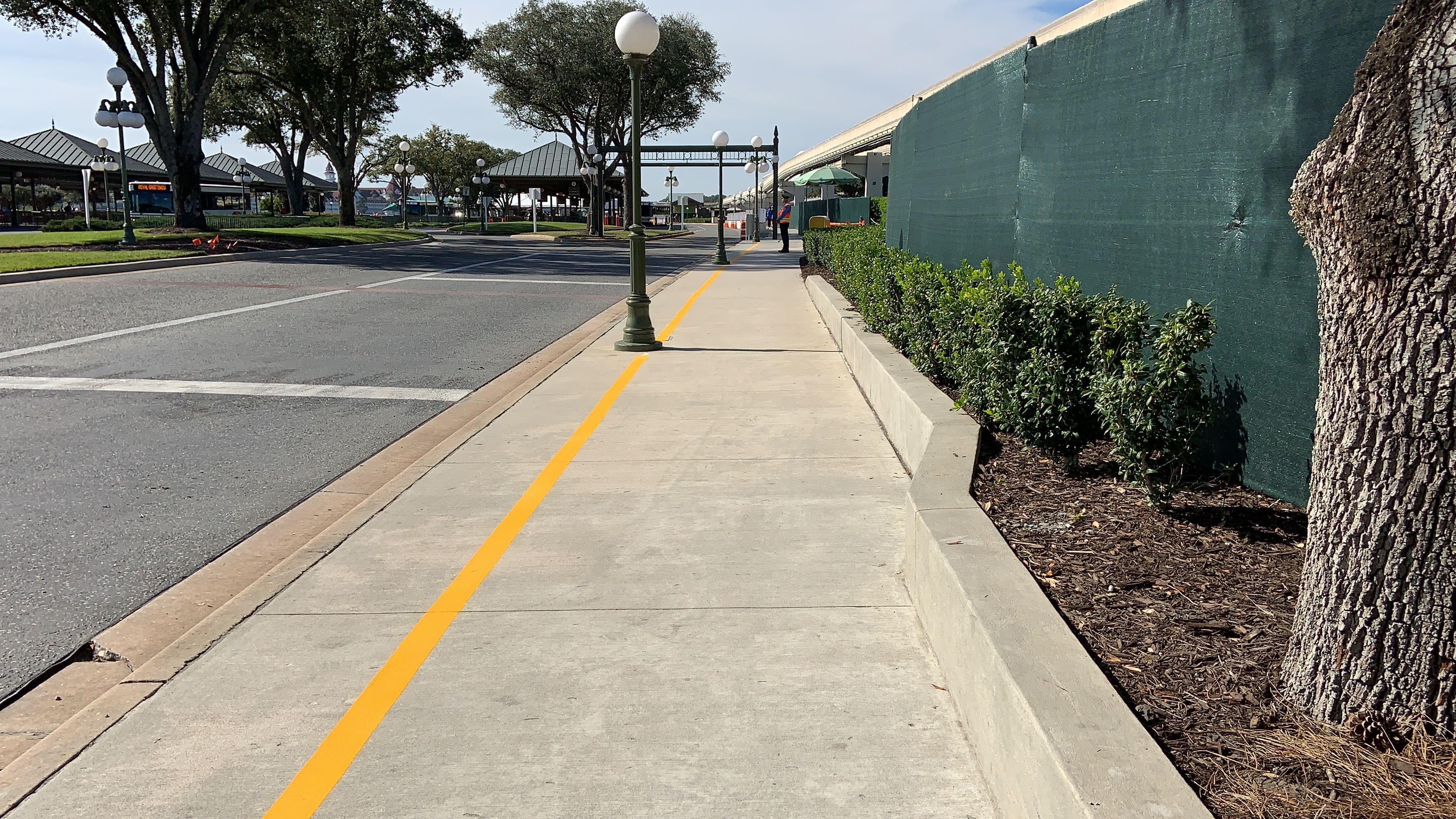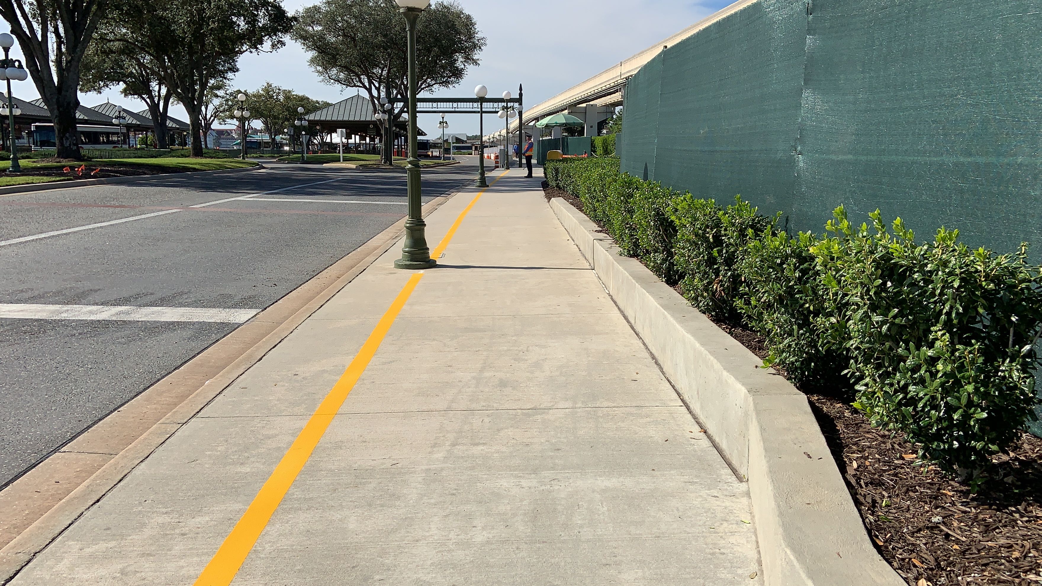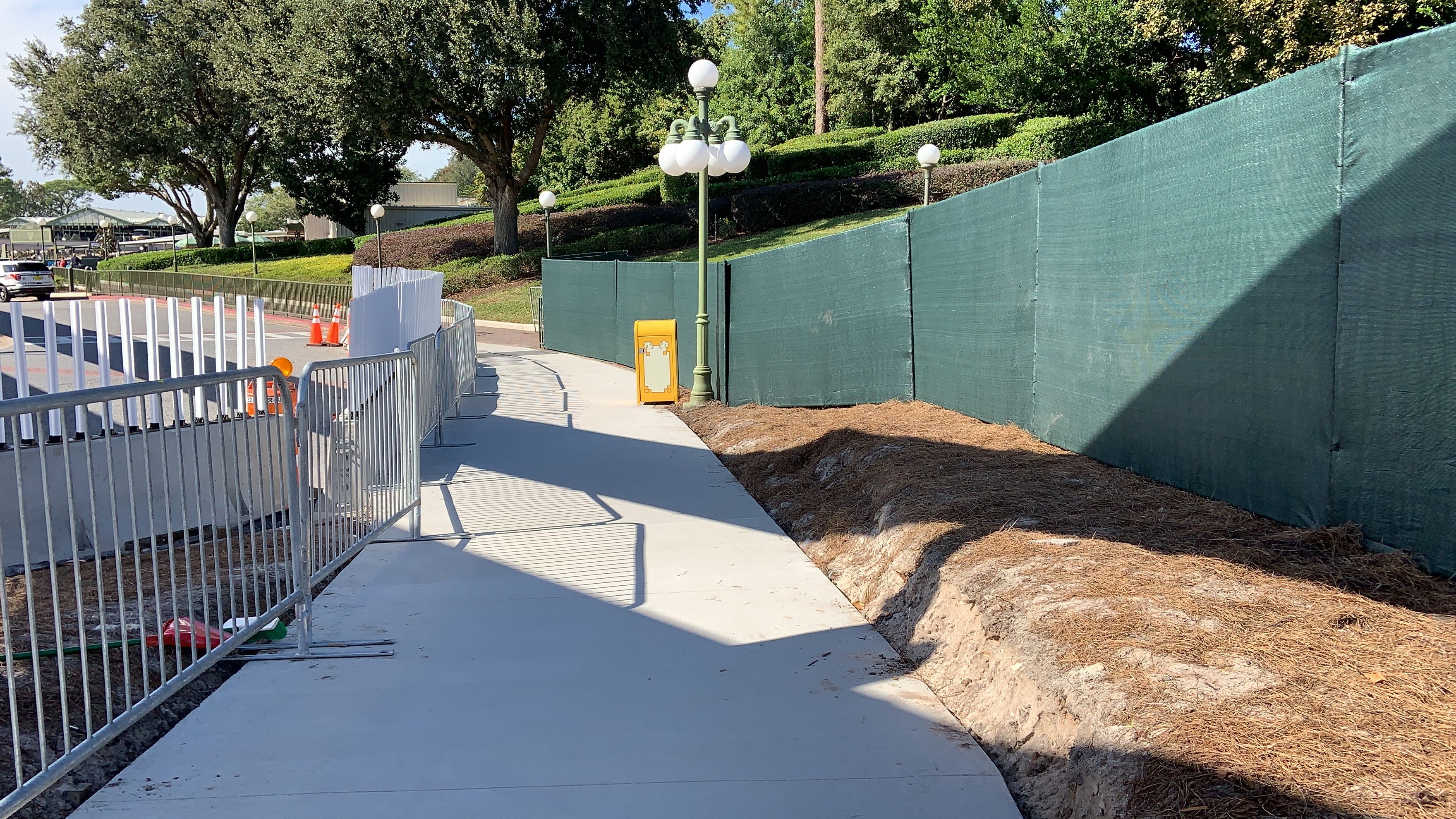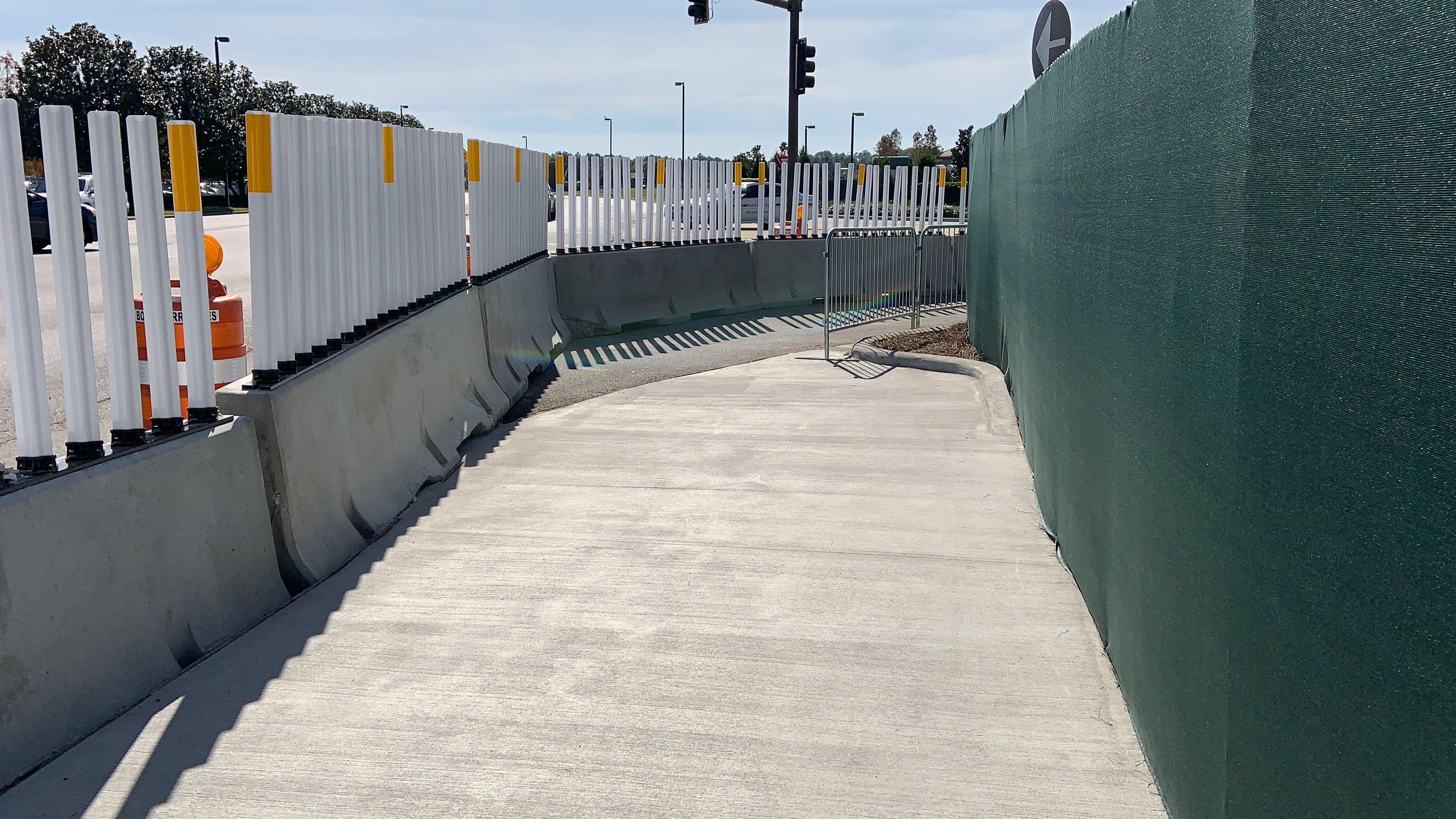 Now, instead of walking over on the Walk Around The World brick pathway, you take this plain concrete sidewalk over. The new walkway is lined with concrete barriers and some flexible, reflective white and yellow barriers at the top.