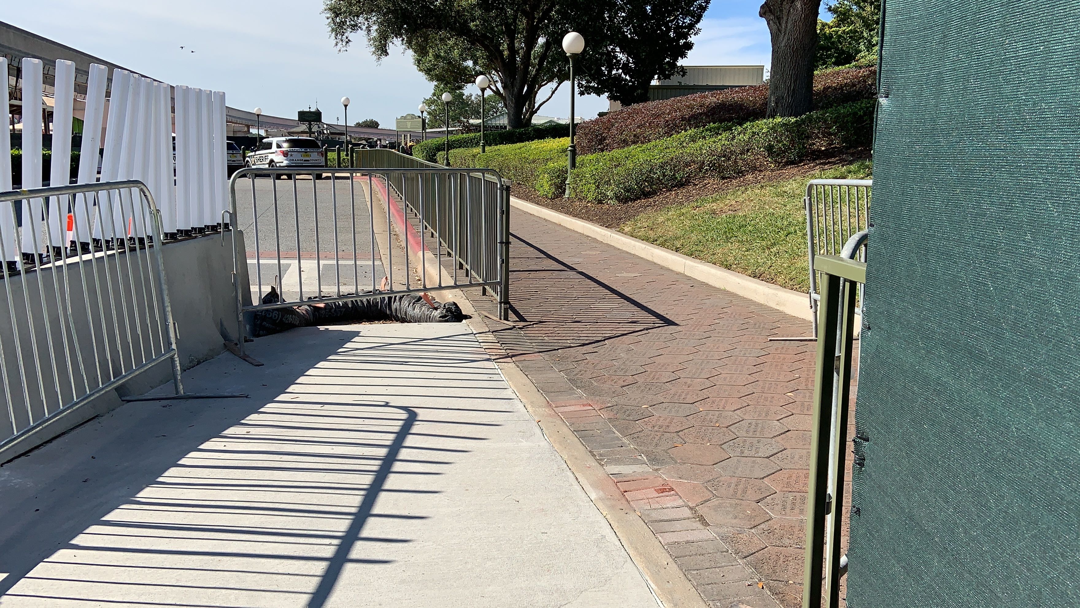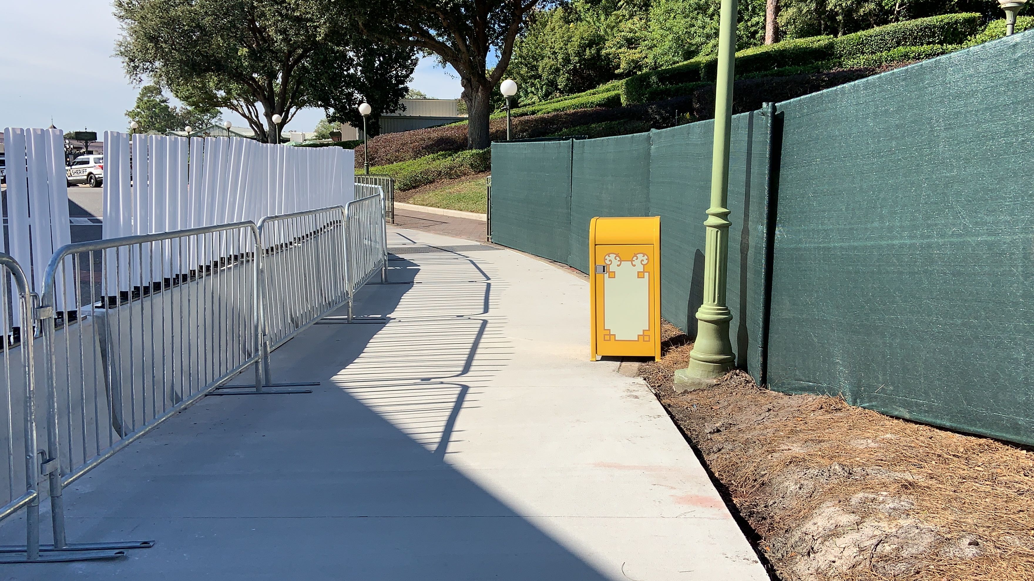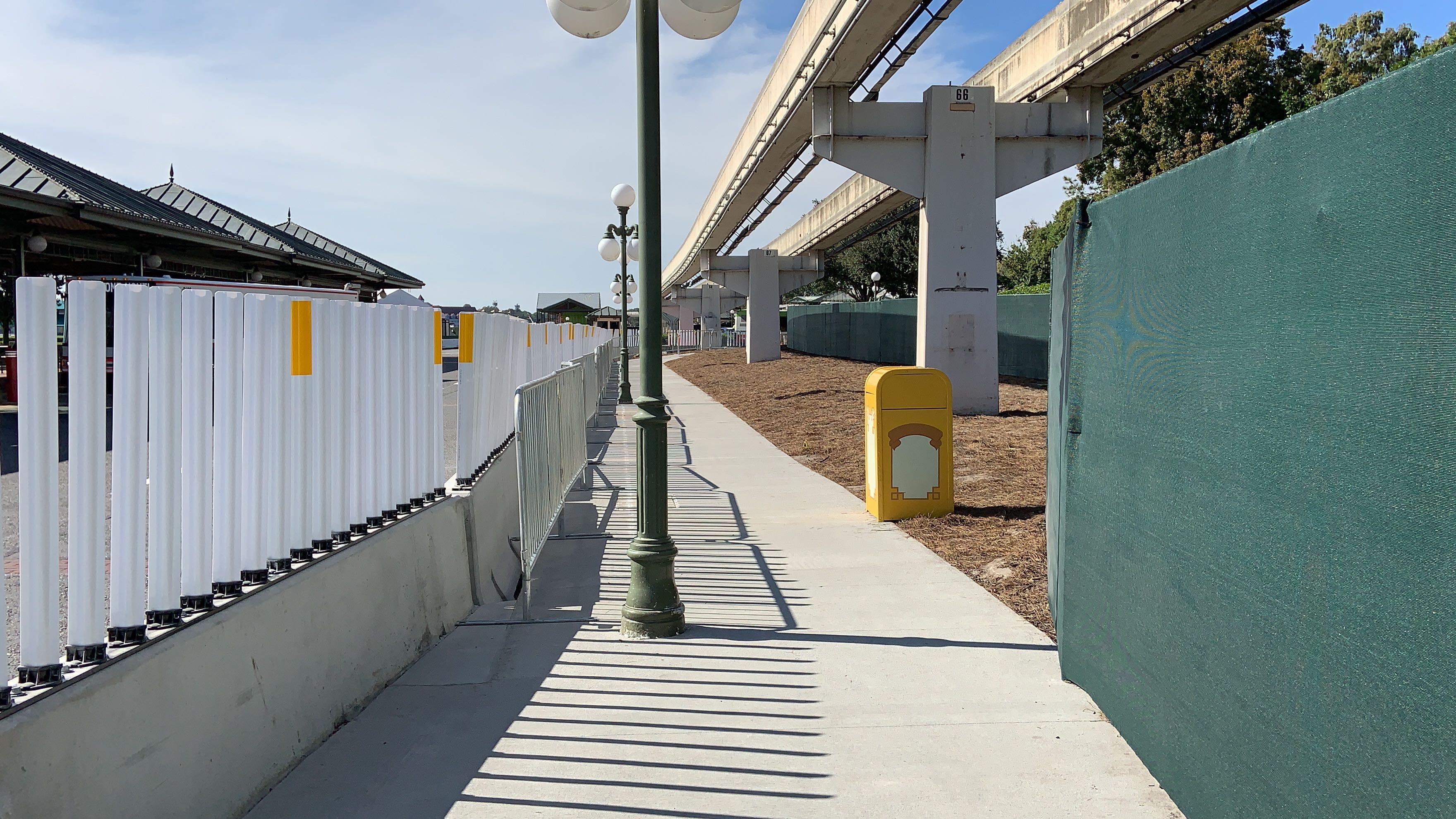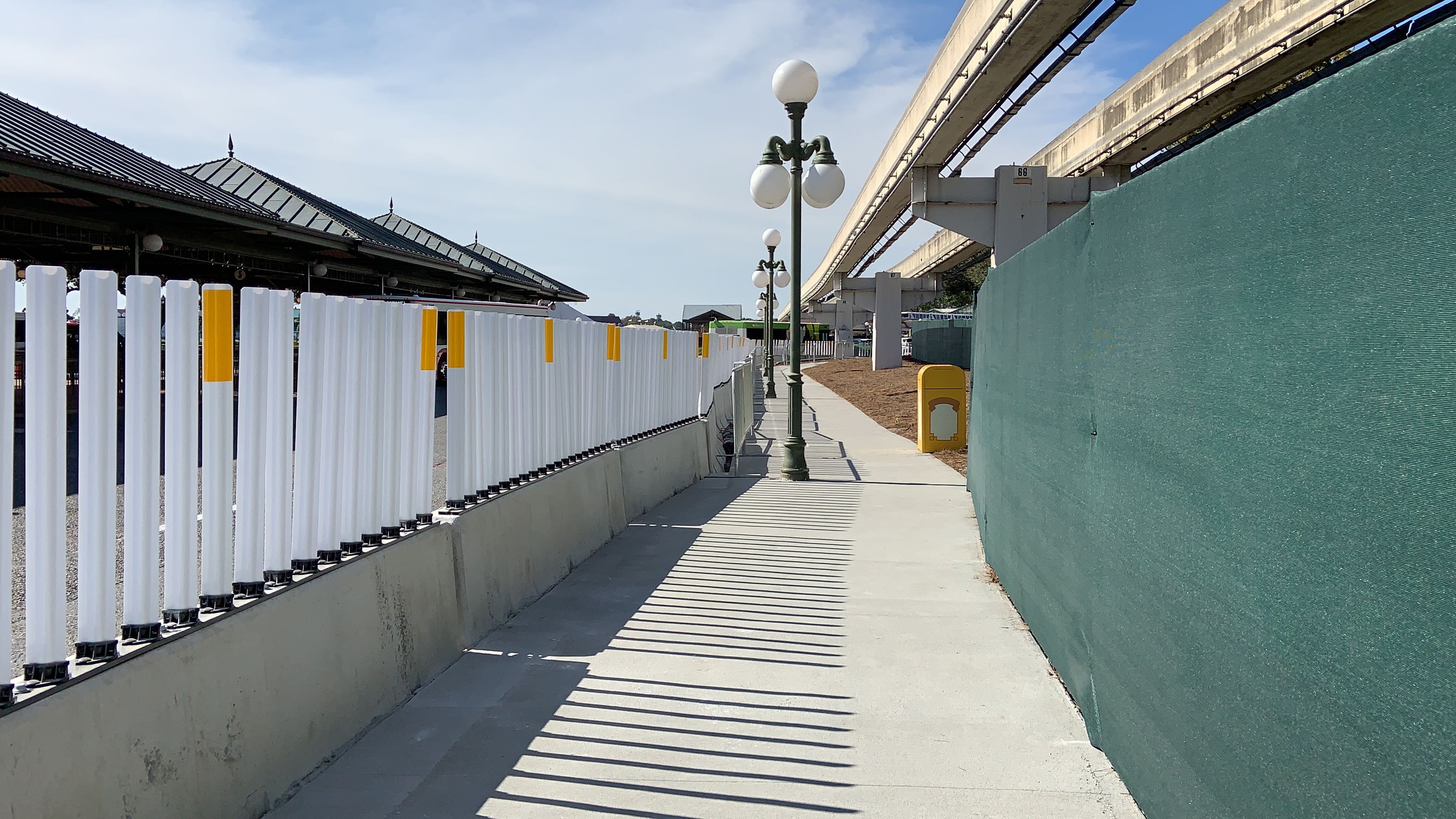 Now, instead of walking over on the Walk Around The World brick pathway, you take this plain concrete sidewalk over. The new walkway is lined with concrete barriers and some flexible, reflective white and yellow barriers at the top.