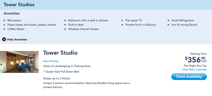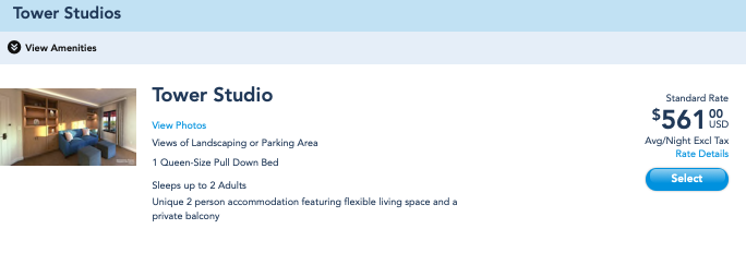 Out of curiosity, I priced out a stay checking in tomorrow at the standard rate. $561 a night for a Tower Studio seems ludicrous, especially considering that you could stay at many other classic Deluxe resorts, in a Standard or even Preferred View room, at this price.
