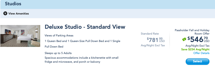 In fact, you could upgrade to a Deluxe Studio, which features an extra bath, a full-sized balcony, and sleeps five for about the same price, give or take an AP/DVC/Florida Resident, or other seasonal room-only discount.