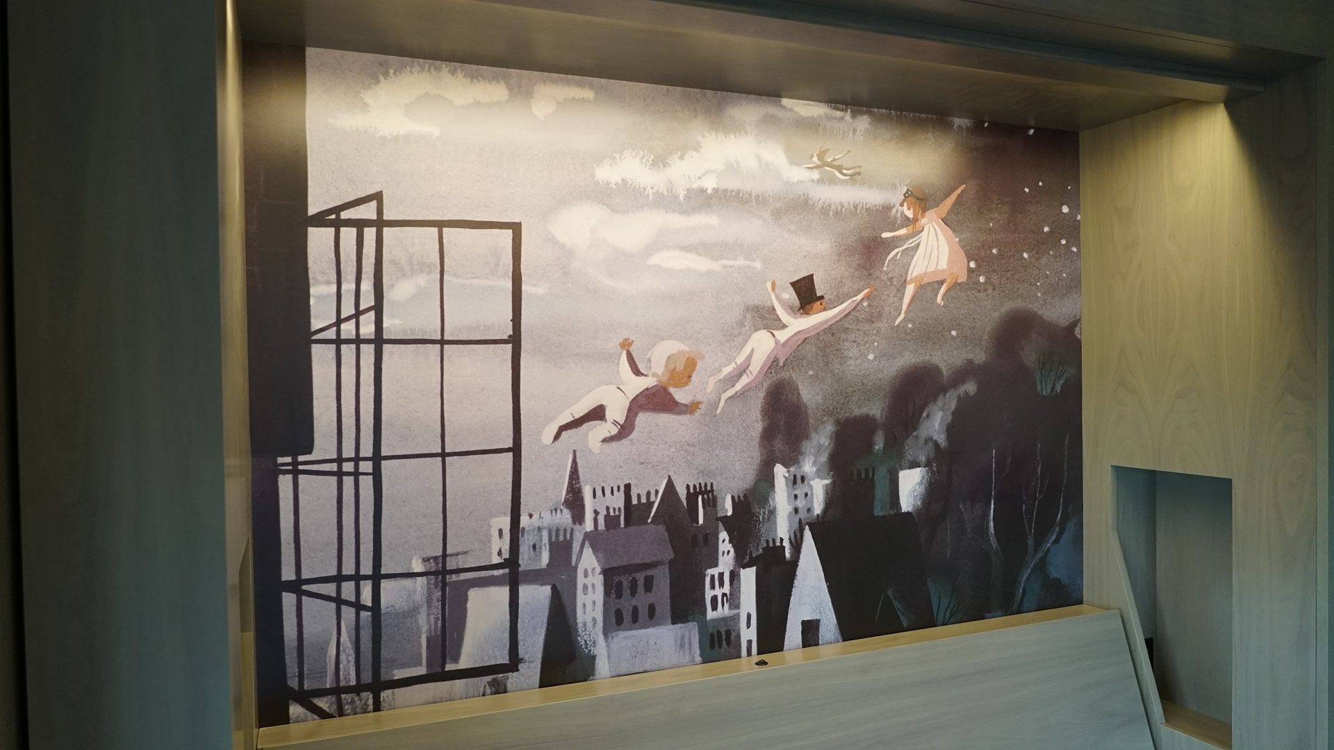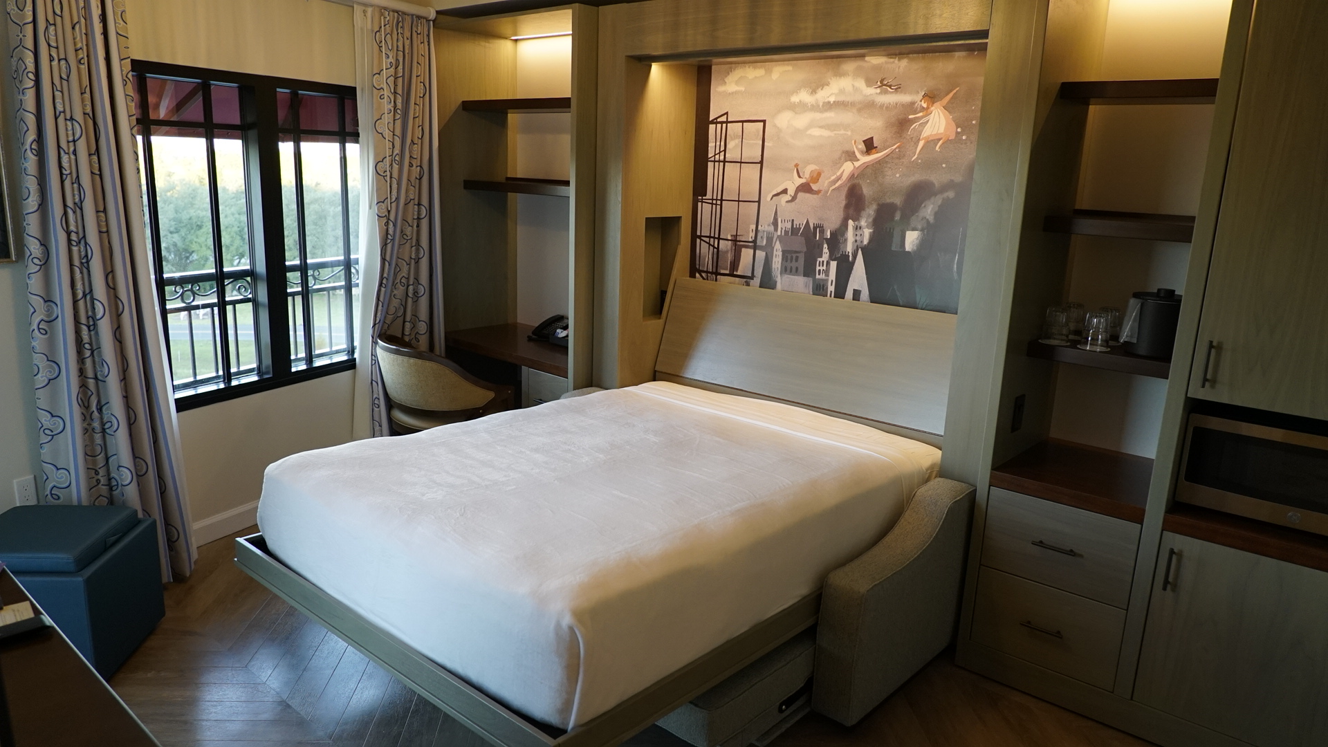 If it were up to me, I’d just leave the bed down all day. The whimsical Peter Pan artwork adds some depth to the room, versus just being a sofa and a grey-green wall.