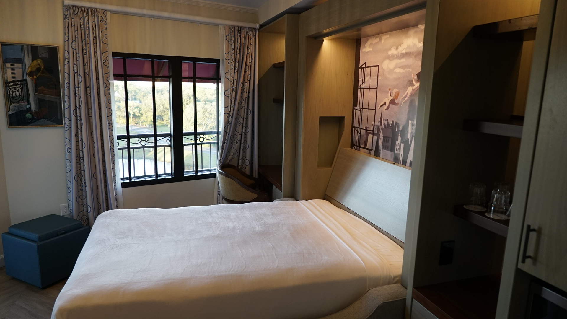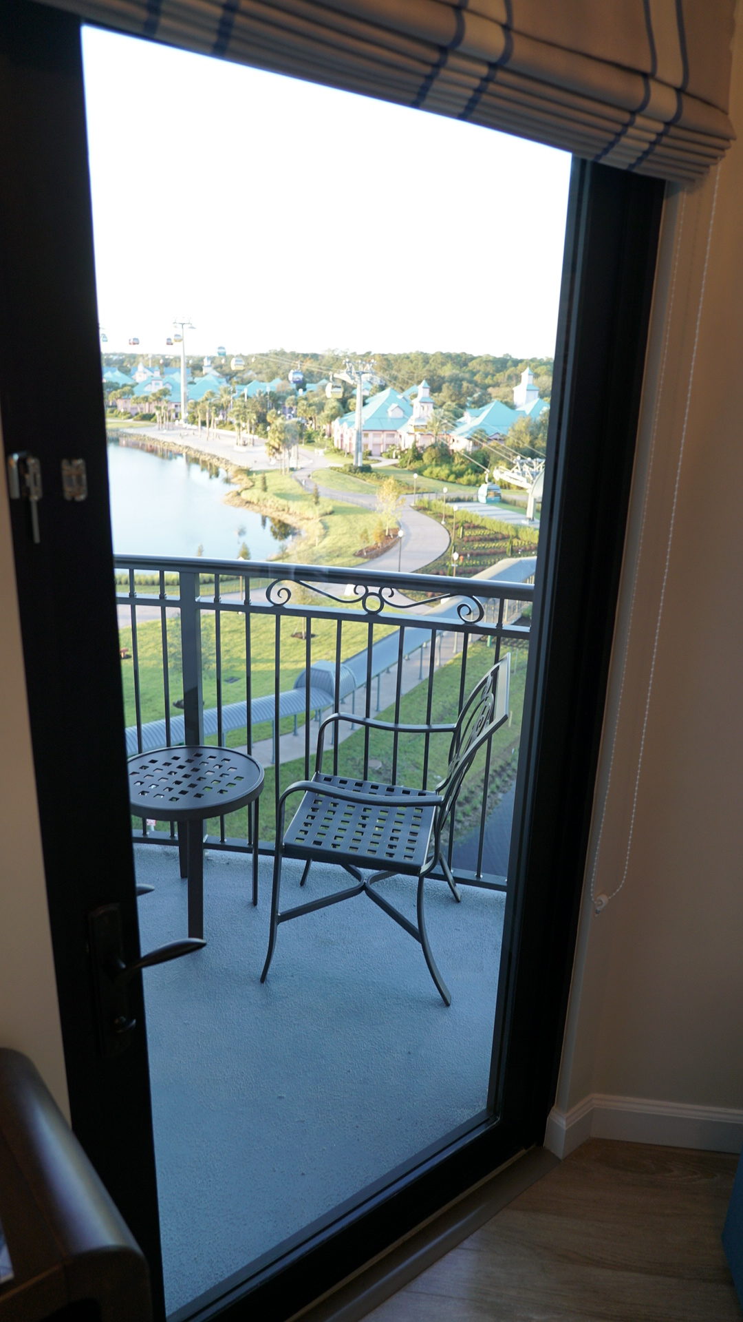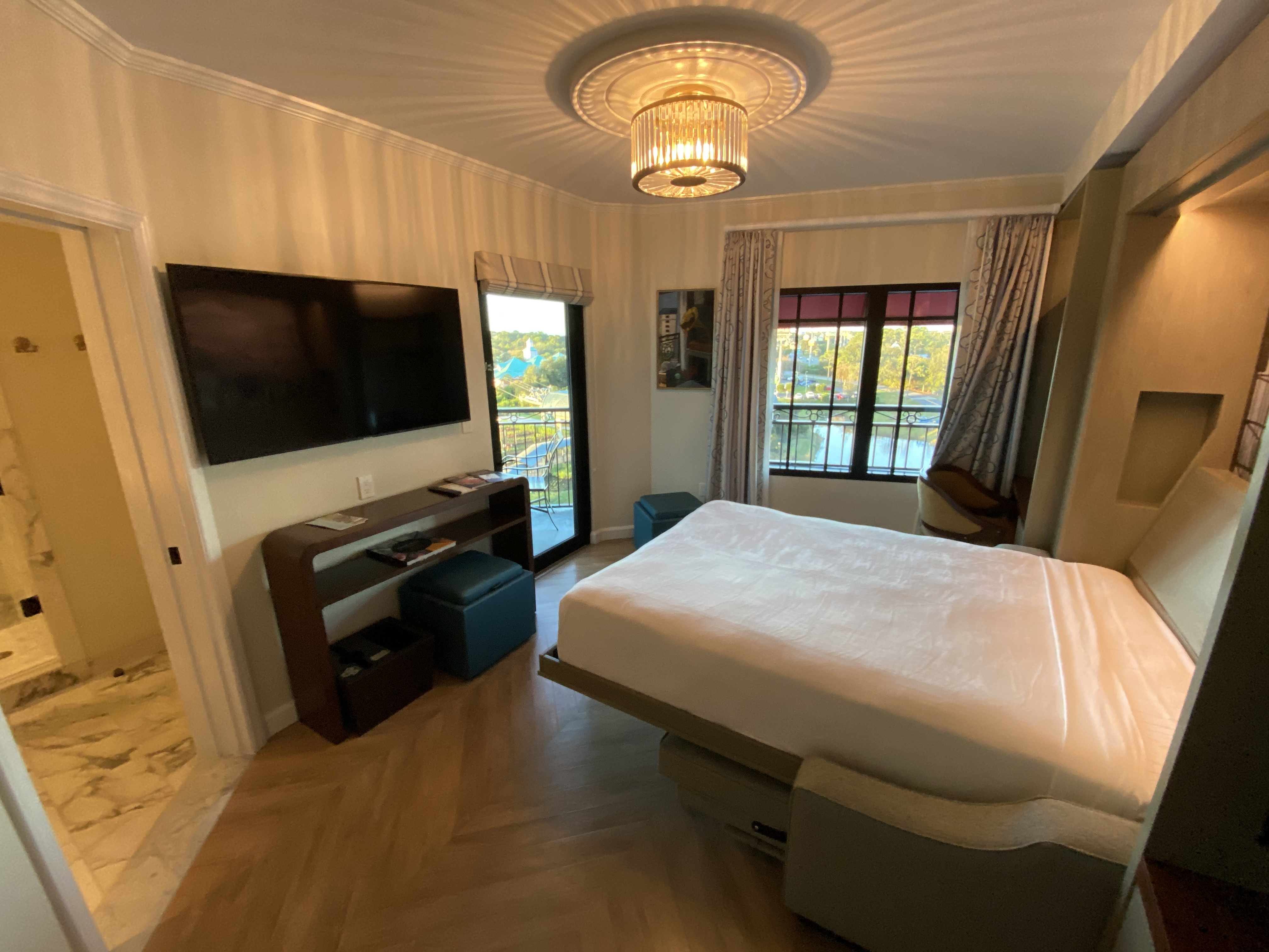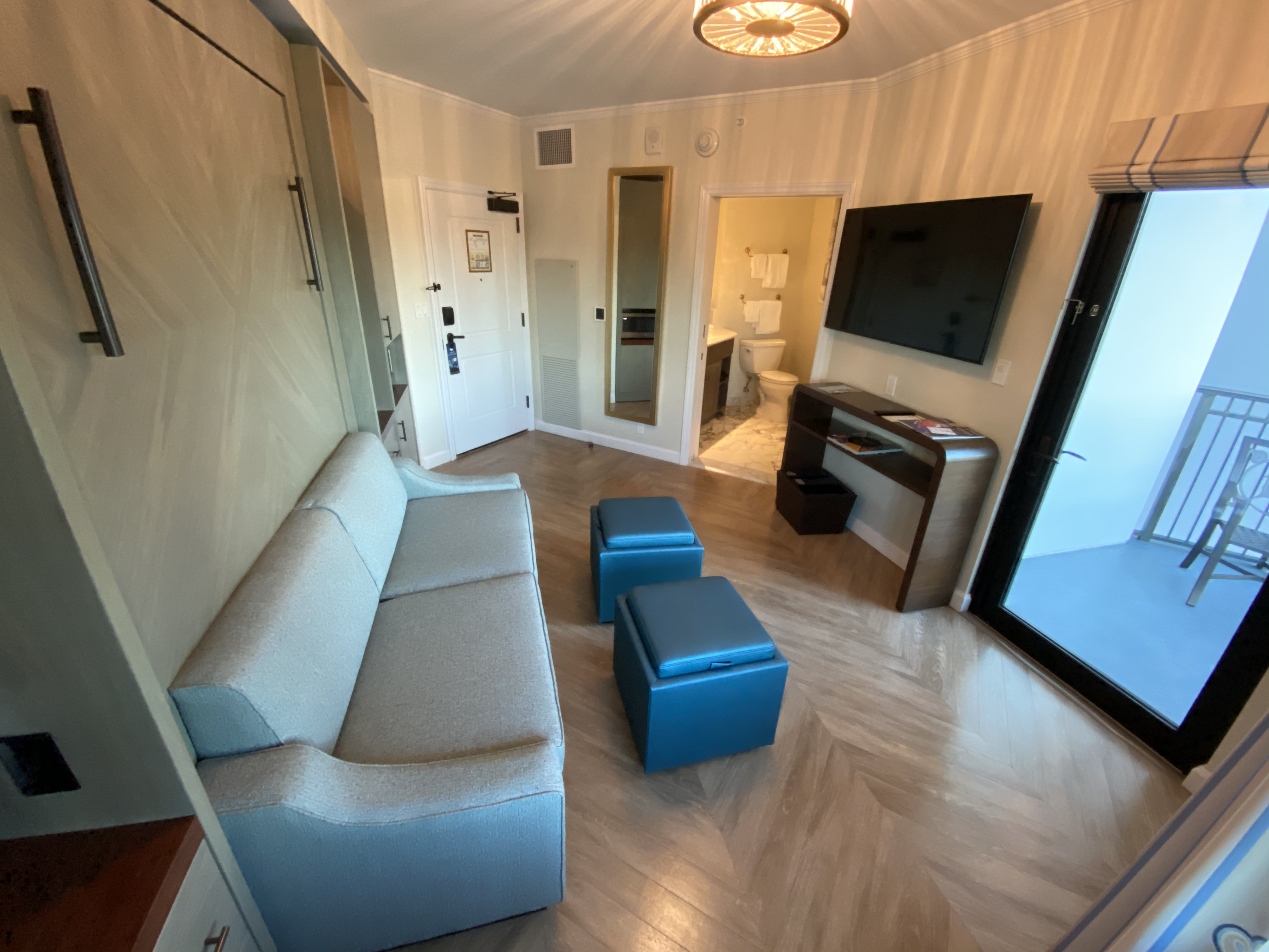 Here’s a look outside at the near Juliette-style balcony, which features great views of the Disney Skyliner, Hollywood Studios, and EPCOT areas. Considering their size, the balconies in these rooms are less about getting you outdoors and more about bringing light and kinetics, and a sense of being outdoors, into the small, closet-like main living room. They also provide reasonable views of fireworks at night: