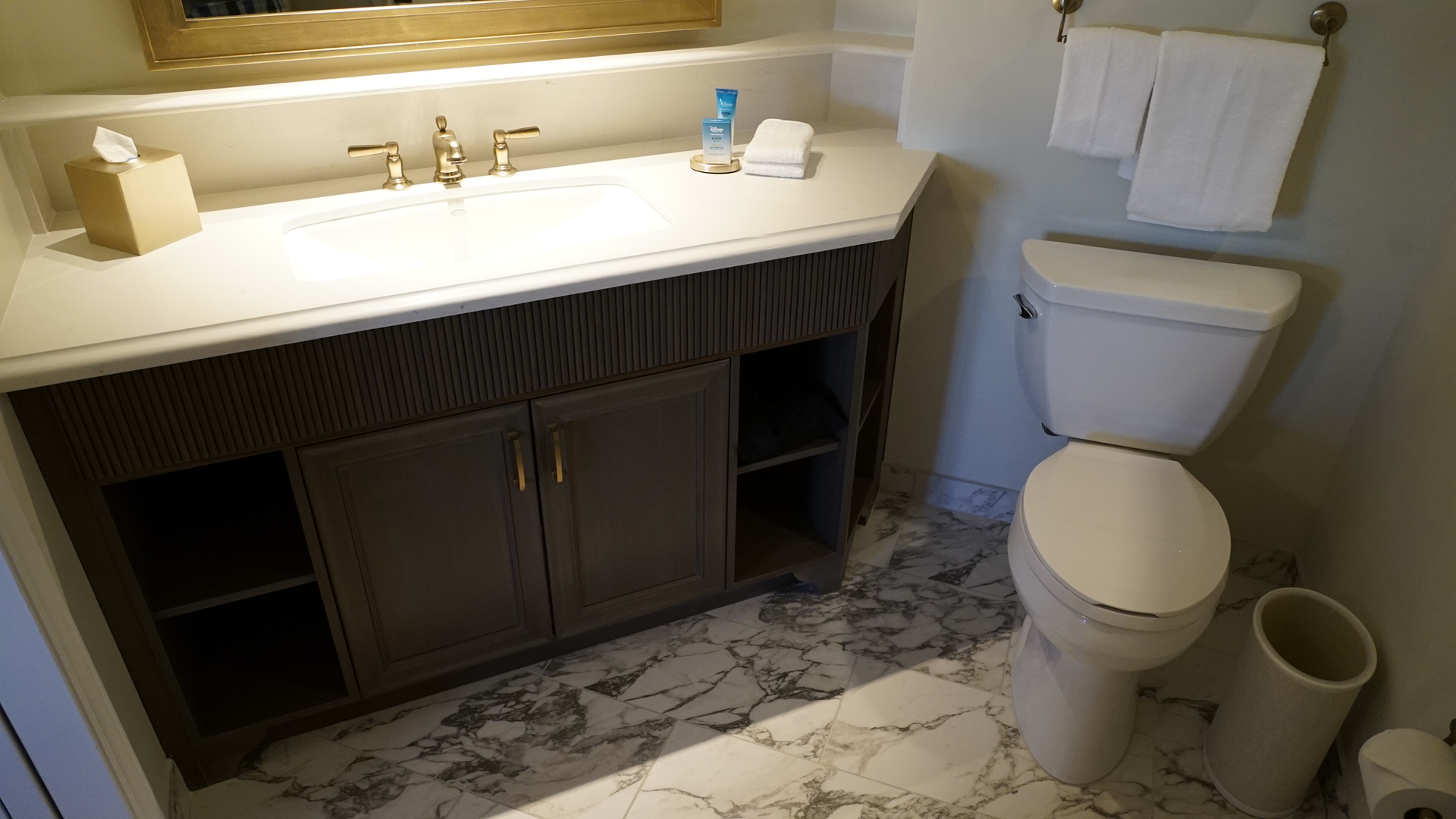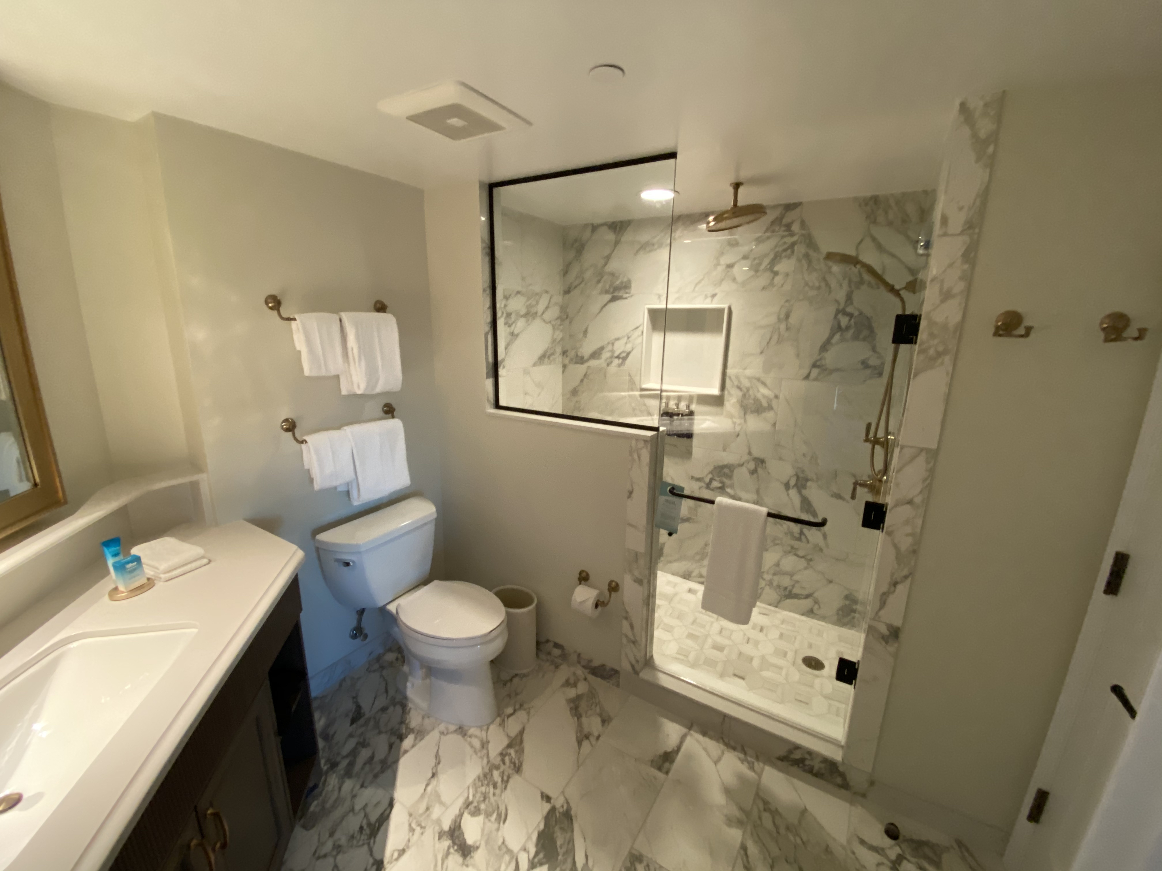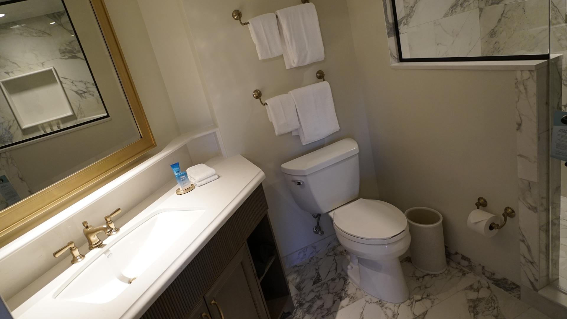 Between the gold fixtures and white marble tiles lining the floors and shower walls, the space is decidedly lavish. The shower here is almost identical to the ones in Deluxe Studios, meaning you get the same quality of bathroom here, at a slightly lower price. A closet with additional linens is off to one end of the bathroom.