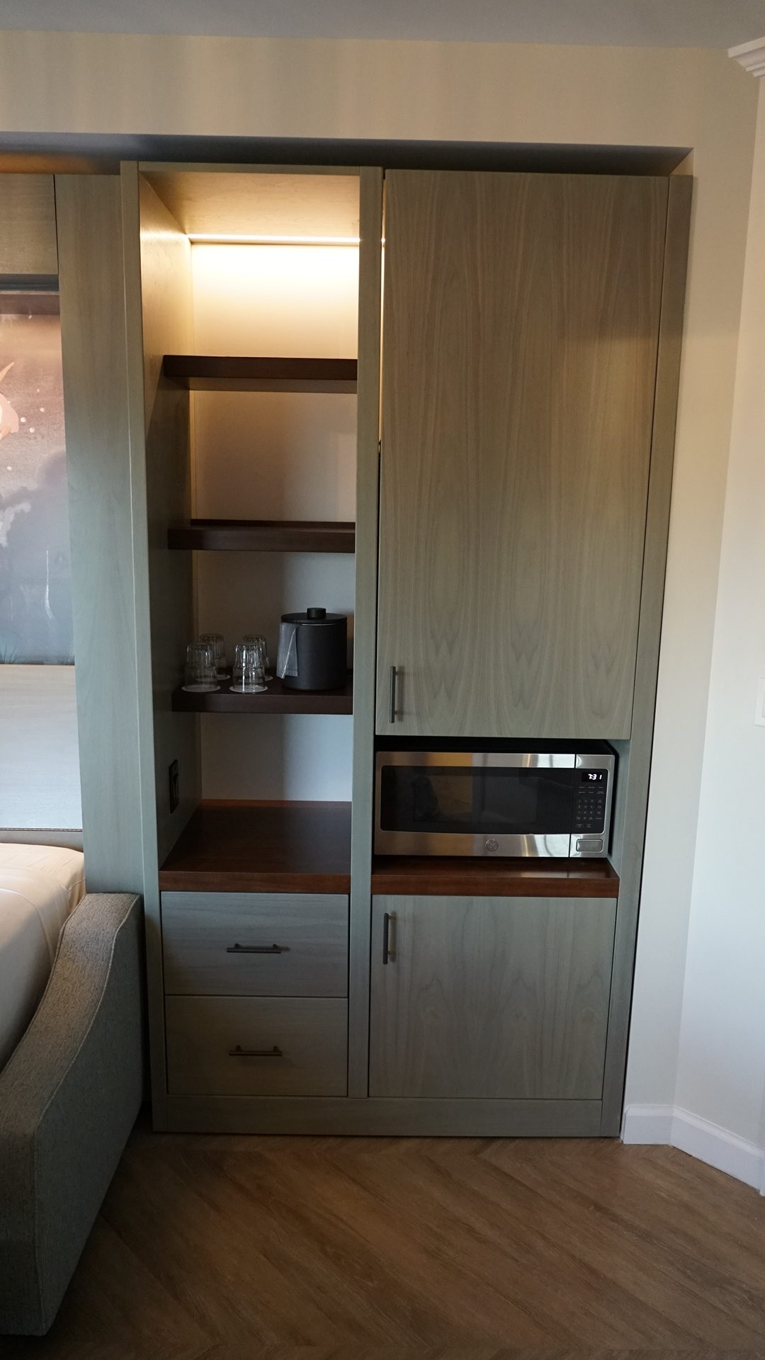 On the other side, you have a makeshift kitchen of sorts, with a stainless steel microwave and a cabinet full of mugs, plates, and silverware above it. Below it is the fridge, and off to the left are various shelves and drawers for storage. Many people have asked us what the dish washing situation is given that there is no kitchen sink. Well, the Tower Studios offer a very luxurious solution to that. Any used plates, cups, or cutlery that you’d like cleared can be picked up by housekeeping by just calling in. They’ll bring you a fresh set and take away the dirty ones regardless of whether you’re staying on cash or DVC points. (Normally, rooms booked using DVC points are not entitled to free housekeeping services, so this is a big plus.)