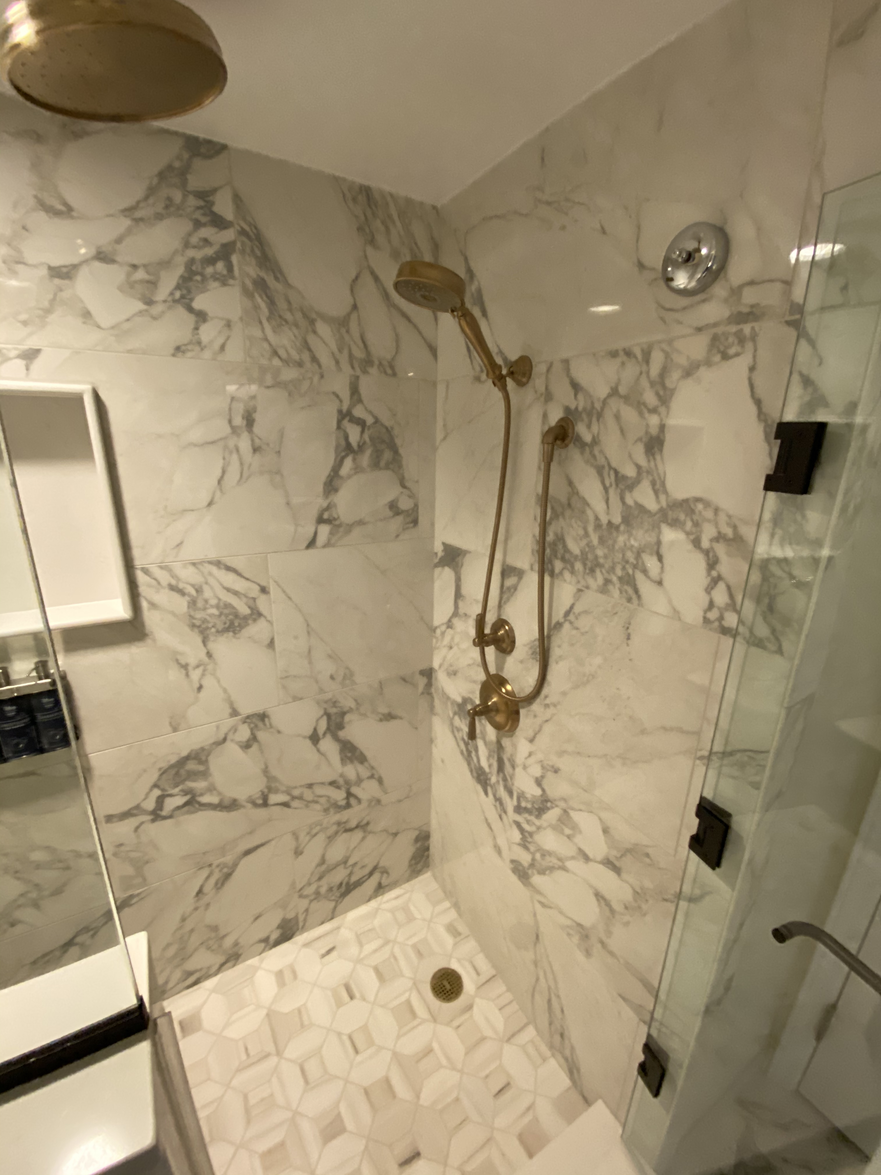 At the end of the shower is a large marble slab to sit on or use as a shaving ledge. A nook for additional toiletries is built in to the wall.