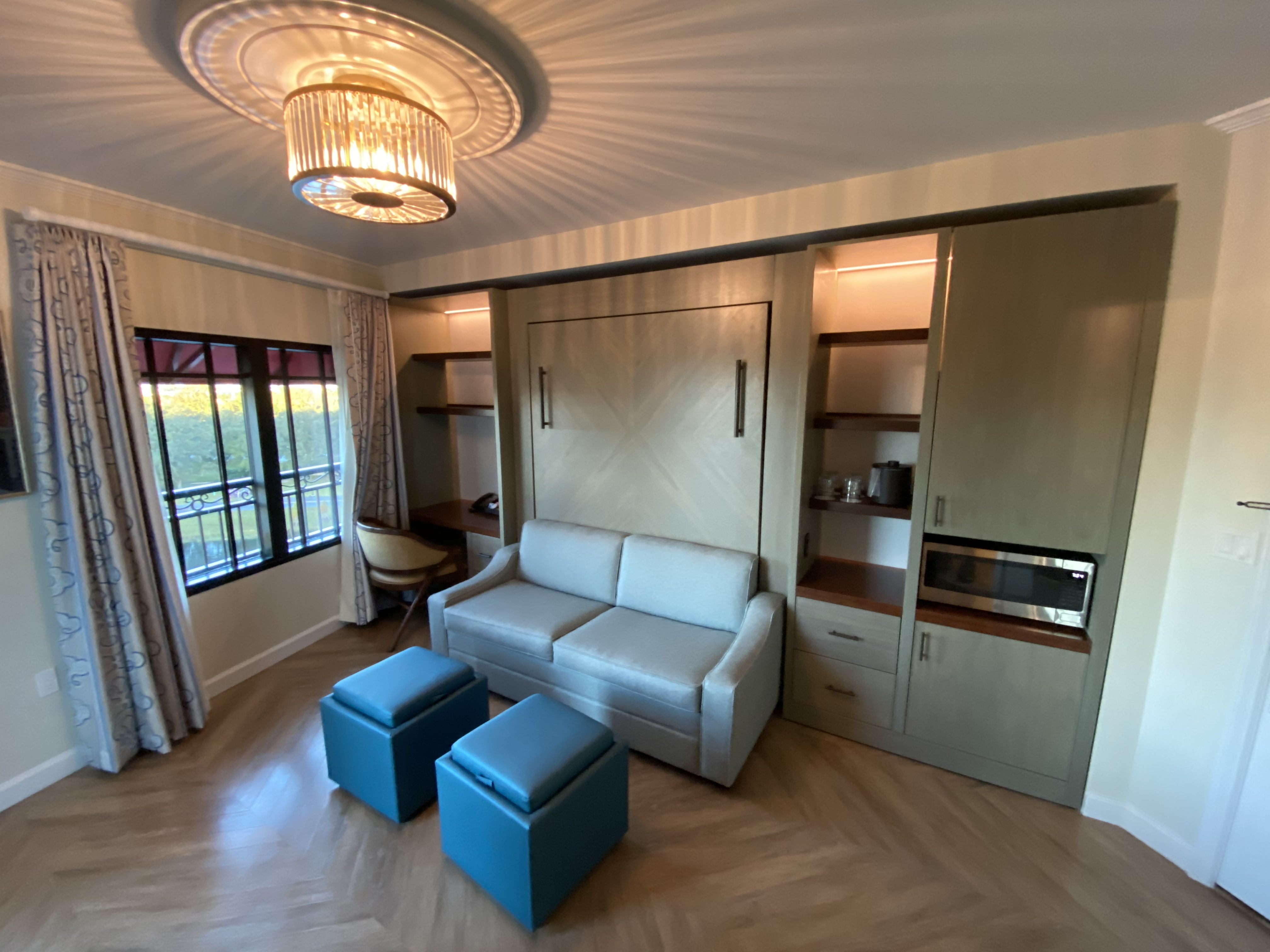 Welcome to the new Disney’s Riviera Resort! After a full weekend of coverage, we are taking time to reflect on our experiences at this new location on property. You’ve probably read one of our numerous food reviews from the resort, which boasts an incredible lineup of Fast Casual, Signature, and Character Dining, but if you’re looking to actually stay and fully experience the new resort, you’ll probably want to take an in-depth look at accommodations. This review will cover one of the resort’s biggest draws: the innovative new Tower Studio concept. Compact and meant for just one or two guests, these tiny studios morph from day to night with a large Murphy bed that lowers from the wall, and clever furniture that does double duty. Let’s check in and check out these new rooms!