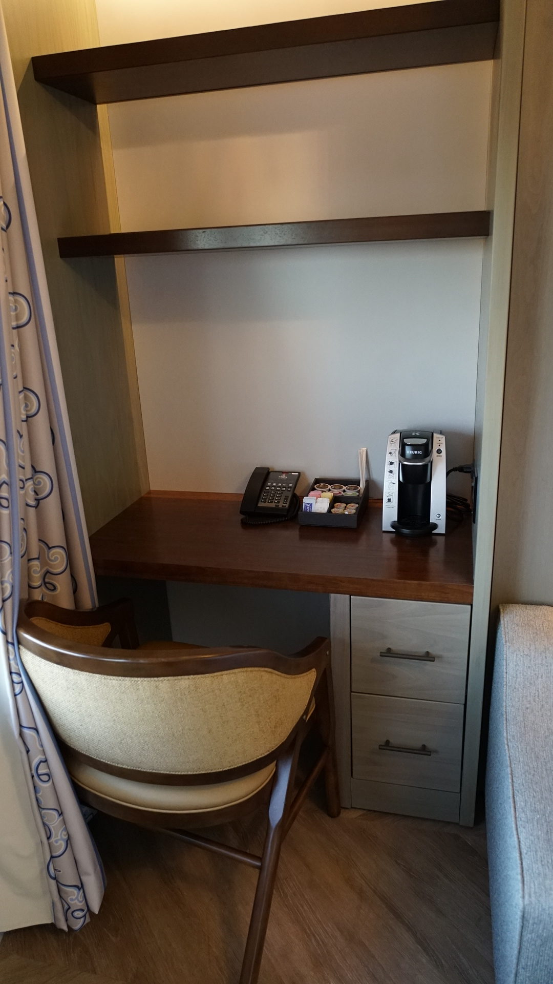 Over by the office nook, there’s a chair, a Keurig, and a phone. Drawers and ledges are available for additional storage. This resembles something more akin to a study carrel at a library, so prepare for flashbacks from college. Do note that this is the only style of room at the resort with a Keurig, as the Deluxe Studio and all of the villas have a standard coffee pot brewer.