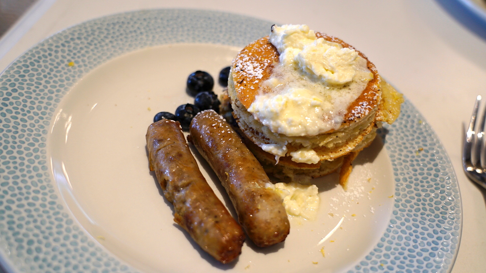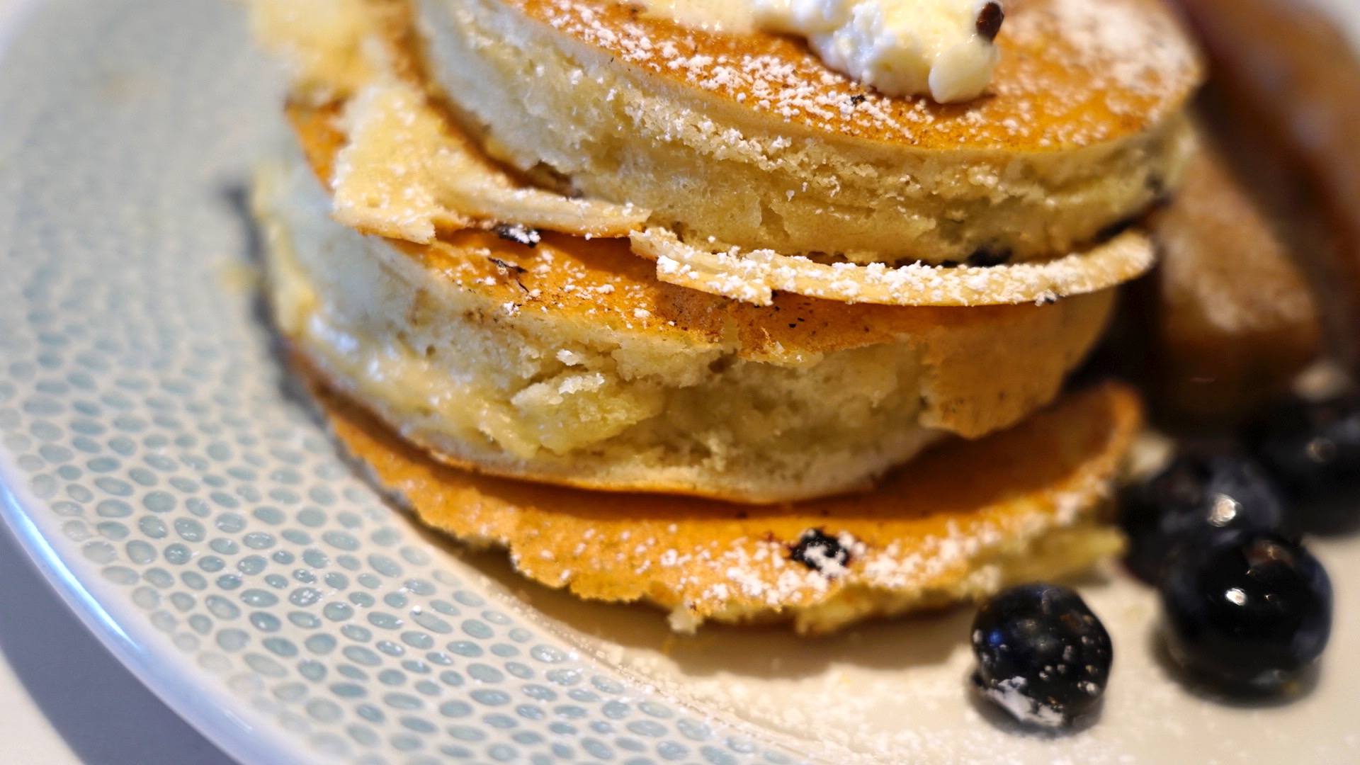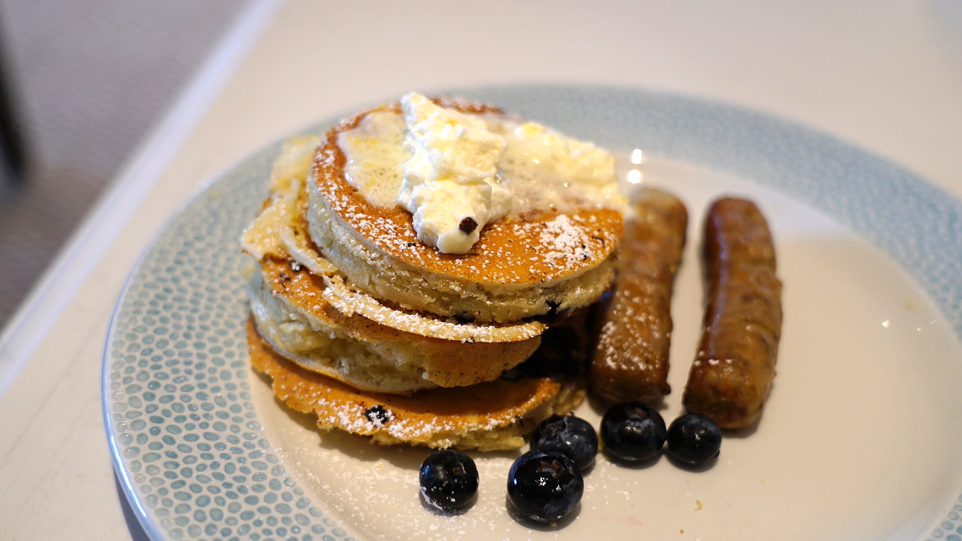 Three, Fluffy House-made Pancakes filled with fresh Blueberries topped with Mascarpone Cream and Lemon Zest served with choice of side
