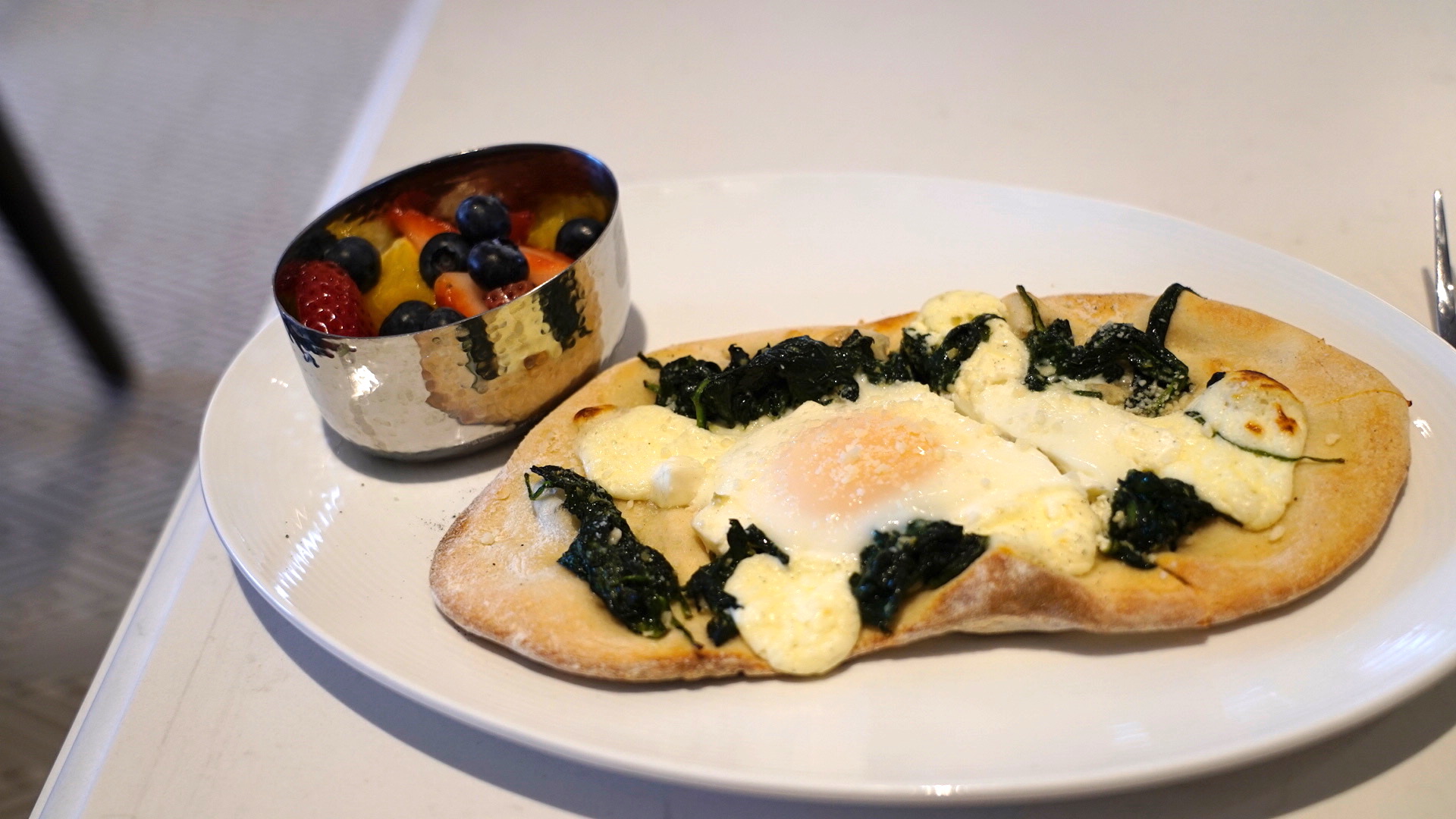 Fresh Artisan Hearth-baked Pizza topped with Ricotta, Feta, Spinach, and a Soft-cooked Egg
