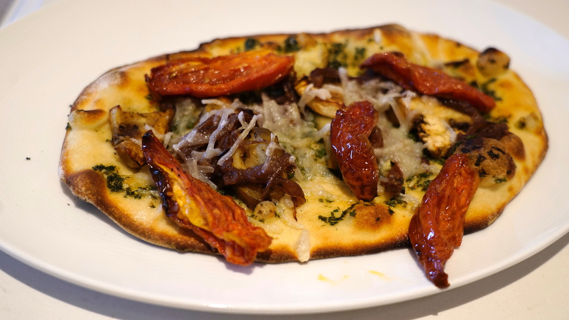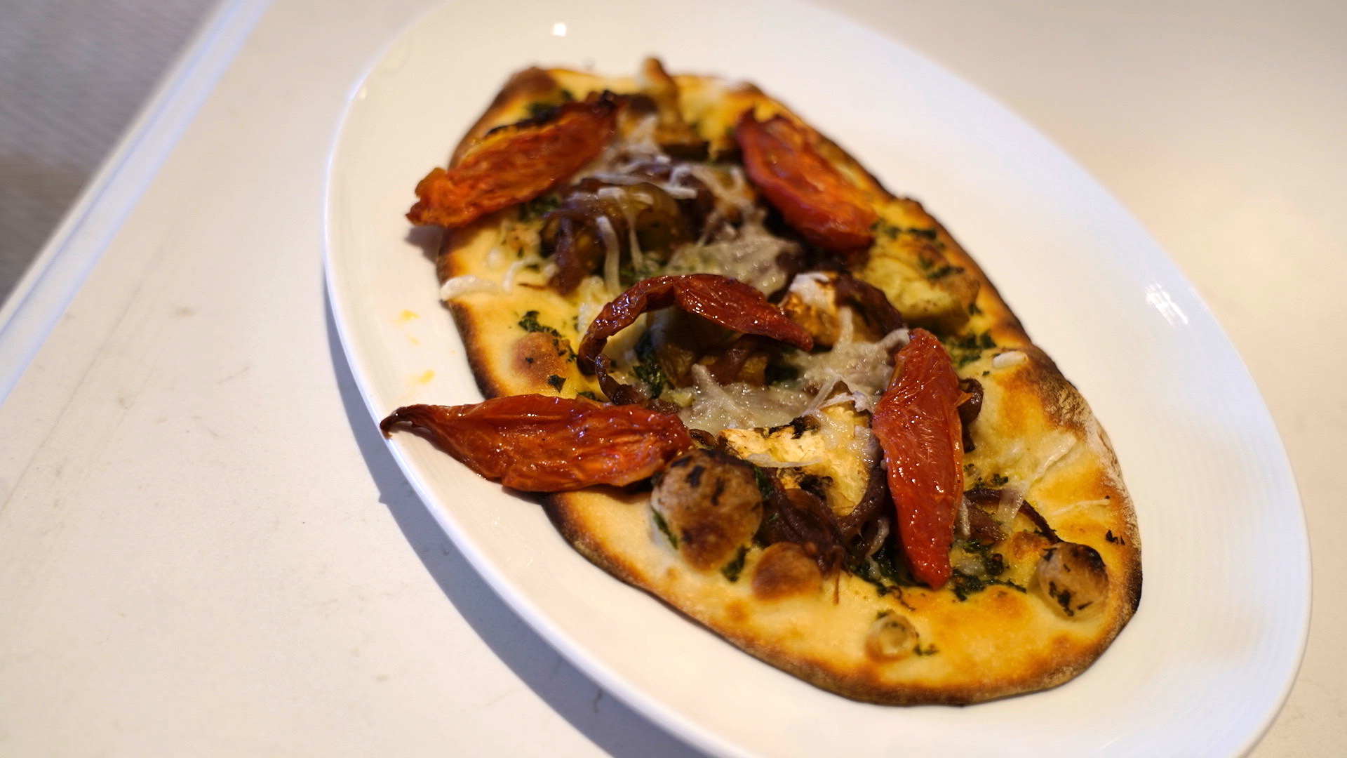 What we have here is a free-form pizza crust baked to a crisp on a hearth oven (you’ll know because of the slightly burnt bottom.) It’s topped with dollops of fresh cheeses like ricotta and feta, plus some spinach. While this looked amazing, it tasted somewhat plain, almost like it needed salt… unless you got a full cheese chunk in your bite, then it was all kinds of delicious. While this is eons better than any quick service pizza you’ve had anywhere else on property, it still suffers from a lack of toppings to the edge.