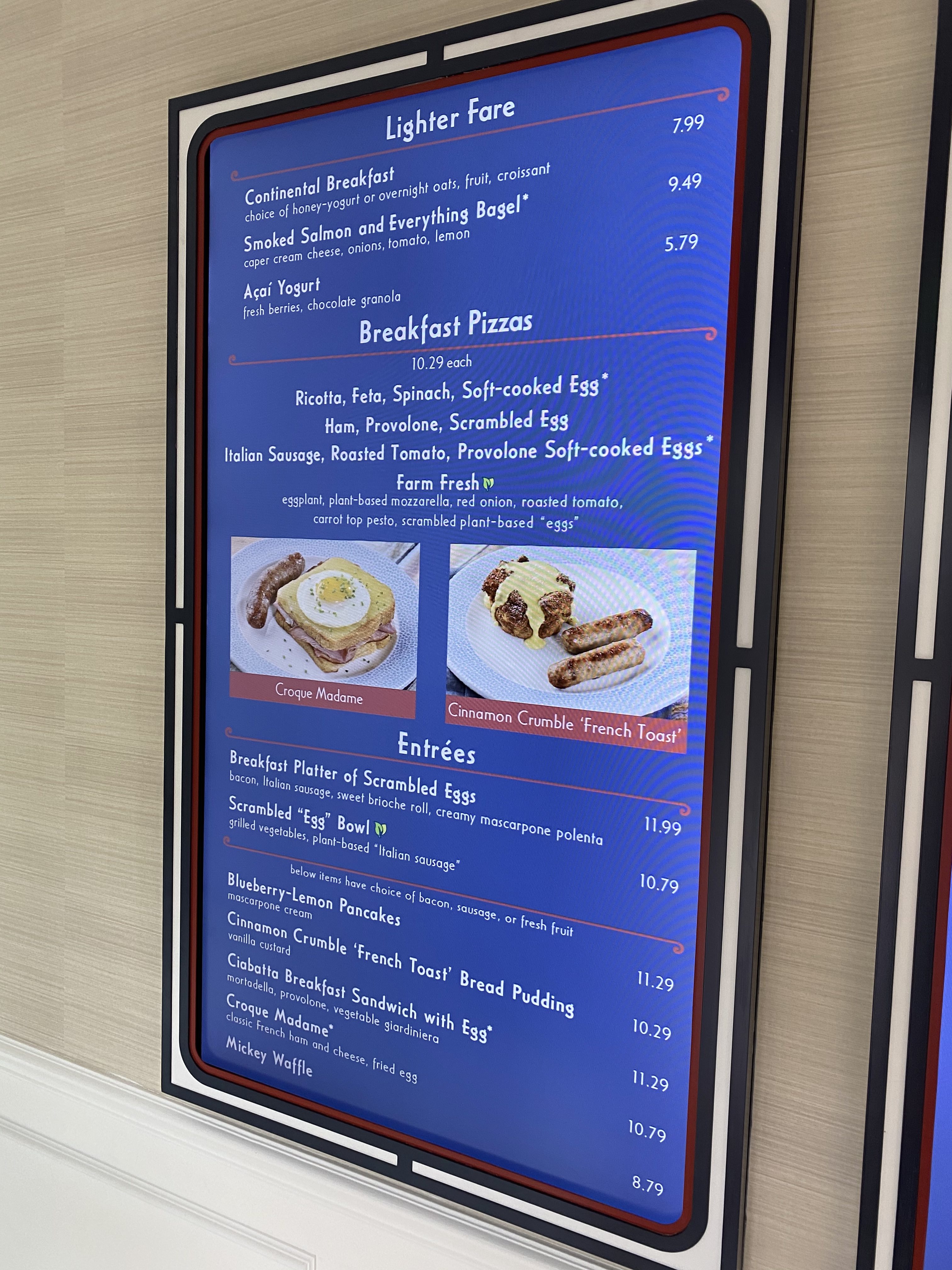 All of these dishes have warnings due to dangers of raw egg… me, I’m overjoyed to see a proper soft-cooked egg with a runny yolk at a Disney restaurant, especially a counter service! (I remember being excited about the poached eggs at Be Our Guest only to realized that they were fully cooked through.)