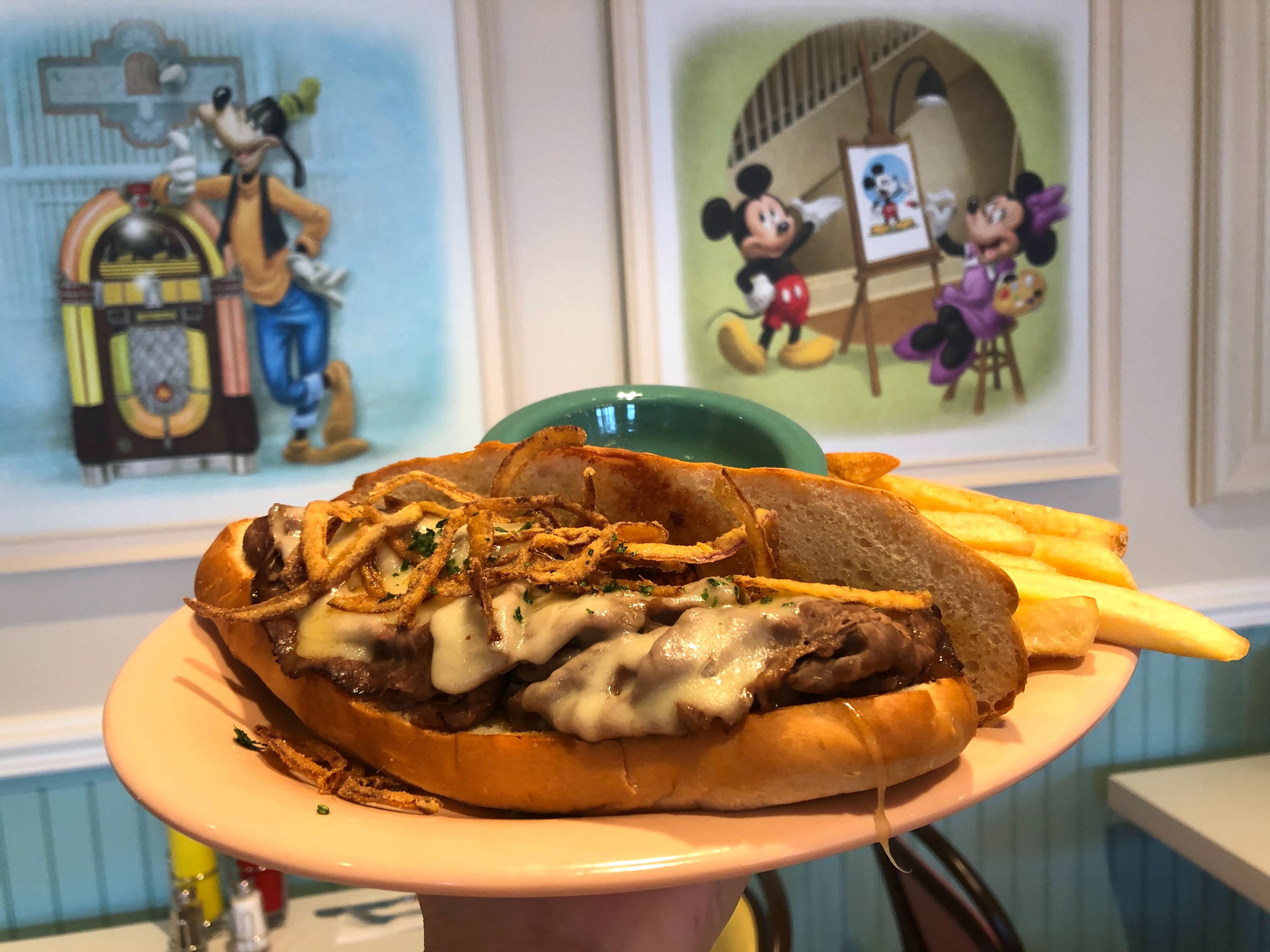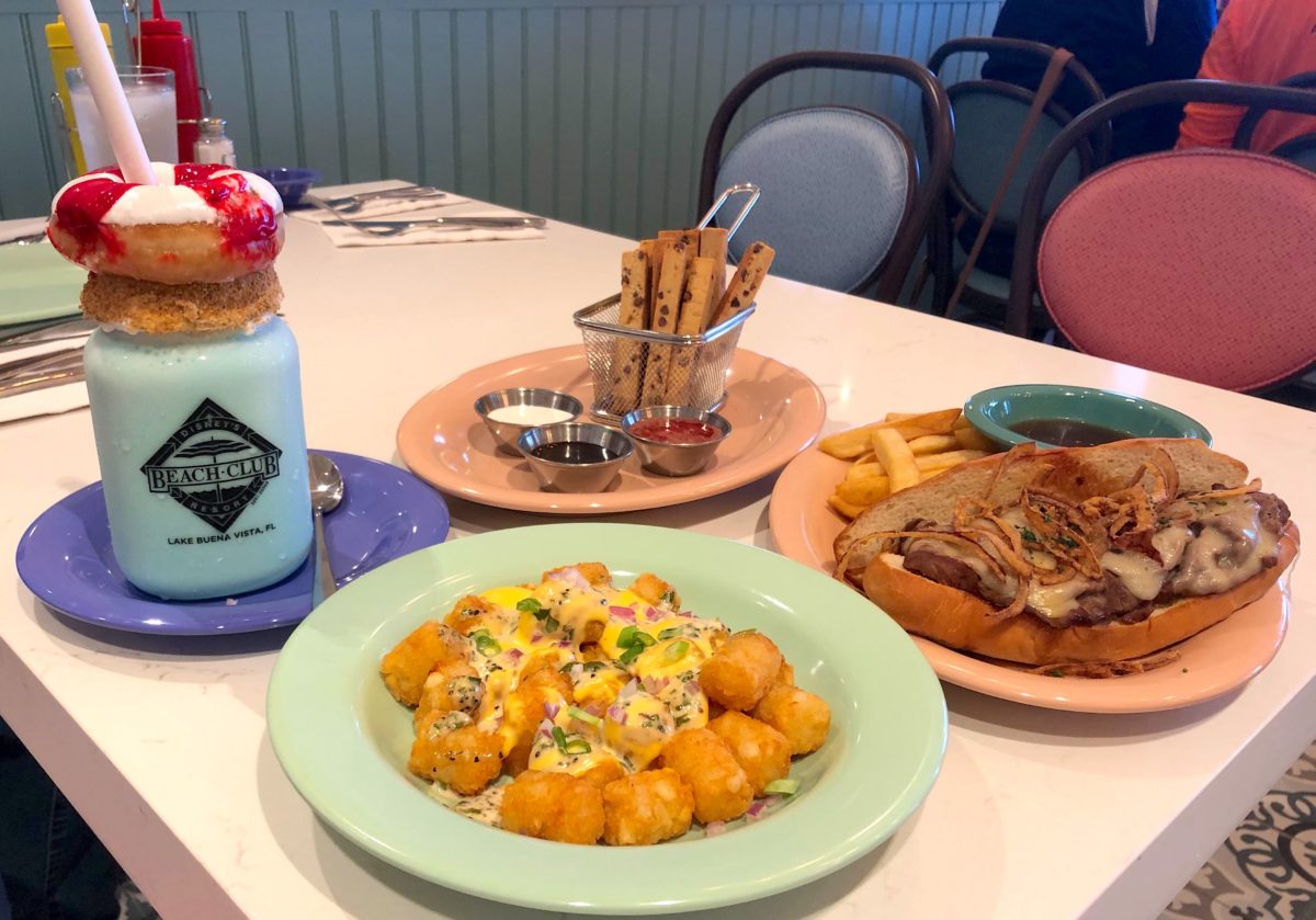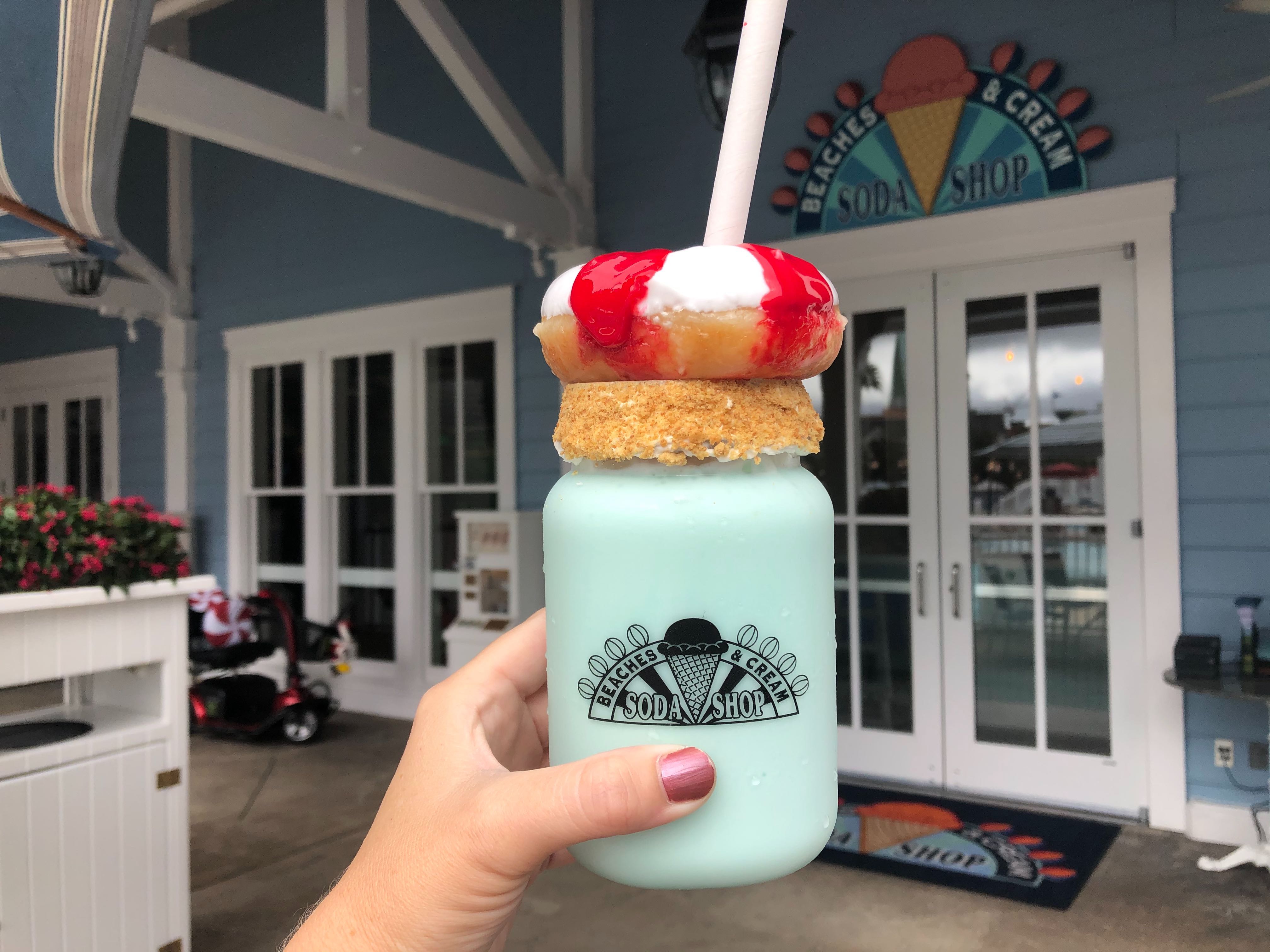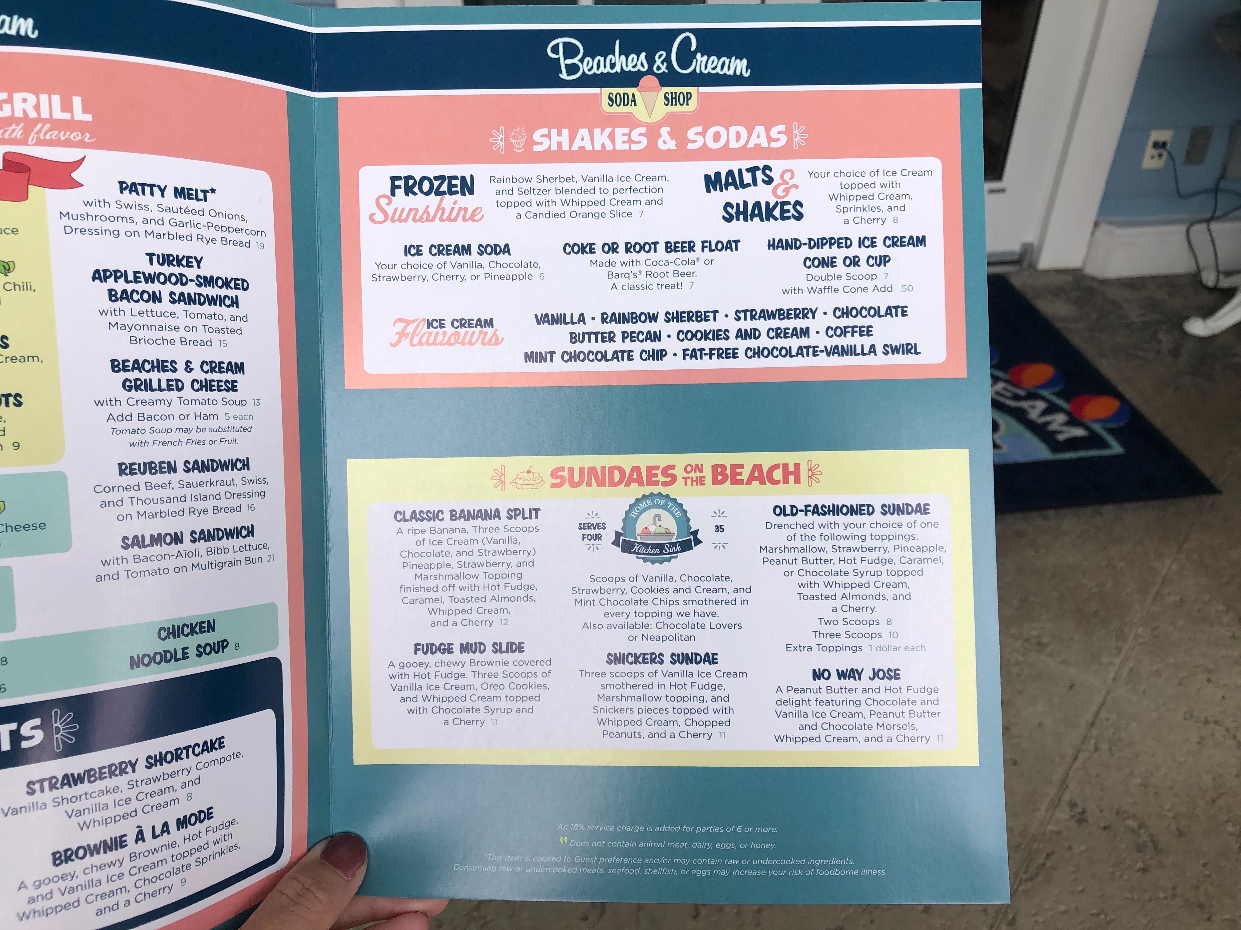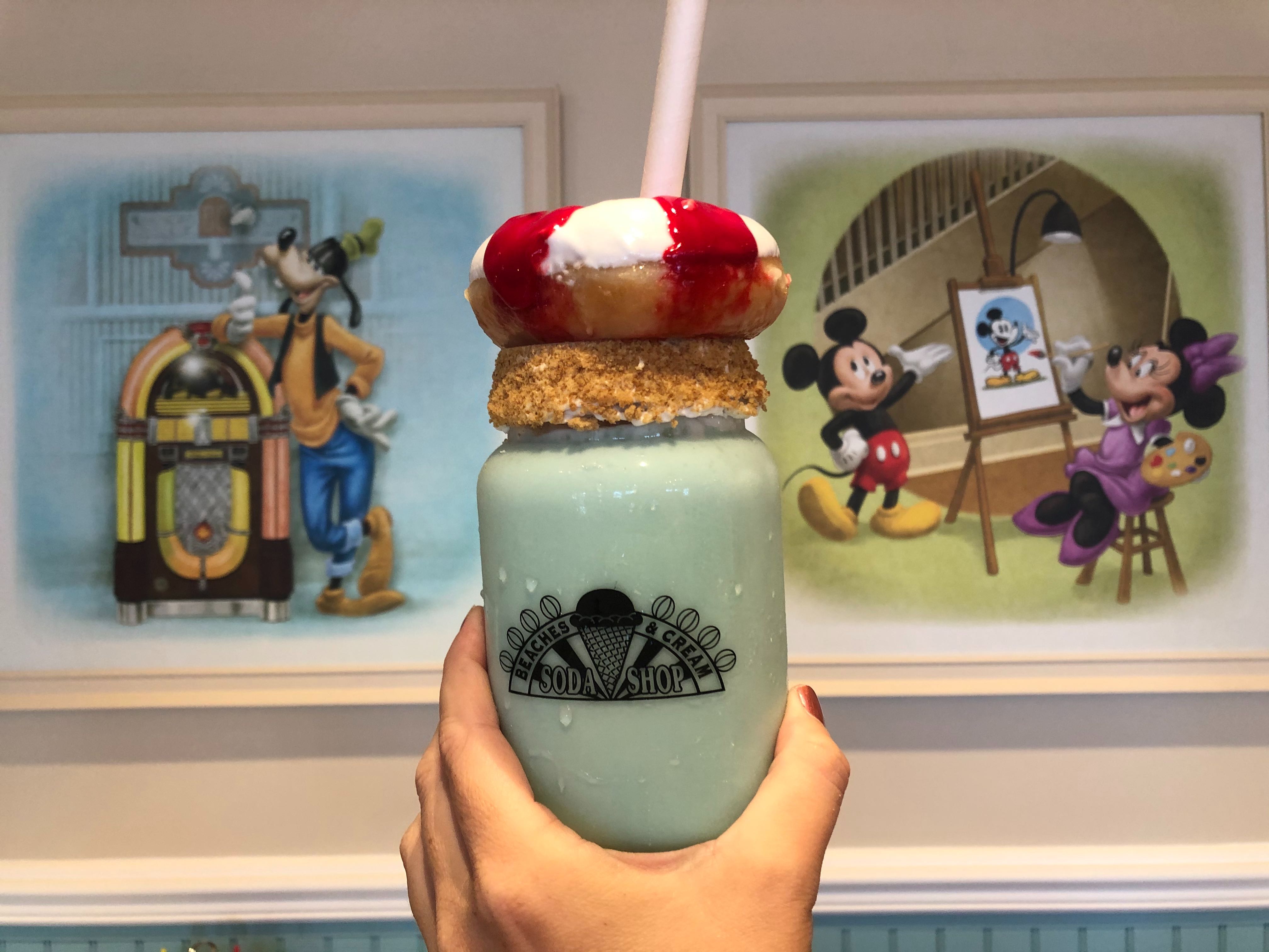 We’re at Beaches & Cream Soda Shop in Disney’s Beach Club Resort to celebrate its official reopening after an extensive refurbishment. You’ve seen the menus. You’ve seen the new character-inspired interior. Now it’s time to do what we do best: eat! So sound the Kitchen Sink alarms (just kidding, we’re not getting a Kitchen Sink), because we’re about to dig in on some retro-classic snacks-–with a twist.