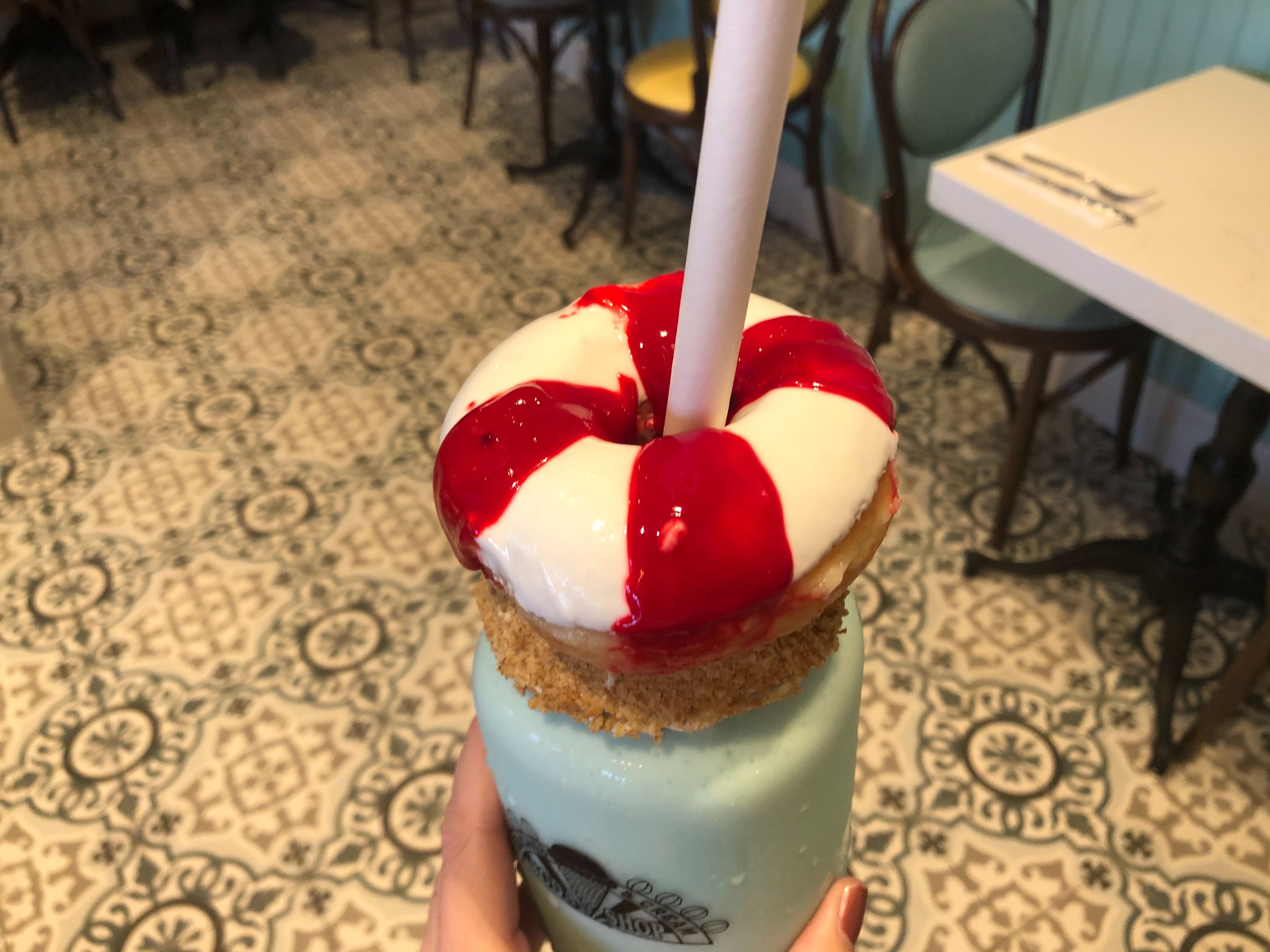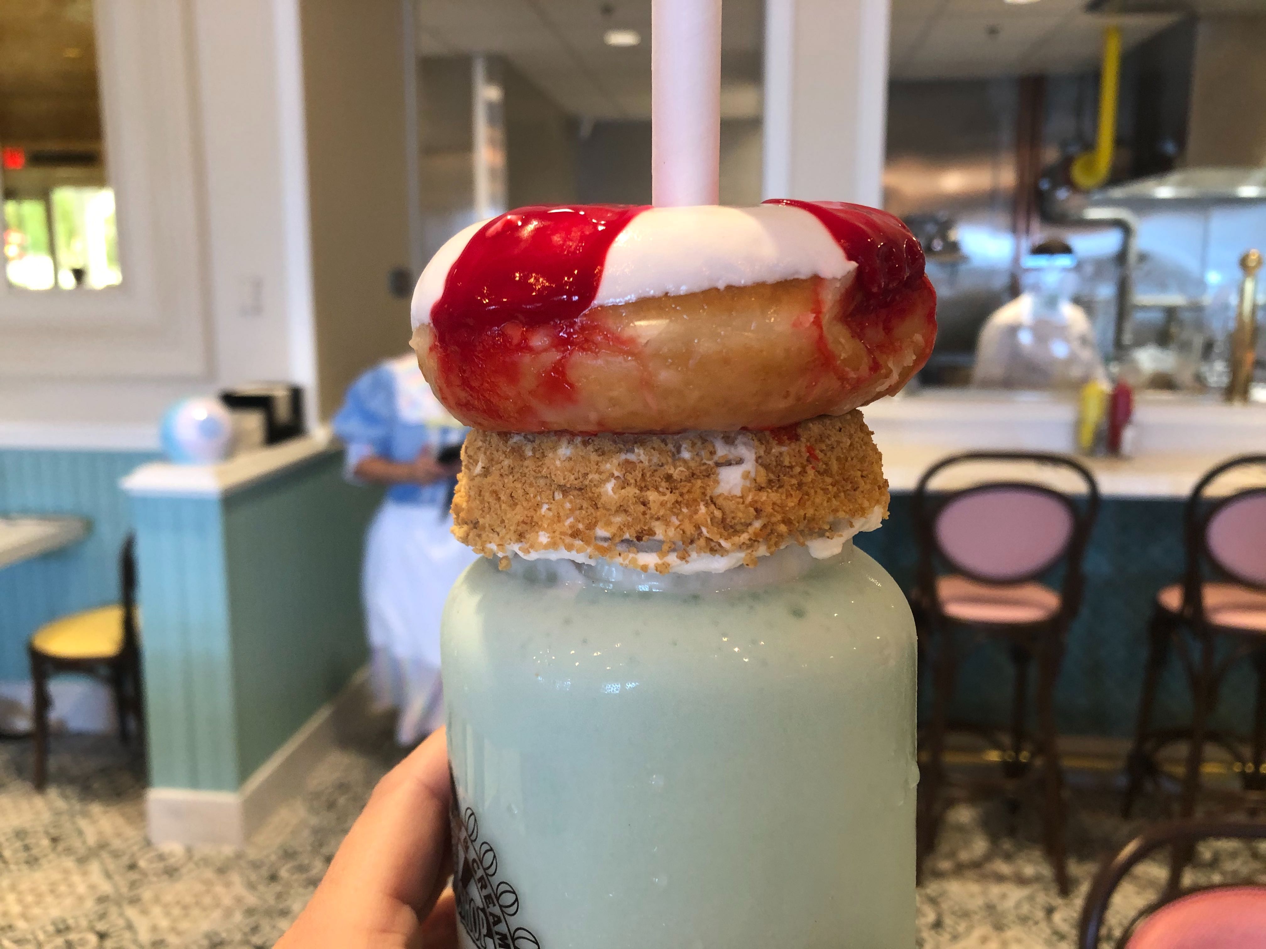 The shake is labeled as cotton candy-flavored, but it tastes a bit like marshmallow. We loved it. It tasted like liquid Lucky Charms! It’s very creamy and smooth, and perfect for sipping while lounging at the pool. While the drink might not be sweet, the donut on top makes up for it. A glazed donut is decorated with white and red icing to give it the appearance of a pool life preserver.