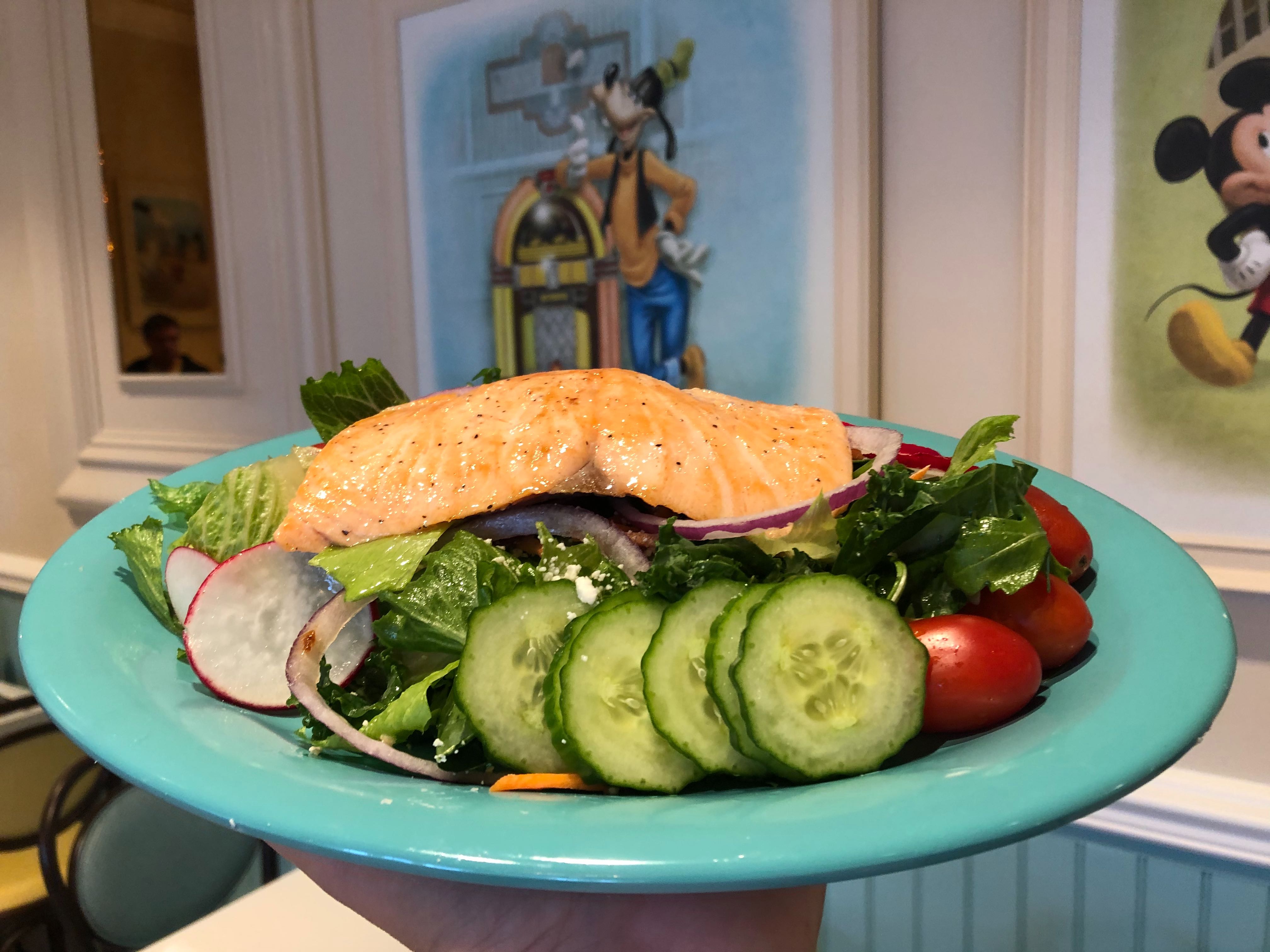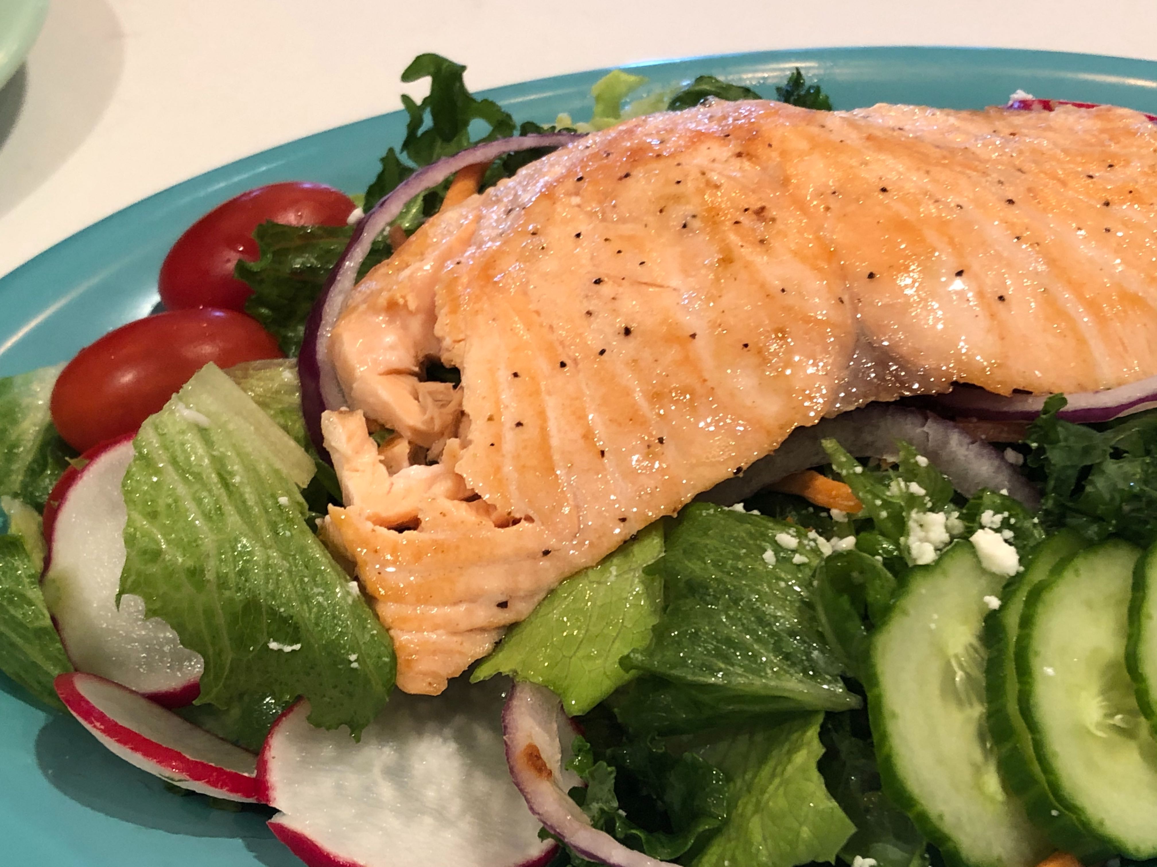 The salad comes topped with your choice of salmon or chicken for an additional cost.