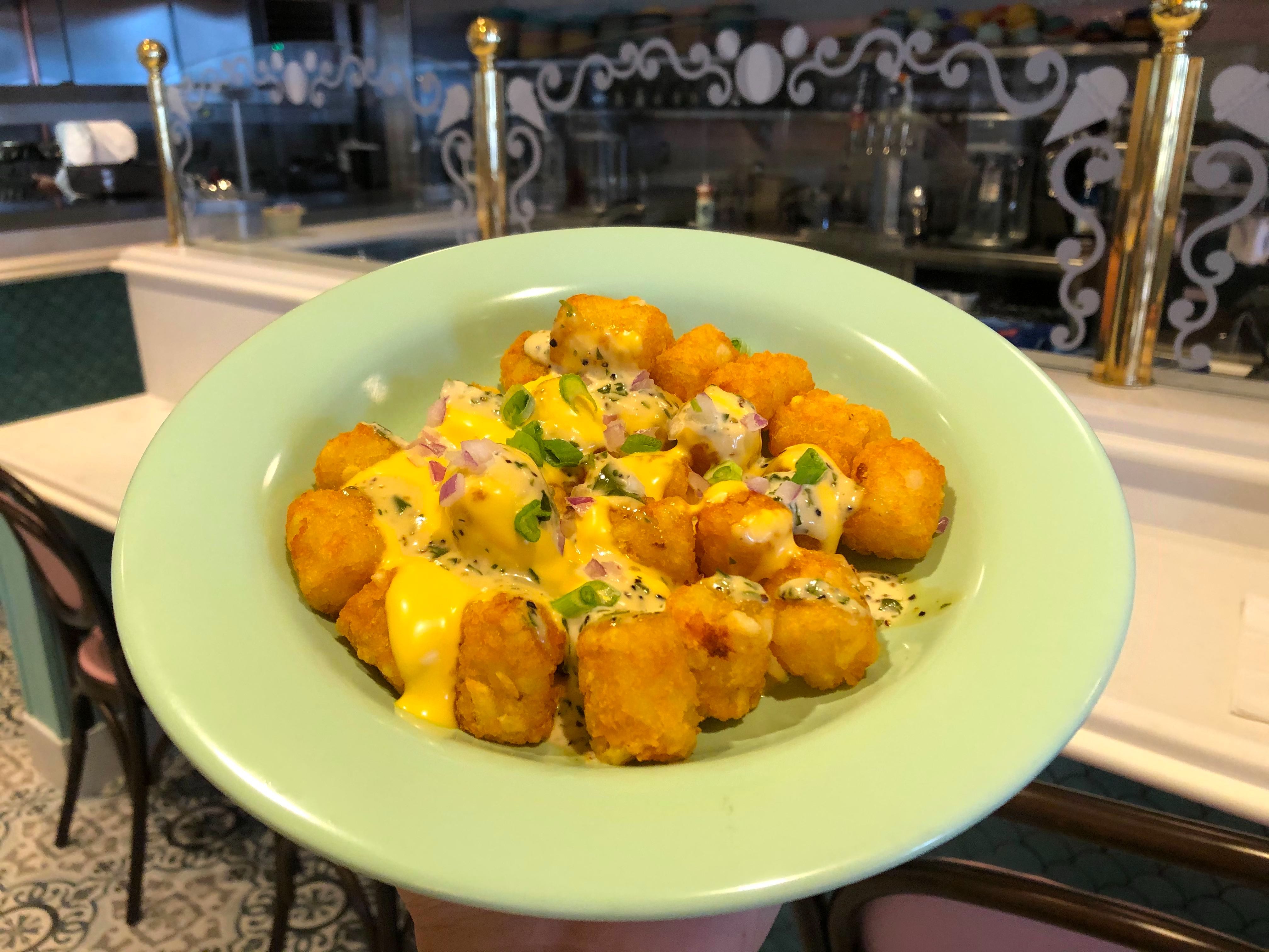The tots are nice and crispy with a layer of creamy cheese sauce. The sauce has a rich flavor, but not an overpowering cheese flavor like the liquid cheese in the parks. It’s topped with purple onions and scallions, which add a nice extra kick.
