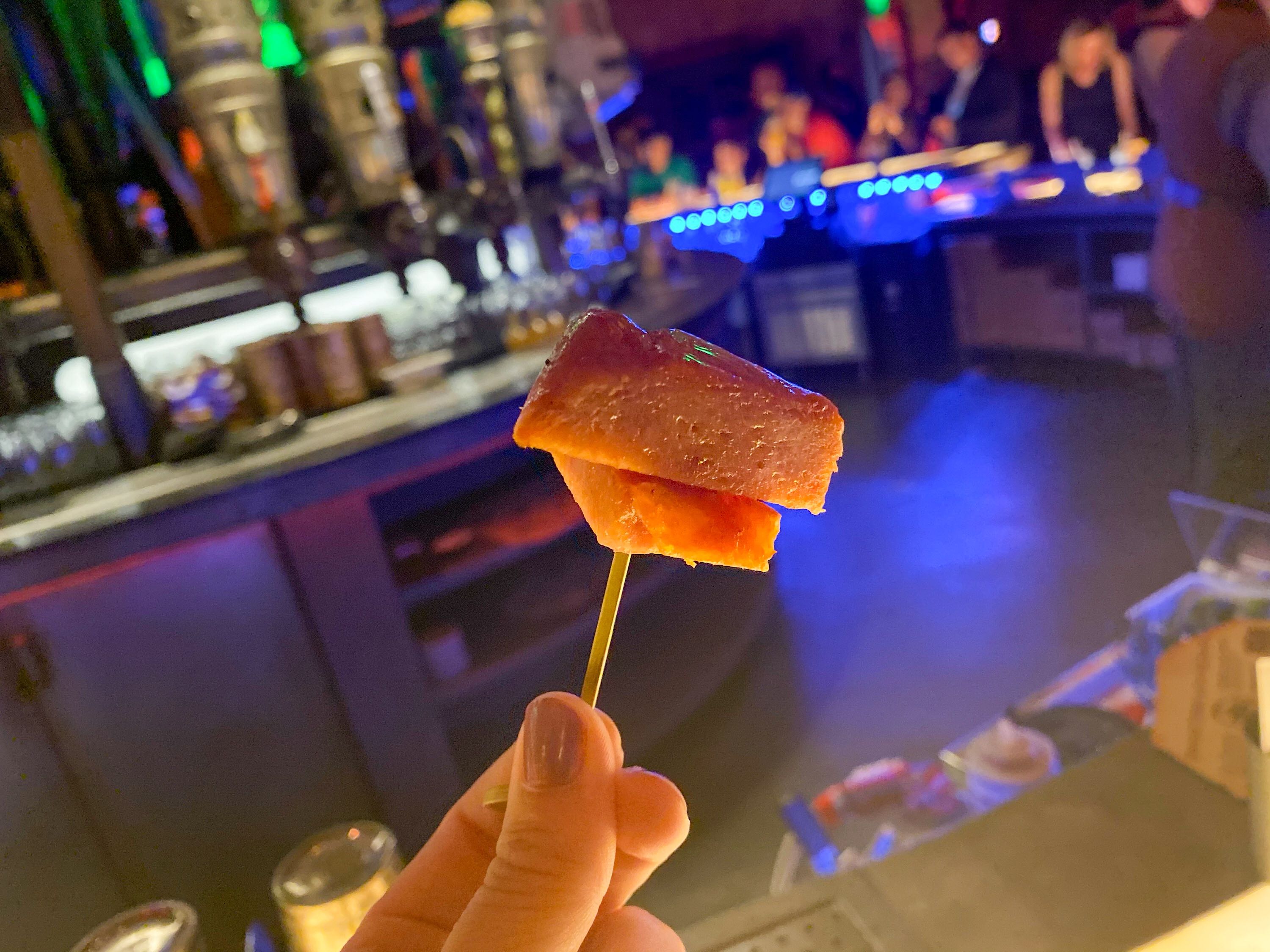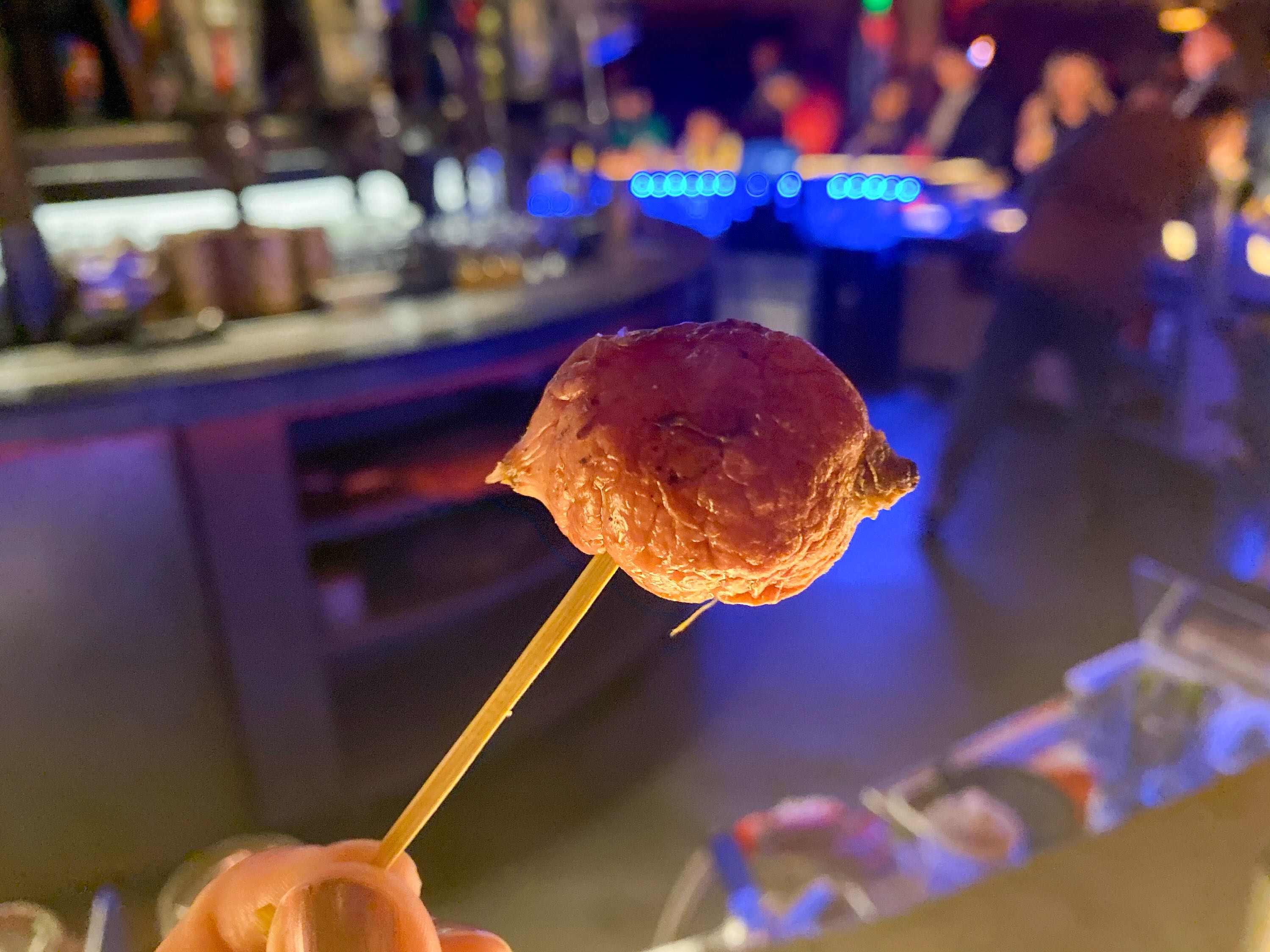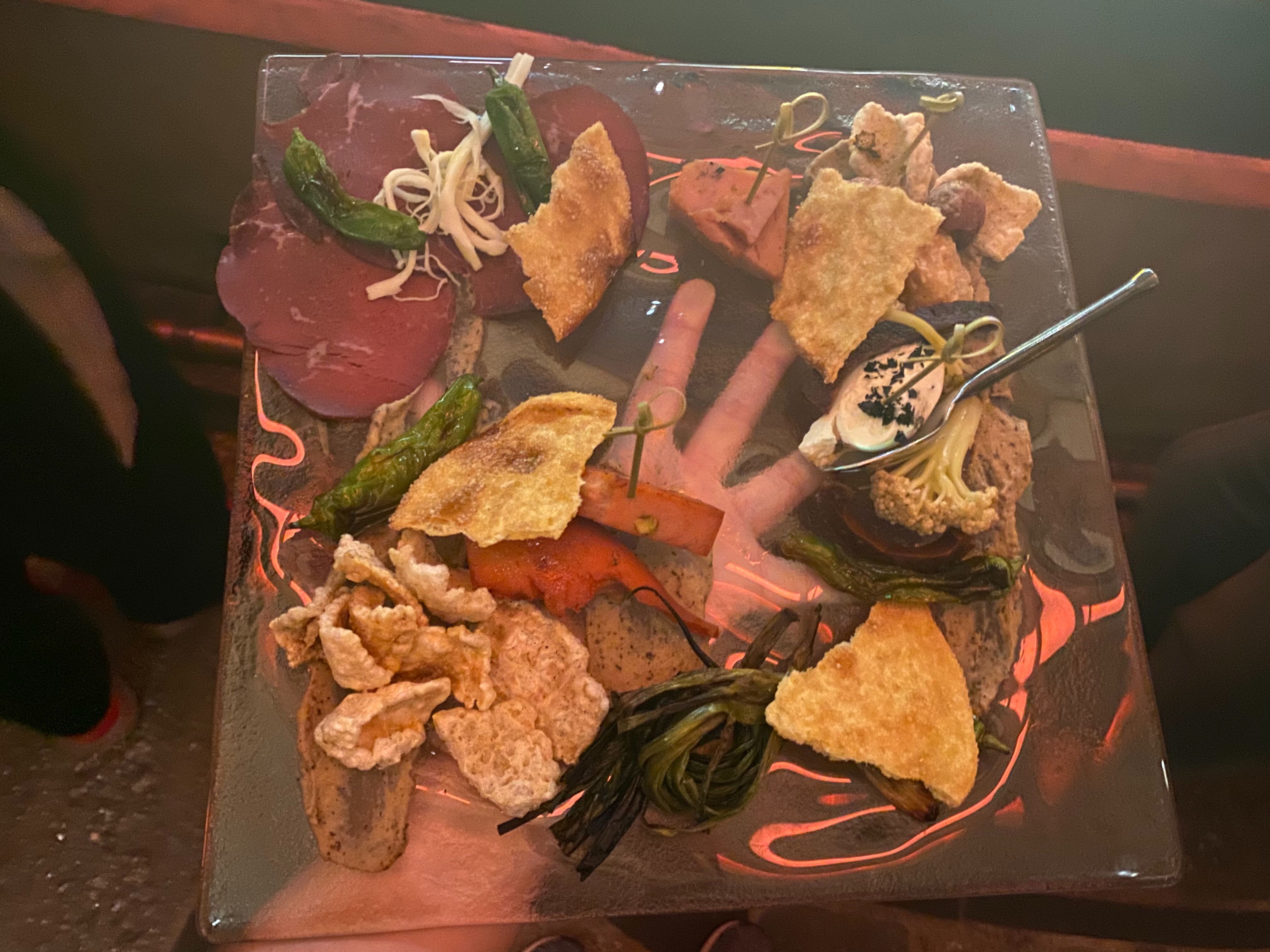 The pork rinds and crispy chips were another favorite part of the Happabore Sampler. The chips tasted like cinnamon and sugar, but we were told the sweetness came from olive oil and orange. We’re not sure if this might have been a mistake, but however they get their sweetness, they’re one of the highlights of the tray. There is a wide range of flavor profiles here, from the sweet chips to the pickled vegetables. It’s a great option for adventurous travelers.