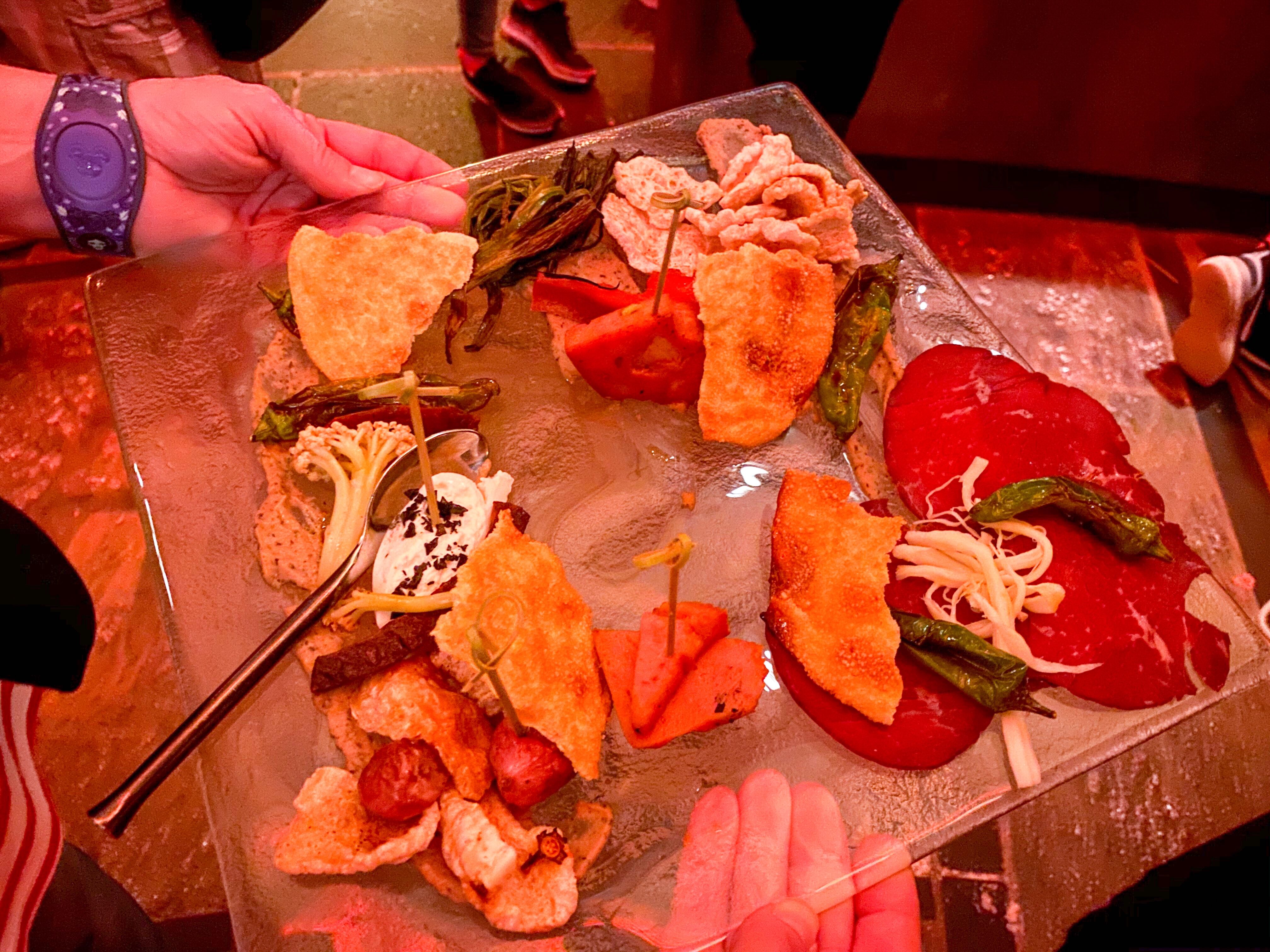 The Happabore Sampler here at Walt Disney World is a selection of cured and roasted meats, cheese, and pork cracklings. A similar version was tested earlier this year, but was plated and presented a little differently. We’ve noticed a lot of similarities, as well as a few differences.