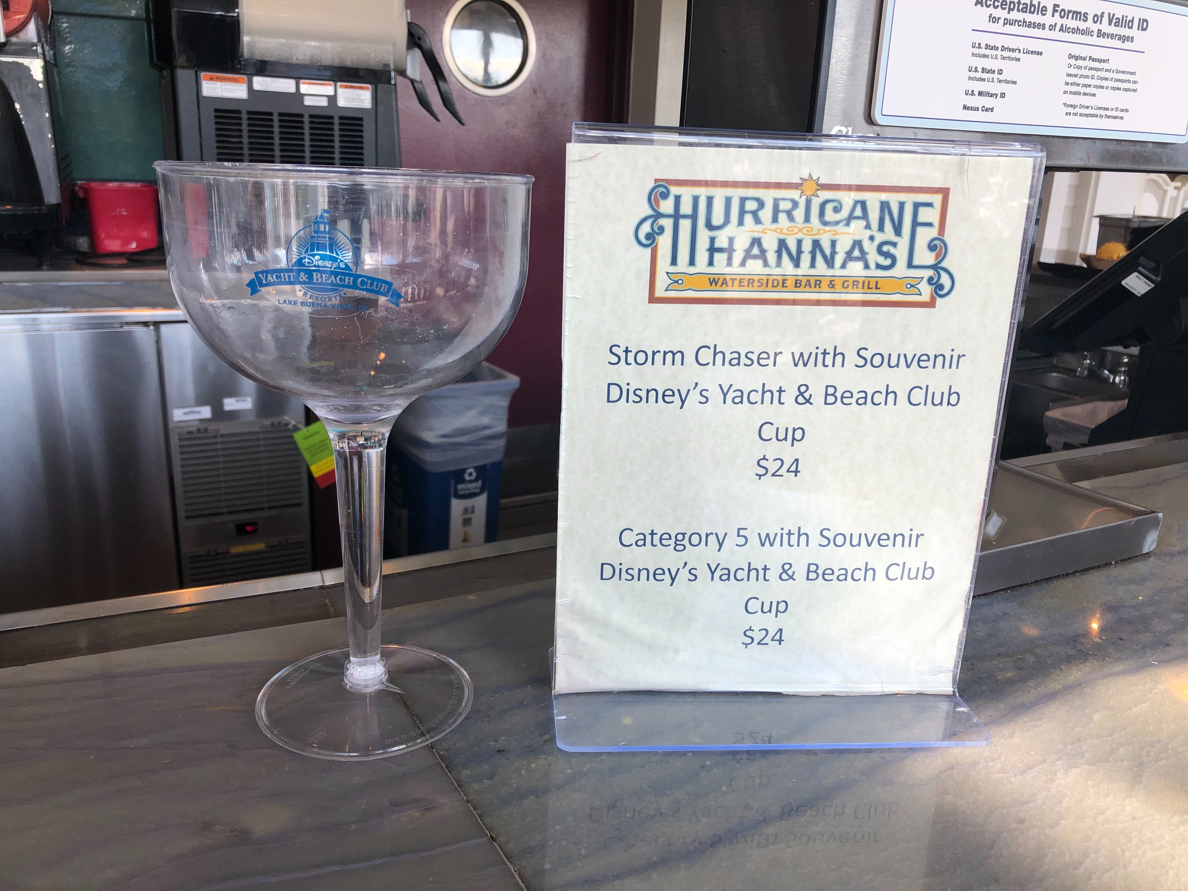 It’s five o’clock somewhere, and we’re here at Disney’s Yacht Club Resort today for a quick stop into Hurricane Hanna’s Waterside Bar and Grill. A brand new souvenir glass is now available with your choice of two specialty beverages and it’s massive. We can’t wait to try this one!