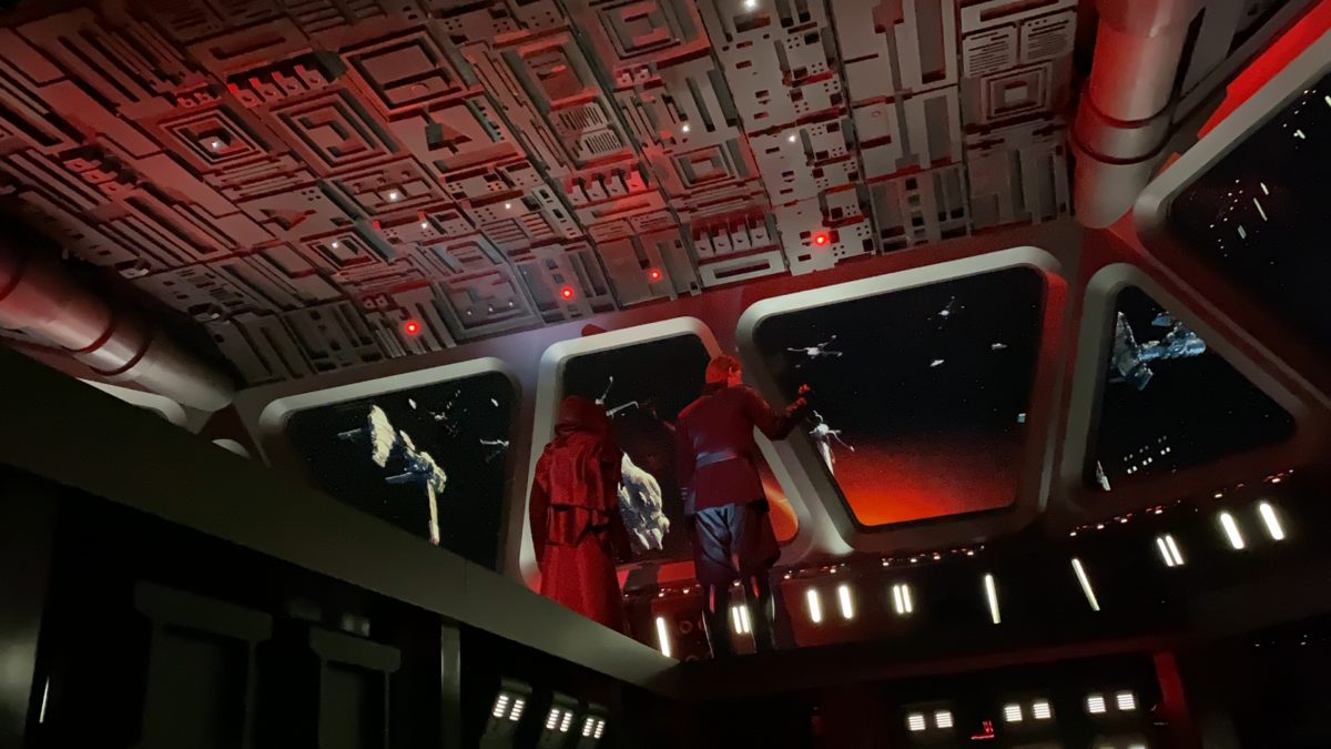 If the second audio-animatronic is down, riders see a TIE Fighter attack scene take place through the windows. Kylo then makes an appearance on the screen aboard his own TIE variant, threatening riders of their imminent demise… before ultimately getting thwarted in a similar fashion. However, no such B-mode is available for the first Kylo Ren audio-animatronic (which is sad, because he’s much more impressive.) If the AA is down, it simply slumps motionlessly, despite riders hearing his dialogue.